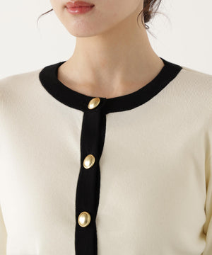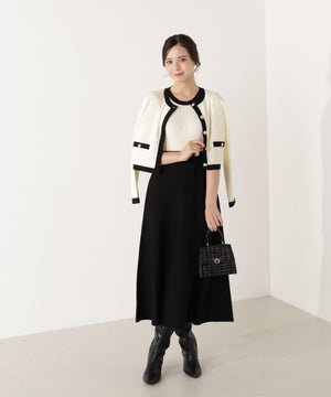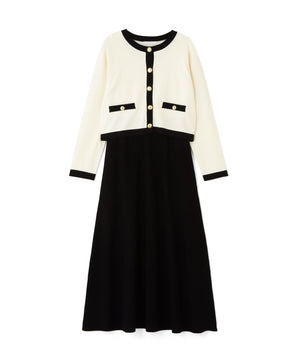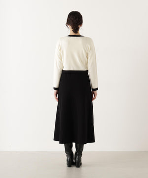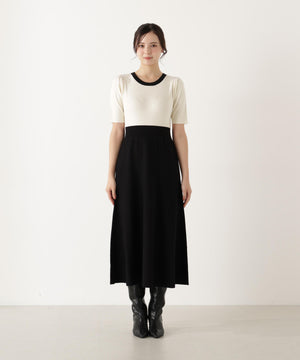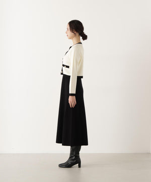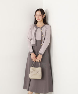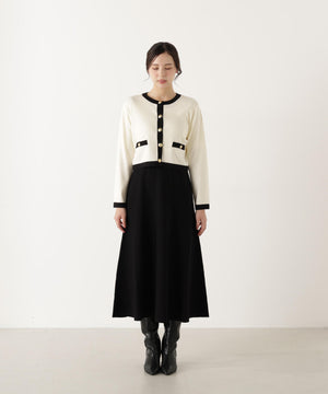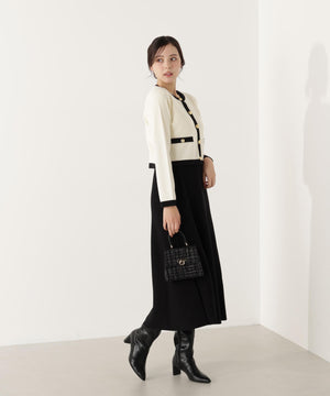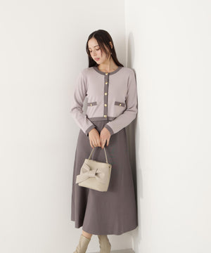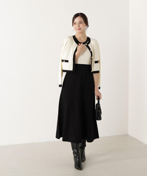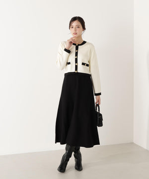 配色が引き立ちコーディネートを華やげるニットセットアップです。単品使いもできるカーディガンは、きらっと釦とバイカラーがアクセント。ニットワンピースは、ウエストから裾にかけて広がる女性らしいシルエット。五分袖なので秋から春にかけて長く着用いただけます。
