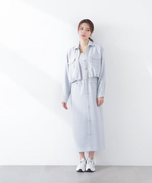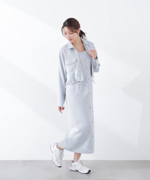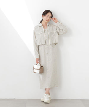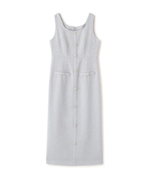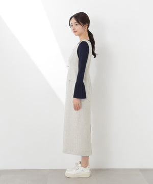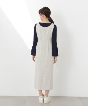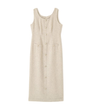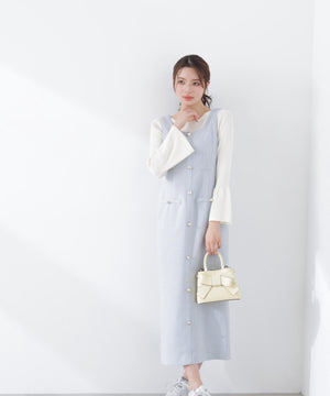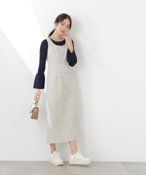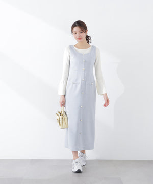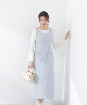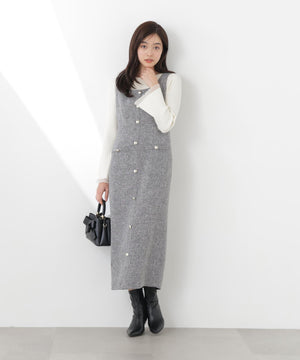 フロントの飾りボタンが可愛く引き立つジャンパースカート。スプリングツイード素材を使用、同素材のブルゾンとのセットアップもおすすめです。後ろはセンターベンツスリット入り。程よいサイズ感でインナーを重ねても、一枚でさらっと着てもおしゃれに決まります。