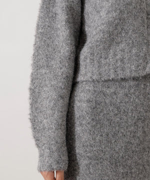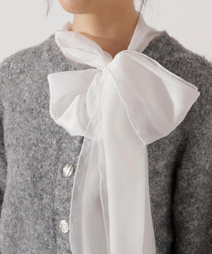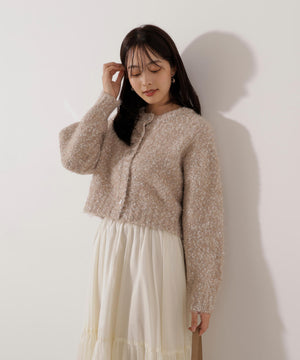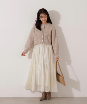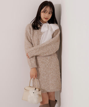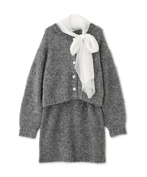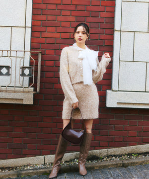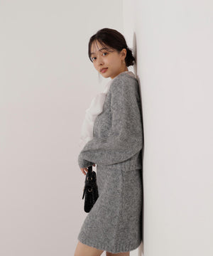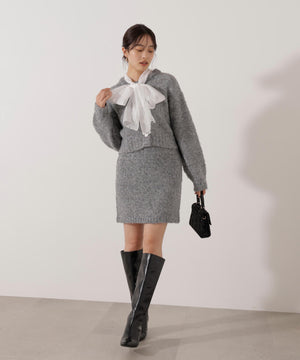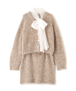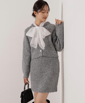 ミックス調のウォーム感とキラキラの糸を組み合わせた大人かわいいニットSETUP。カーディガンは取り外しできるボウタイリボン付き。ボウタイリボンを取ると、シンプルなカーディガンとしても使えるのでコーディネートの幅が広がります。ボウタイリボンは左に寄せてつけるとアクセントになっておすすめ。ミニスカートはすっきりシルエットで脚長効果を期待。寒い季節に映える2点セットです。