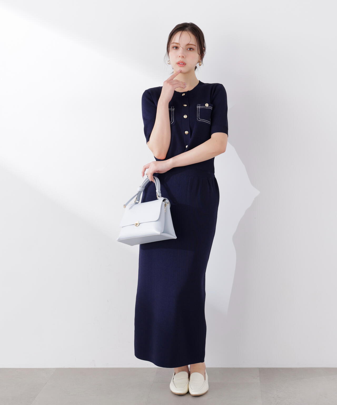 ステッチ刺しゅうがアクセントの半袖ニットカーディガンと、ナローシルエットのニットスカートの上品セットアップ。カーディガンはきらりと光るメタルボタンがクラシカルで大人可愛い印象を演出。スカートは後ろスリット入りで歩きやすくなっています。単品使いもでき、デートやお出かけ、オフィスシーンにも活躍してくれます。