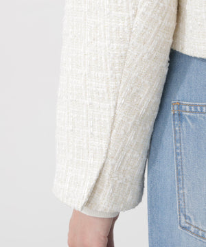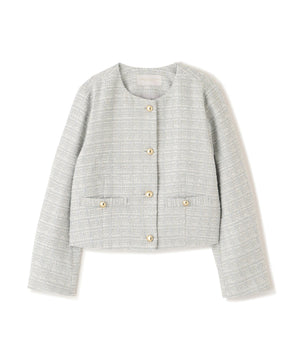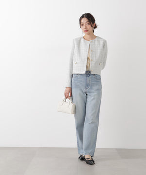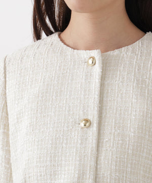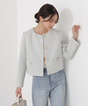 ラメ糸入りツイード生地が大人かわいいノーカラージャケット。春らしく華やかなライトブルーと上品なエクリュカラーの2色展開です。控えめなツヤ感のゴールドカラー釦がポイント。フェミニンにもカジュアルにも着回せ、オンオフ問わず活躍してくれます。