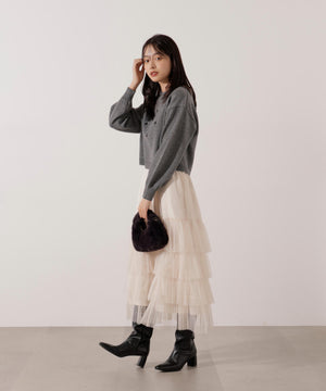 存在感のあるビジュー調が映えるボクシーニット。キラキラ感を抑えたブラックカラーのビジュー調が、大人っぽい雰囲気に見せてくれます。短丈ながらも、余裕のあるボクシーシルエットなので、よりカジュアルに着られます。