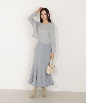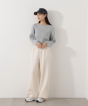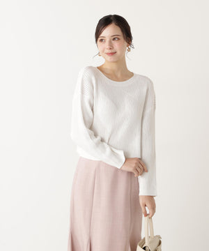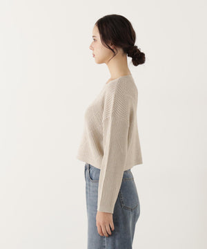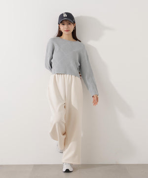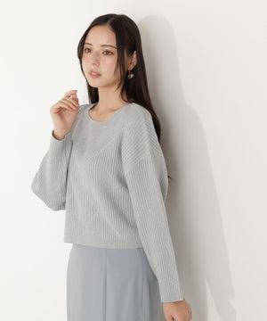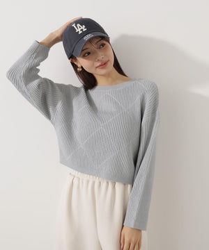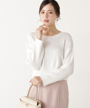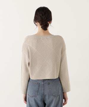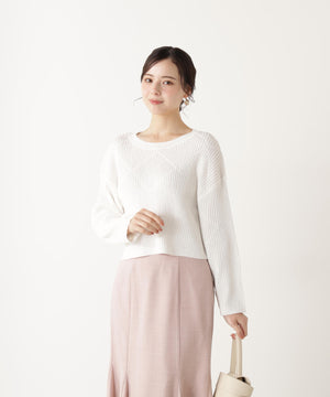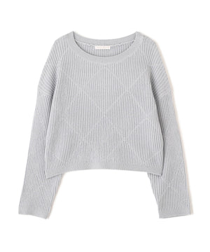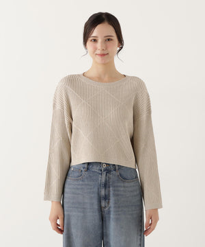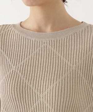 程よい厚みがあるキラキラのラメ糸が大人フェミニンな雰囲気の短丈ニット。ボートネックと格子柄の、人気ディテールの組み合わせがポイントです。スカートやデニム、ワイドパンツ合わせもお勧めです。