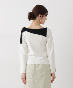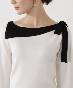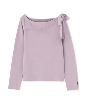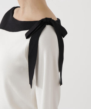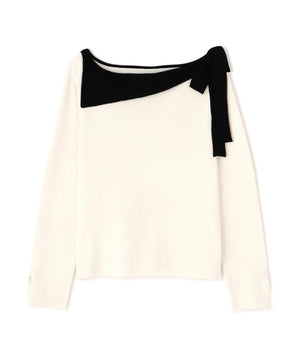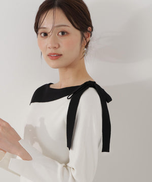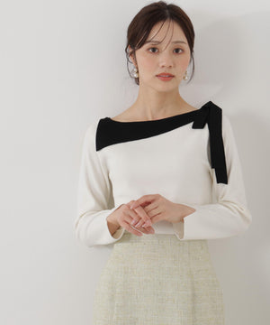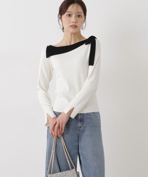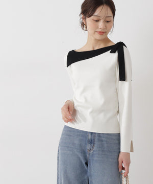 ネックラインをキレイに見せてくれる総針ニット。襟ぐりのアシンメトリーなラインとリボンが目を引くデザインです。首元が広めに開いていますが、下着のラインを気にしないで着用いただけます。色によって配色を効かせたリボンがアクセント。キレイめデイリースタイルに活躍してくれます。