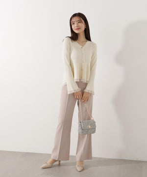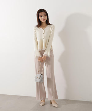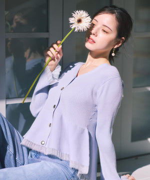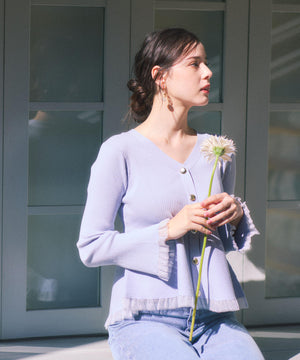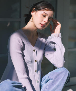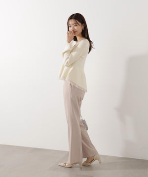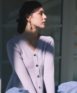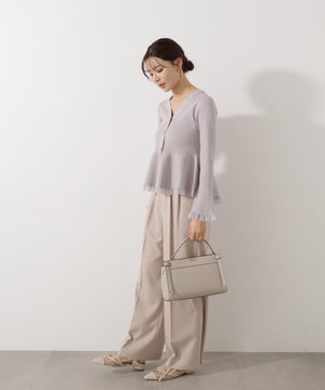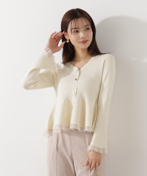 大人気アイテムが春らしい新色になって再登場!フロントの飾りボタンがポイントのペプラムニットです。裾は前後差をだした着丈にし、気になる腰まわりをカバーしながら着やすさも両立。袖口と裾は異なる糸でシアー感を出しているのでロングシーズン着用いただけます。シンプルパンツ、デニムパンツ合わせもお勧めです。