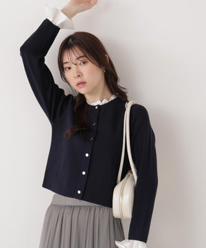 トレンド感のある異素材ドッキングを取り入れたカーディガン。襟ぐりと袖口にシャツ生地をドッキングし、一枚でコーディネートが完成します。さらっとした肌触りのニットで、春先まで活躍。スカートもパンツも合う短丈シルエットで、スタイルアップが叶います。