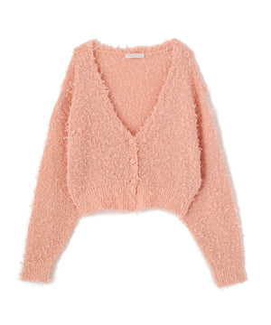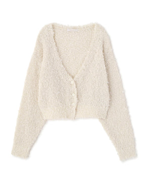 短丈ながらルーズなシルエットが可愛いカーディガン。春らしいチュールテープヤーンと控え目なラメ糸が、動くたびにきらっと映えます。シンプルなデザインなので、幅広いスタイリングに活躍する着回し力の高い一枚です。