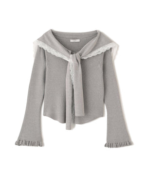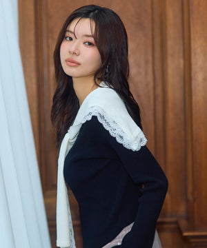 セーラーカラー×レースボウタイをあしらった甘すぎず上品なトレンドニット。首元の華やかなディテールが顔まわりを明るく見せ、程よく開いたネックラインで首をほっそり見せながら小顔効果も期待できます。体に沿うすっきりシルエットに、袖口はフレアデザインで、女性らしさを演出。黒×ホワイトの上品なモノトーン、柔らかで愛らしいアイボリー、洗練された配色グレーの3色を揃えています。