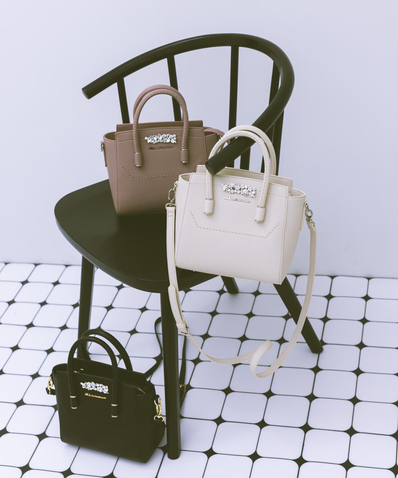 JILL by JILL STUART大人気のビジューロイヤルシリーズのミニバッグ。型押し風ボディにジュエリーをまとったような、エレガントな表情のデザインです。口元はファスナー開閉、内部は両側に小物ポケットが付いています。あらゆるシーンに合わせられる上品なアイテムは季節を選ばずお使いいただけます。※ショルダー取り外し可能※撮影時照明の関係により、色味が違って見える場合がございます。
