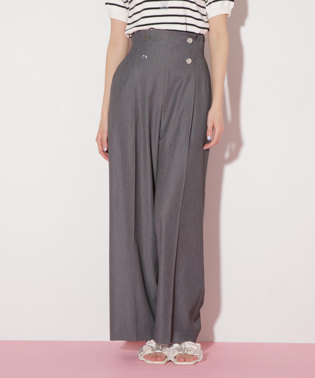 JILL by JILL STUART定番の釦付きワイドパンツ。ハンマー加工をあしらった表面感のあるメタル釦をつけています。太すぎないワイドラインは、太ももから裾にかけてストレートにし、センタープレス入りでキレイめな印象に仕上げています。ウエスト位置を高めにしているので脚長効果を狙える1本。※撮影時照明の関係により、色味が違って見える場合がございます。