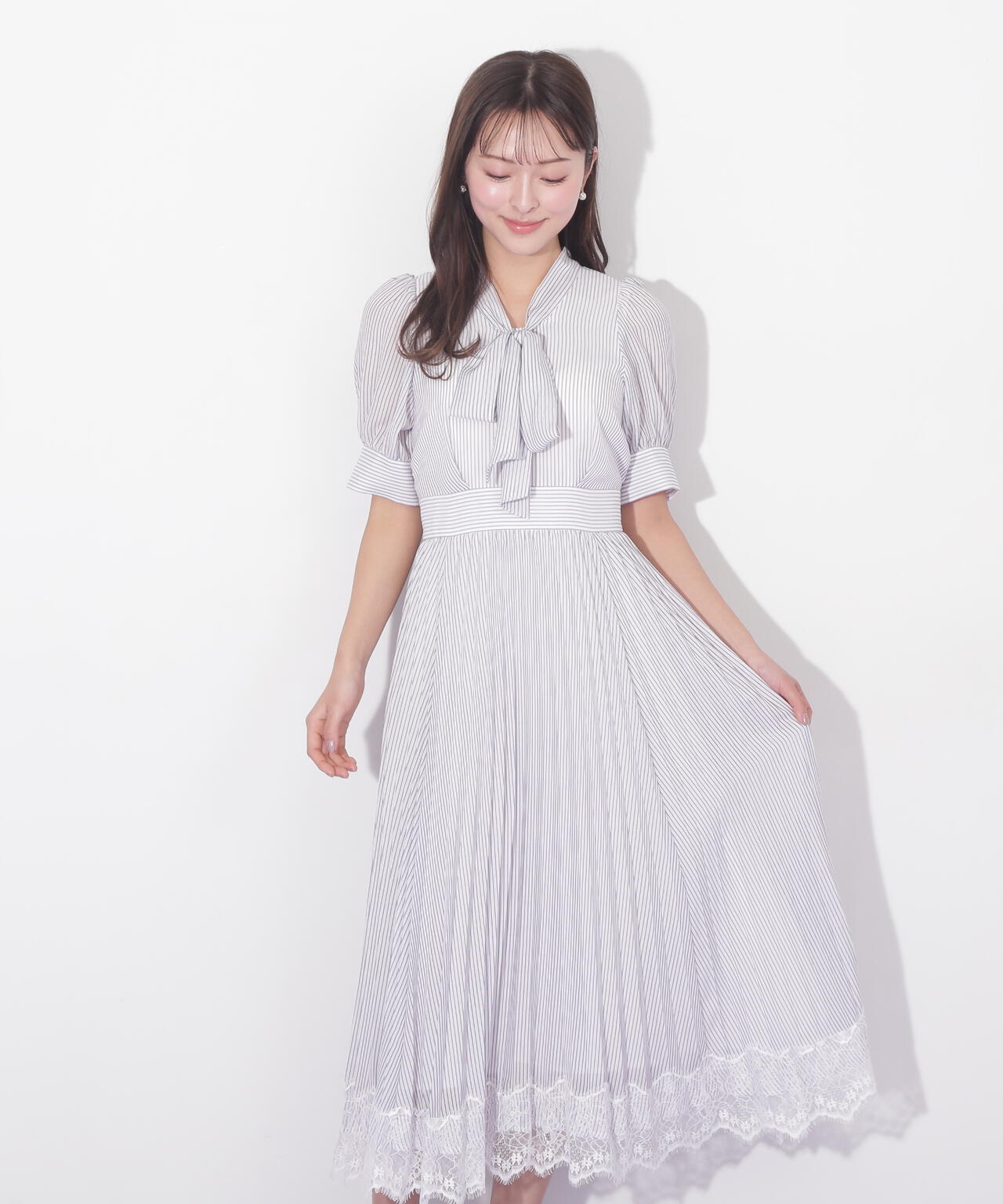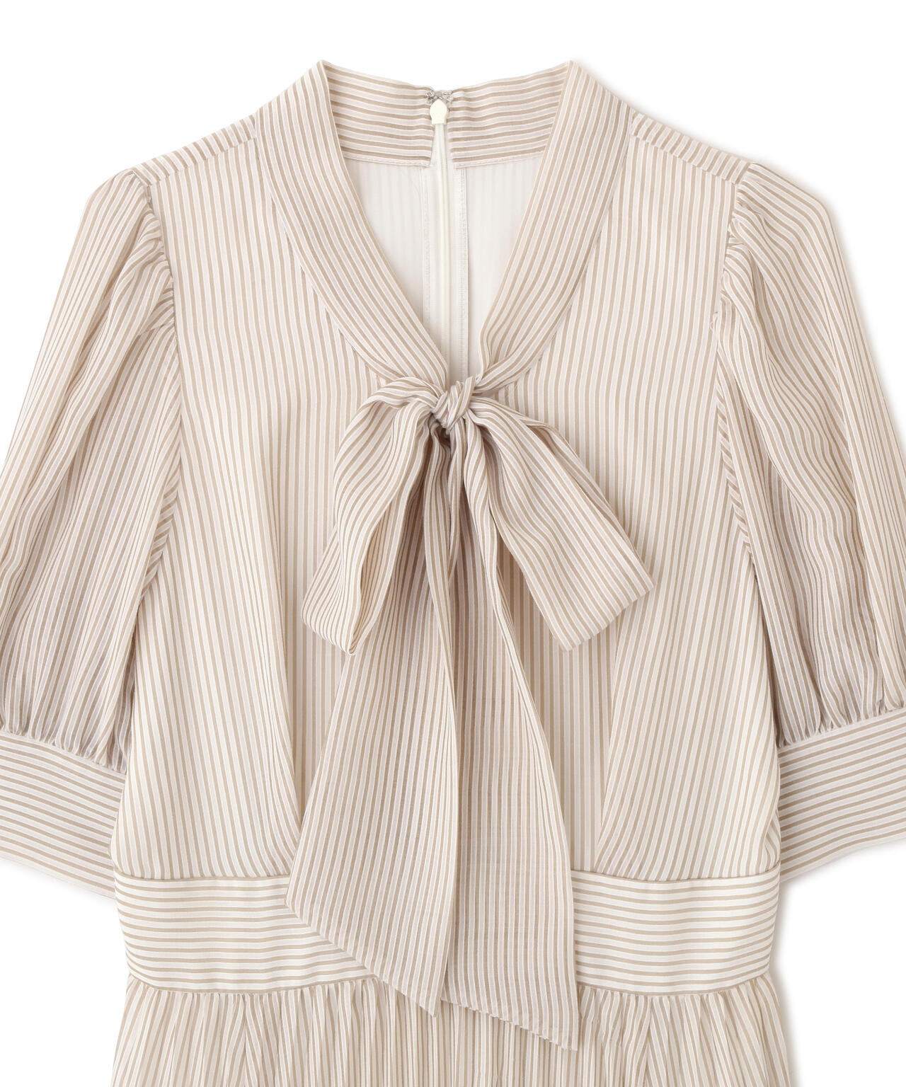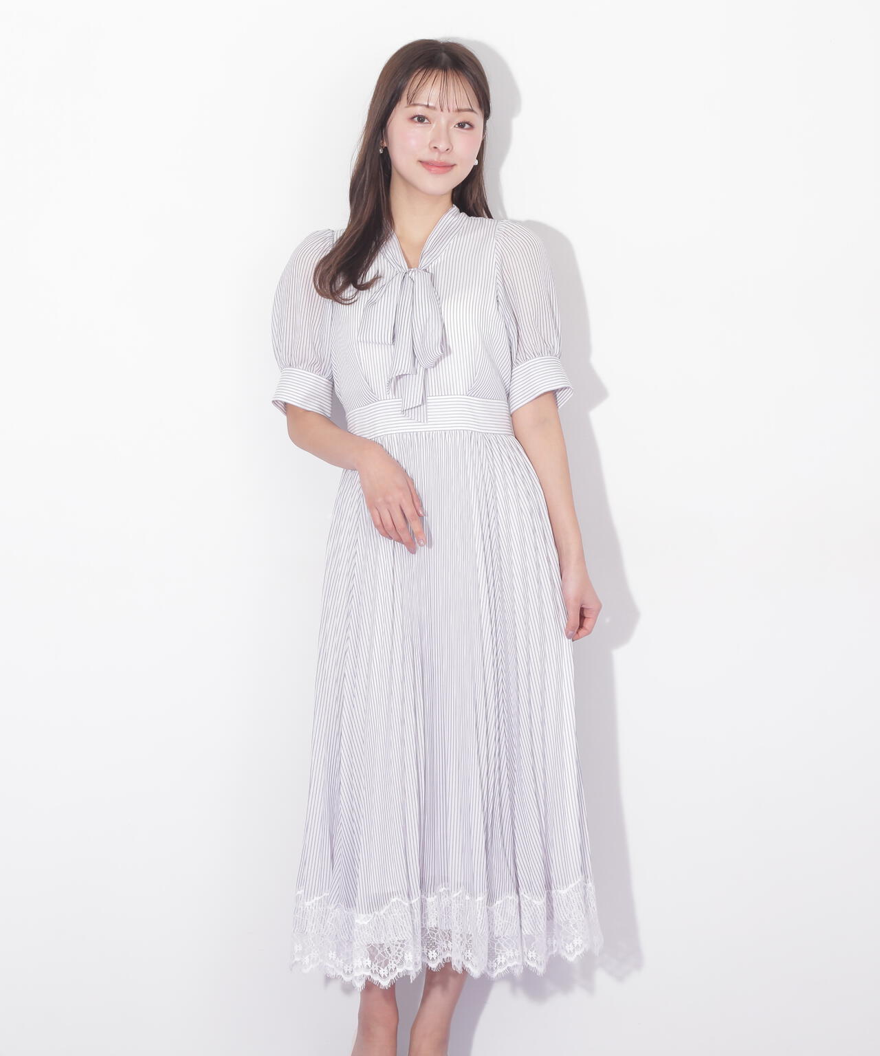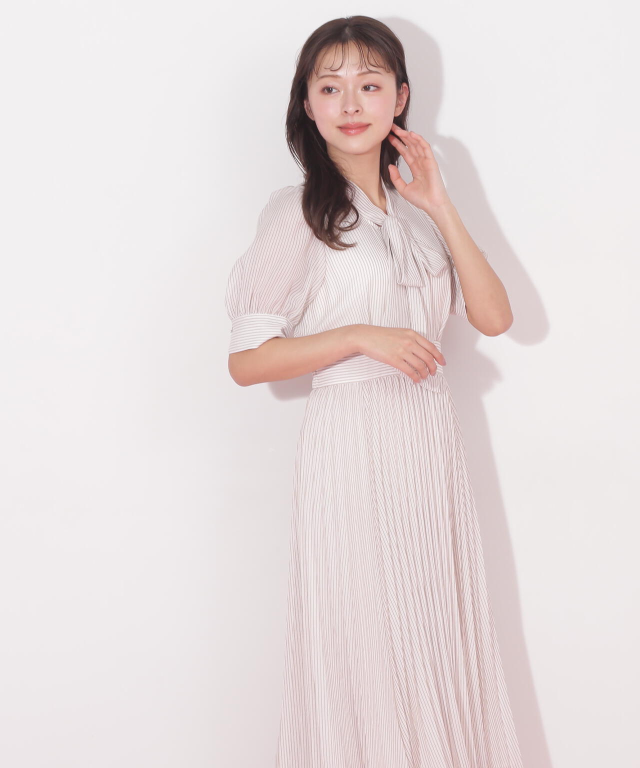 シアーなストライプが春気分を盛り上げるフェミニンなボウタイワンピース。柔らかく程よい透け感があり、かっちりしすぎないストライプ柄が魅力。ボウタイや裾のレースがエレガントな印象に見せてくれます。5分袖のパフスリーブで、気になる二の腕をカバー。リボンのボウタイでフロントに華やかさがあるので、ノーカラーライダースやテーラードジャケットなどの春アウターと相性抜群です。※撮影時照明の関係により、色味が違って見える場合がございます。