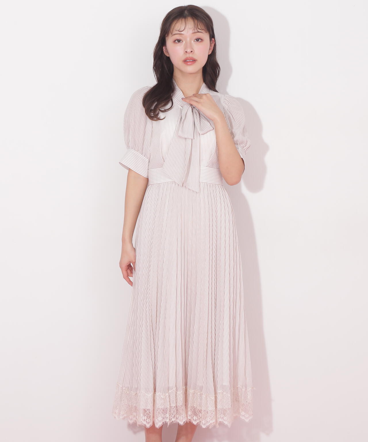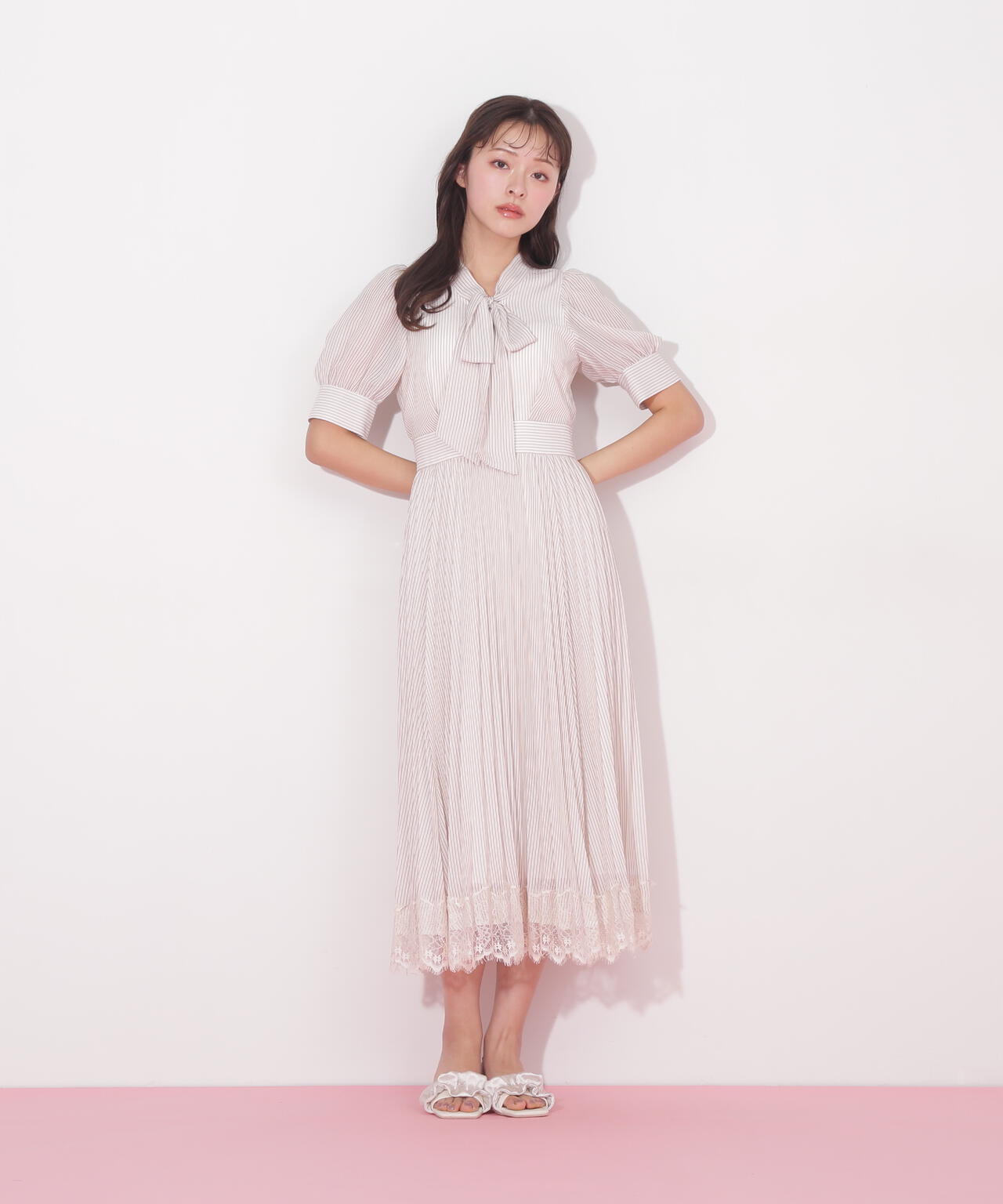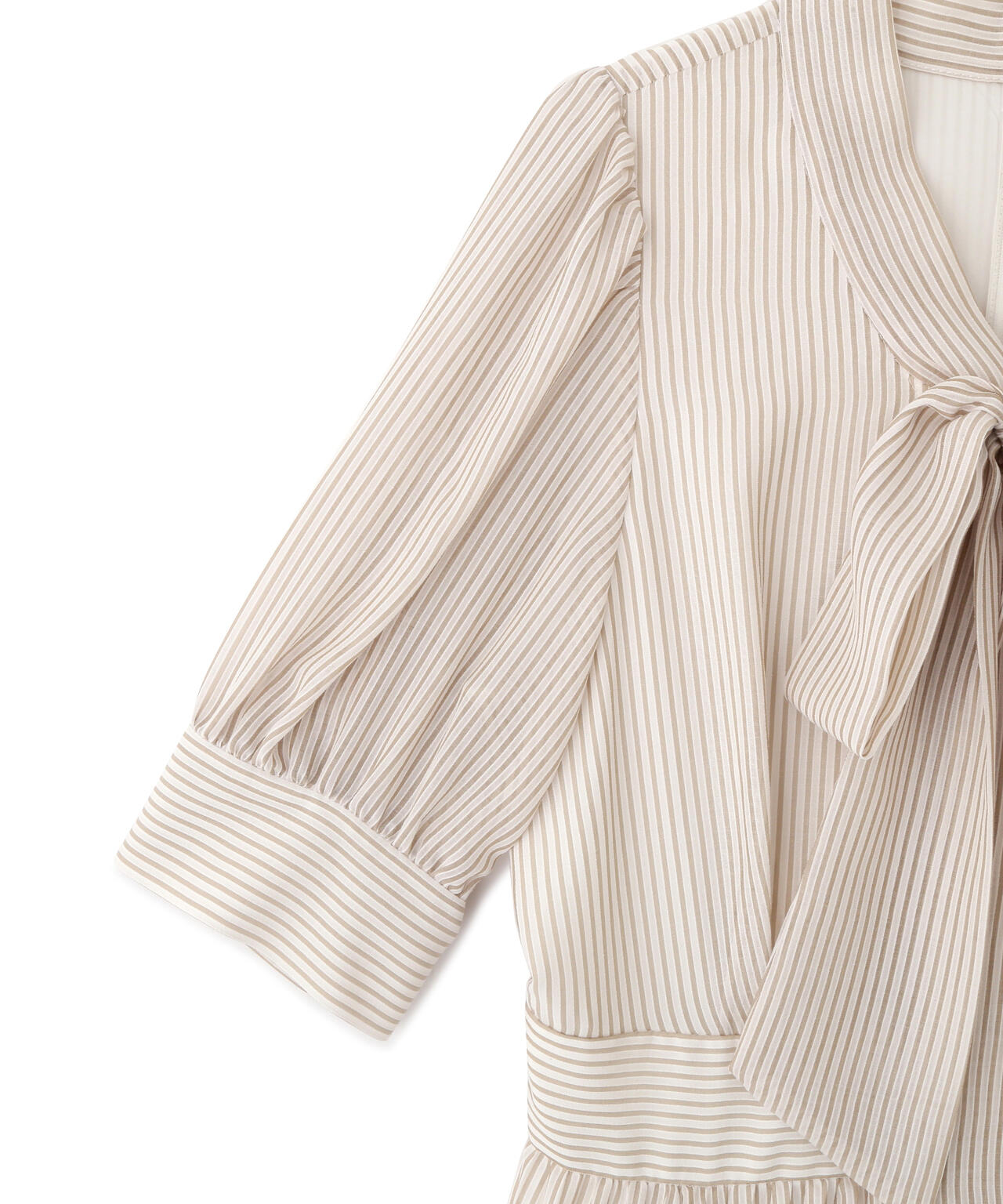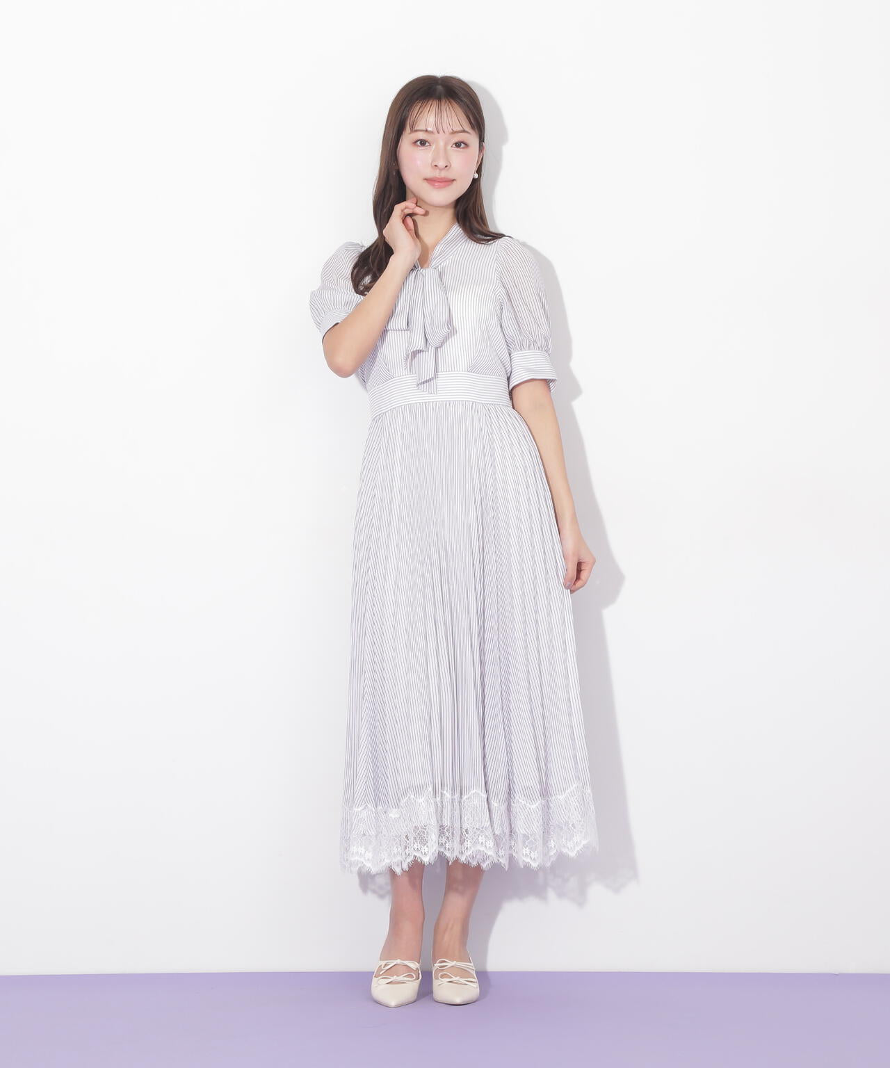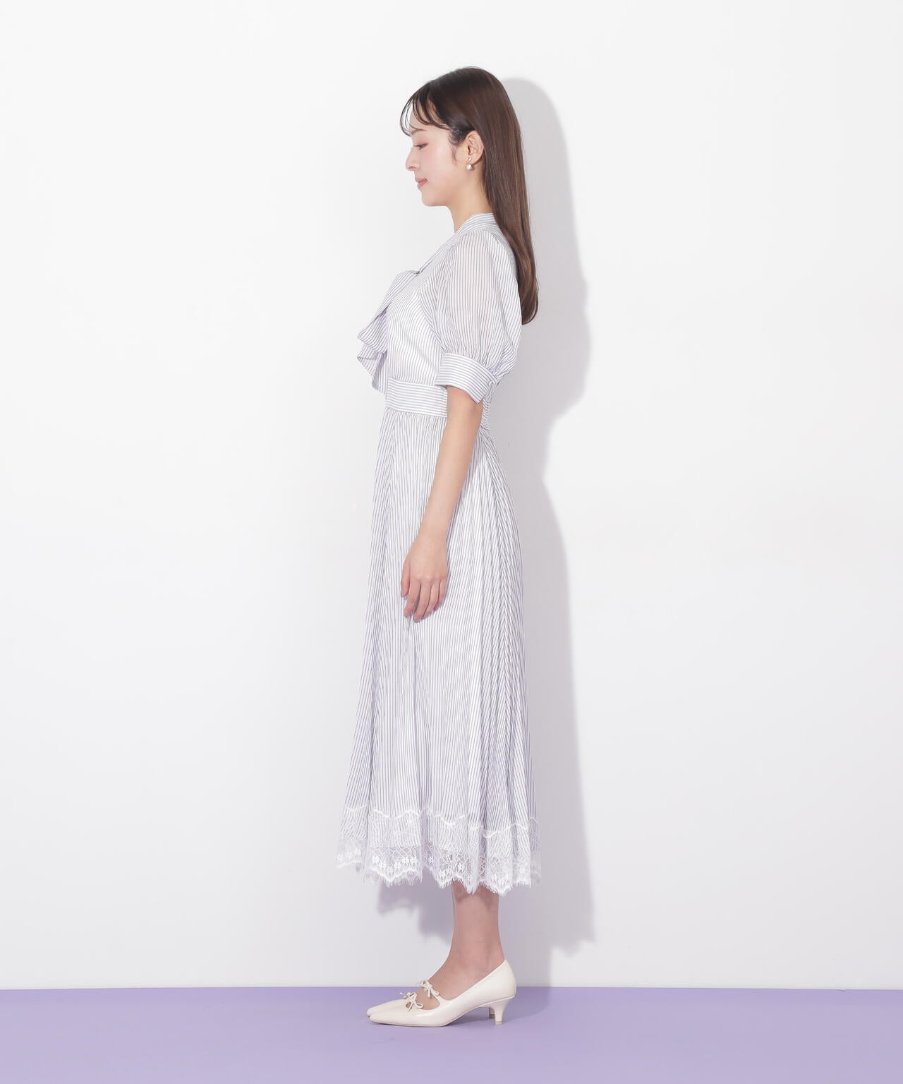 シアーなストライプが春気分を盛り上げるフェミニンなボウタイワンピース。柔らかく程よい透け感があり、かっちりしすぎないストライプ柄が魅力。ボウタイや裾のレースがエレガントな印象に見せてくれます。5分袖のパフスリーブで、気になる二の腕をカバー。リボンのボウタイでフロントに華やかさがあるので、ノーカラーライダースやテーラードジャケットなどの春アウターと相性抜群です。※撮影時照明の関係により、色味が違って見える場合がございます。