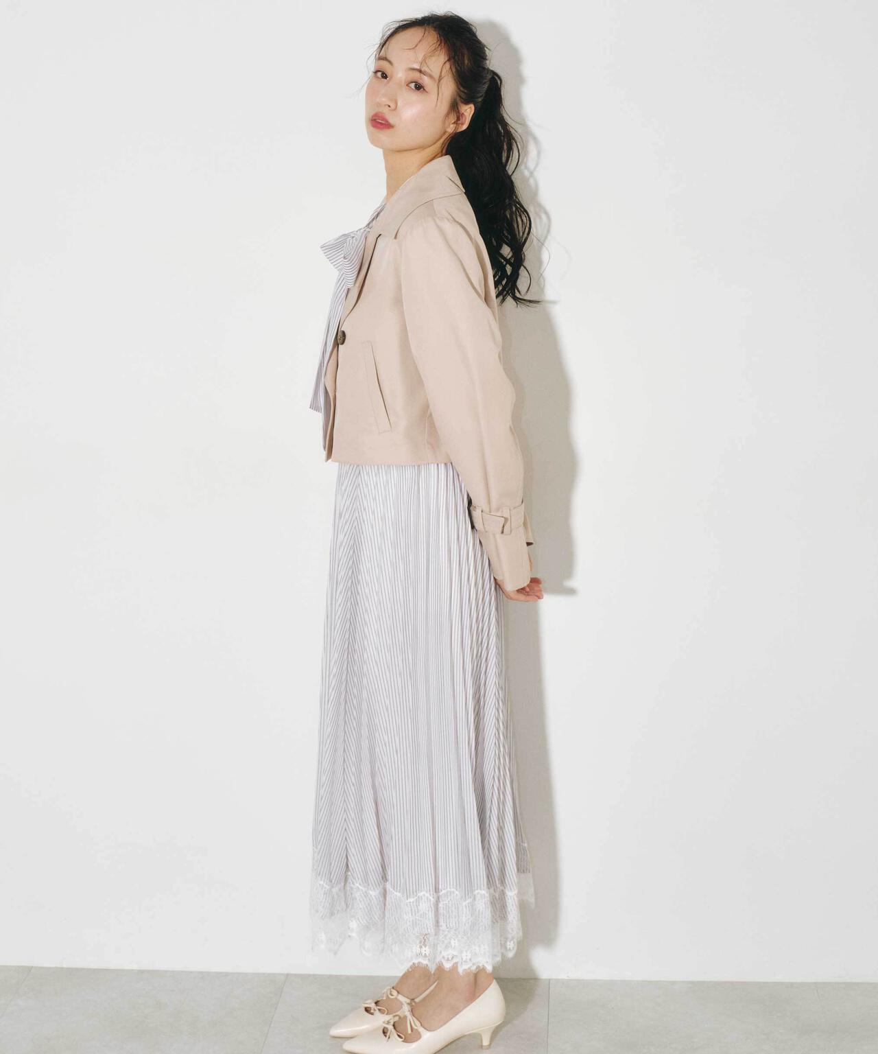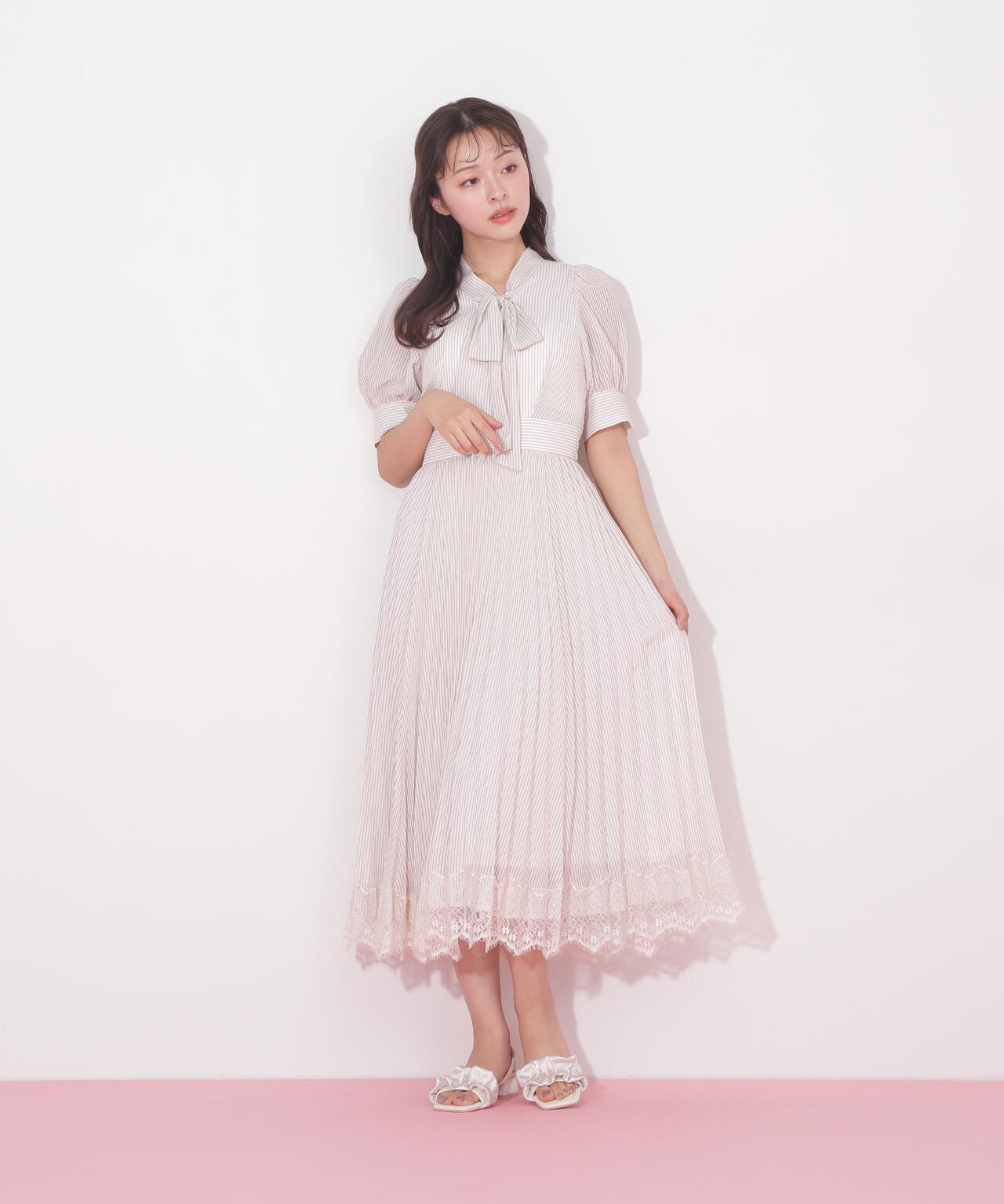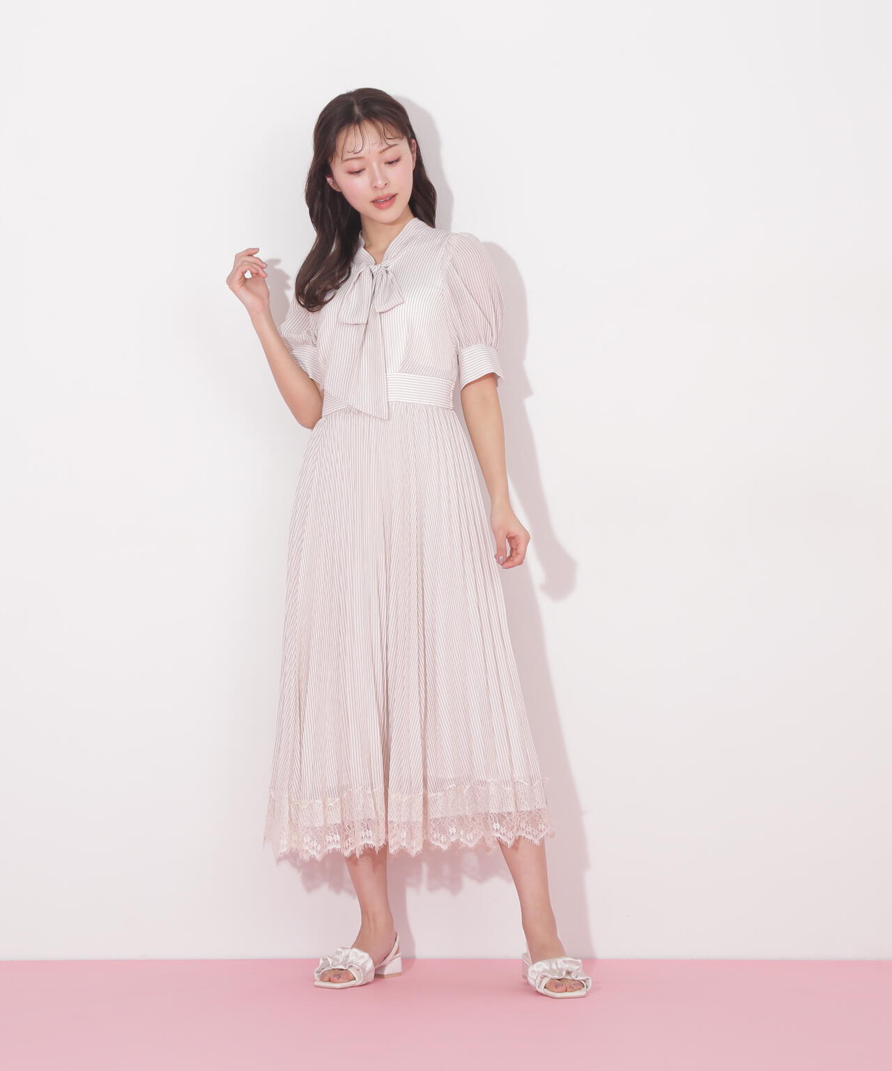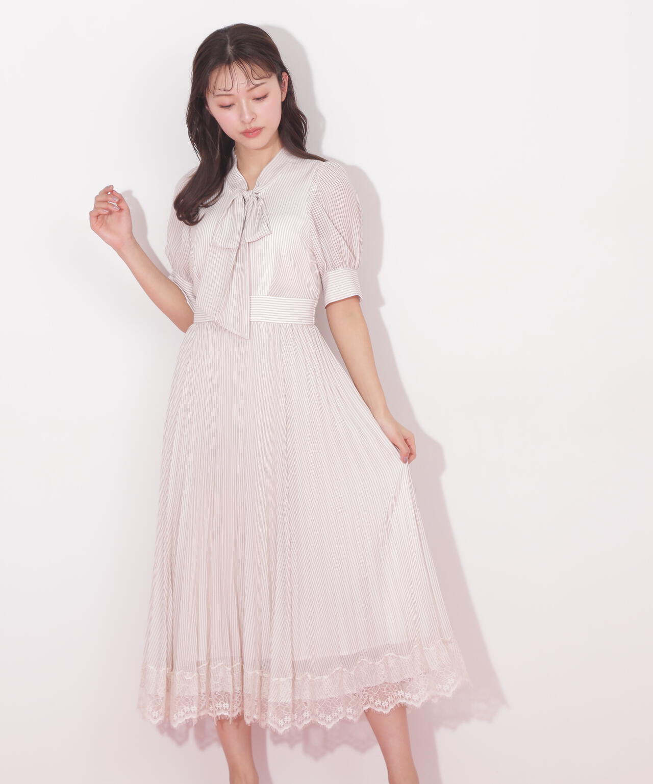シアーなストライプが春気分を盛り上げるフェミニンなボウタイワンピース。柔らかく程よい透け感があり、かっちりしすぎないストライプ柄が魅力。ボウタイや裾のレースがエレガントな印象に見せてくれます。5分袖のパフスリーブで、気になる二の腕をカバー。リボンのボウタイでフロントに華やかさがあるので、ノーカラーライダースやテーラードジャケットなどの春アウターと相性抜群です。※撮影時照明の関係により、色味が違って見える場合がございます。