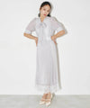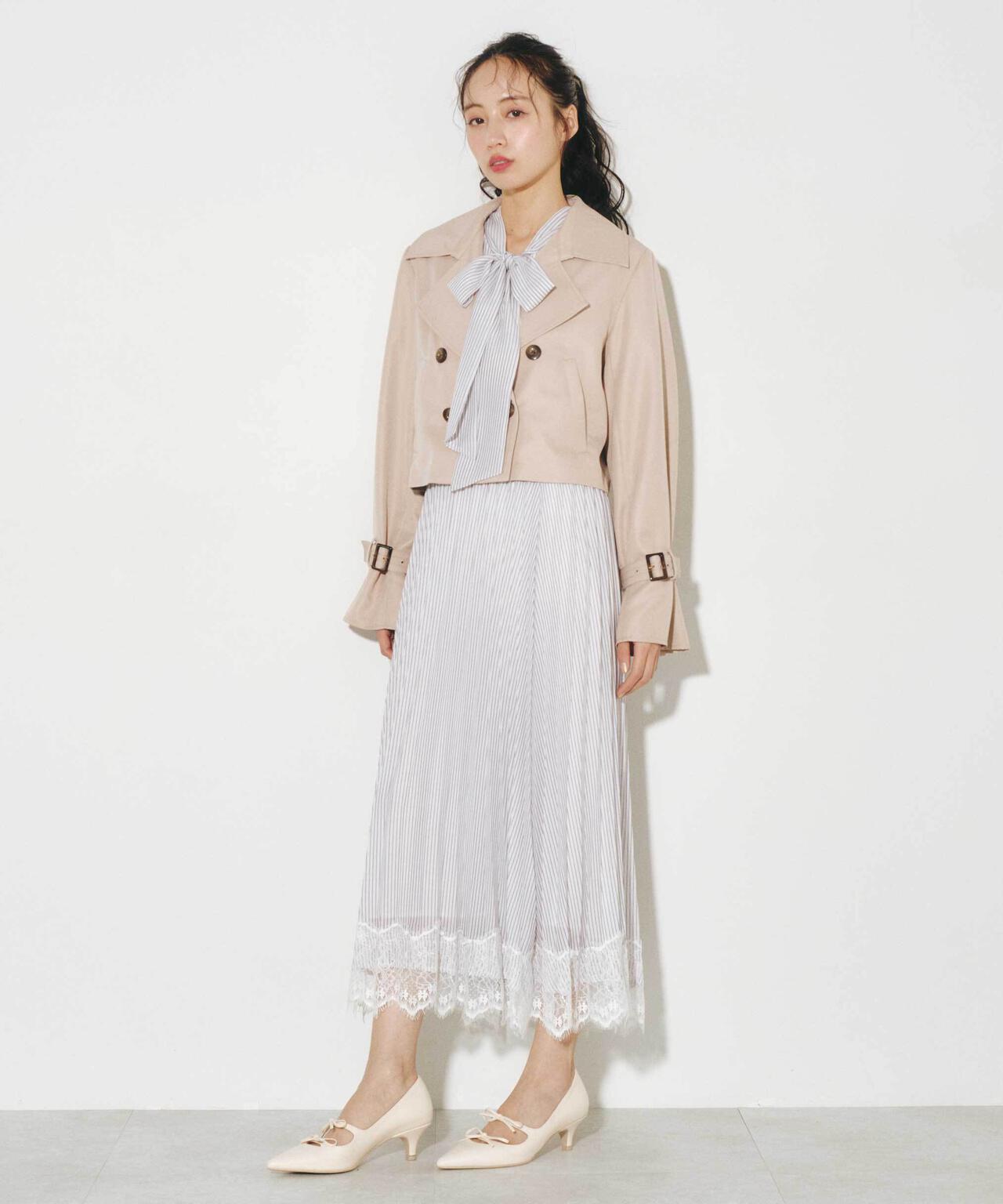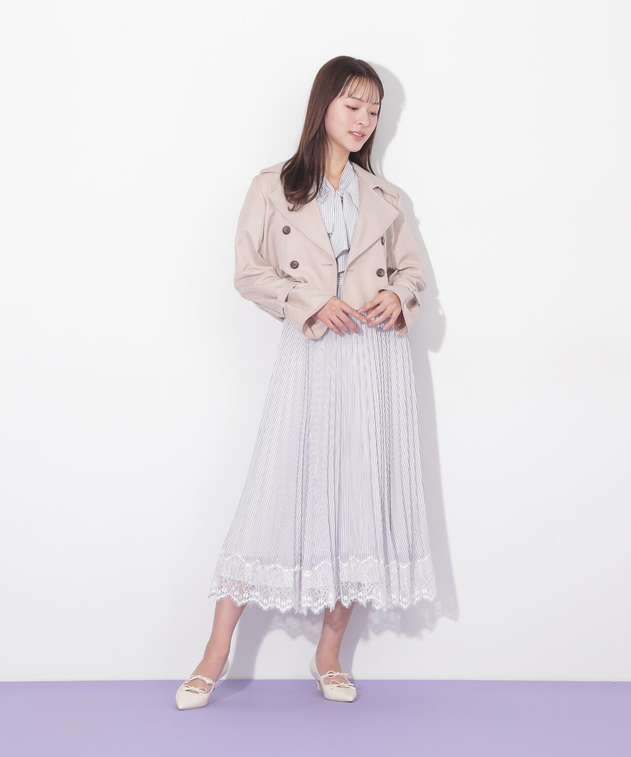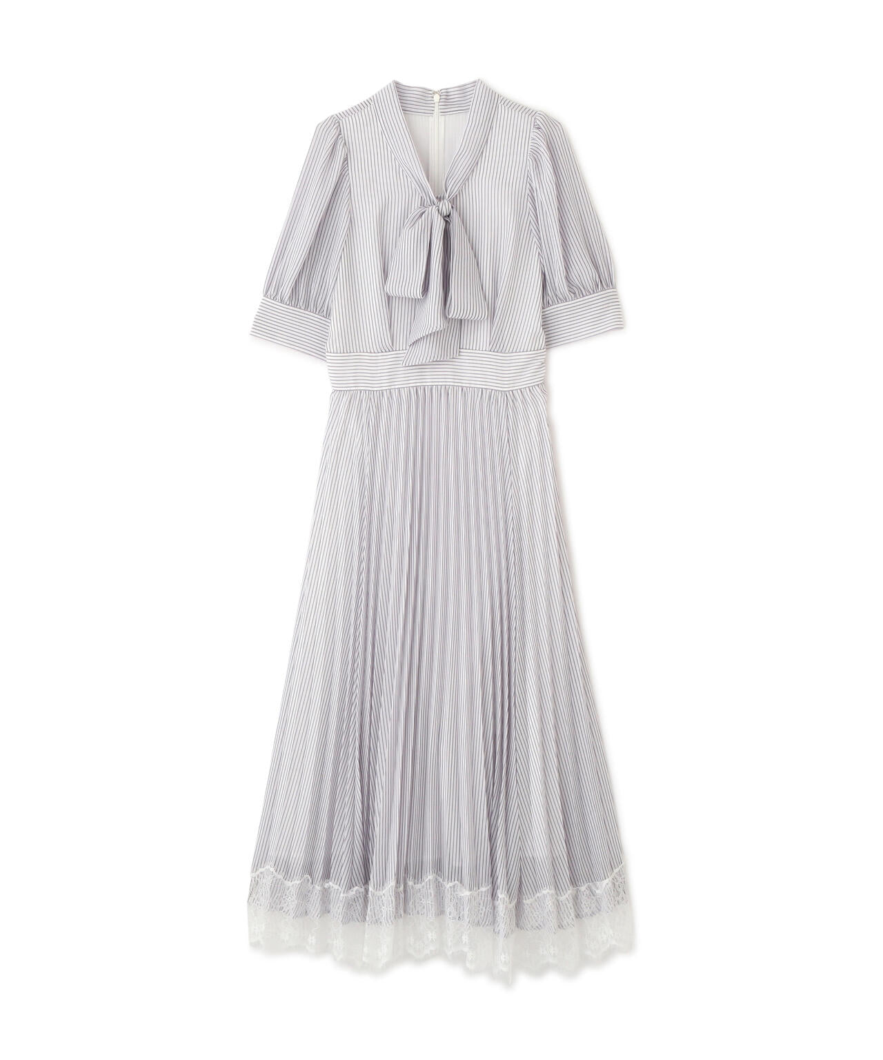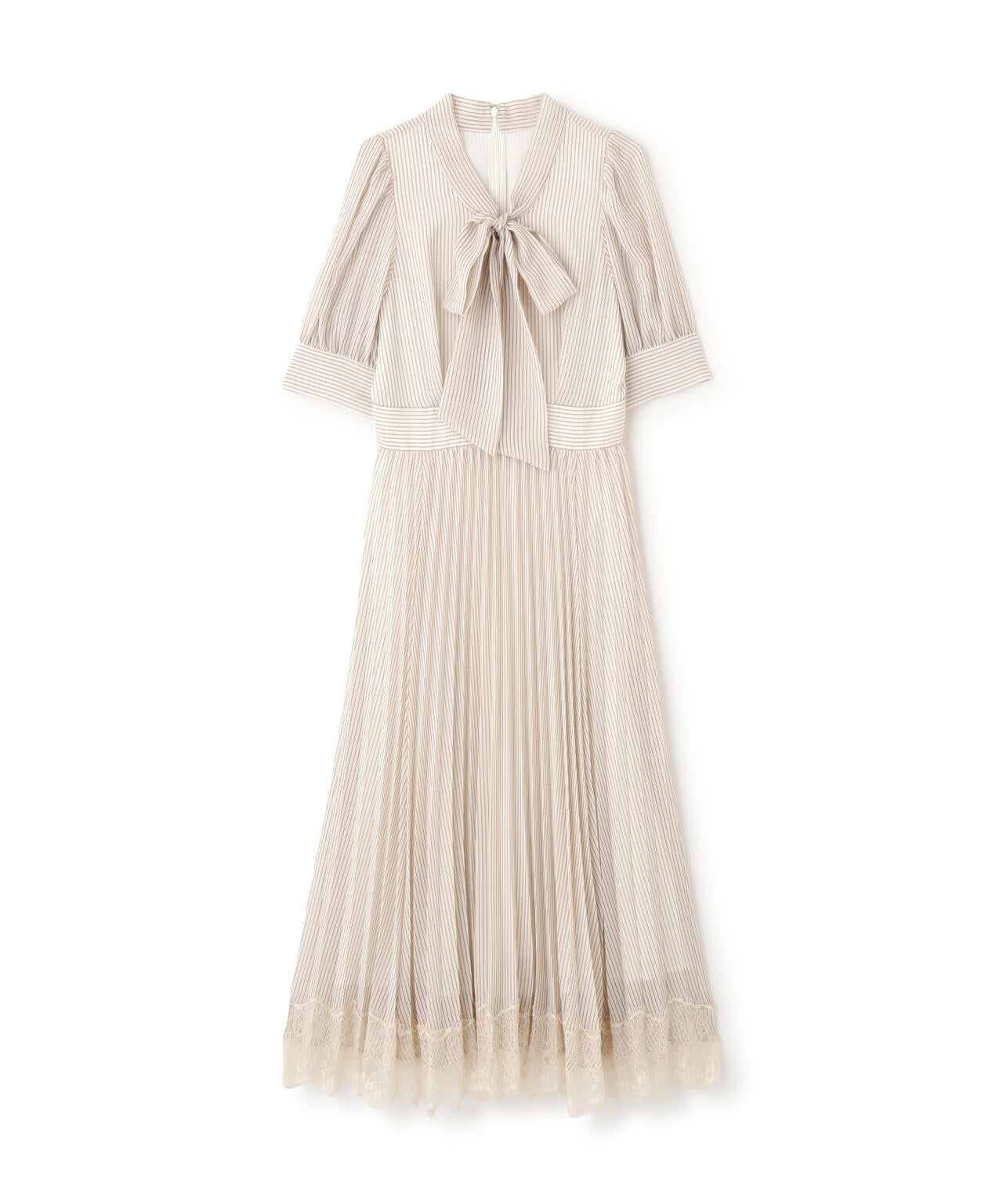 シアーなストライプが春気分を盛り上げるフェミニンなボウタイワンピース。柔らかく程よい透け感があり、かっちりしすぎないストライプ柄が魅力。ボウタイや裾のレースがエレガントな印象に見せてくれます。5分袖のパフスリーブで、気になる二の腕をカバー。リボンのボウタイでフロントに華やかさがあるので、ノーカラーライダースやテーラードジャケットなどの春アウターと相性抜群です。※撮影時照明の関係により、色味が違って見える場合がございます。