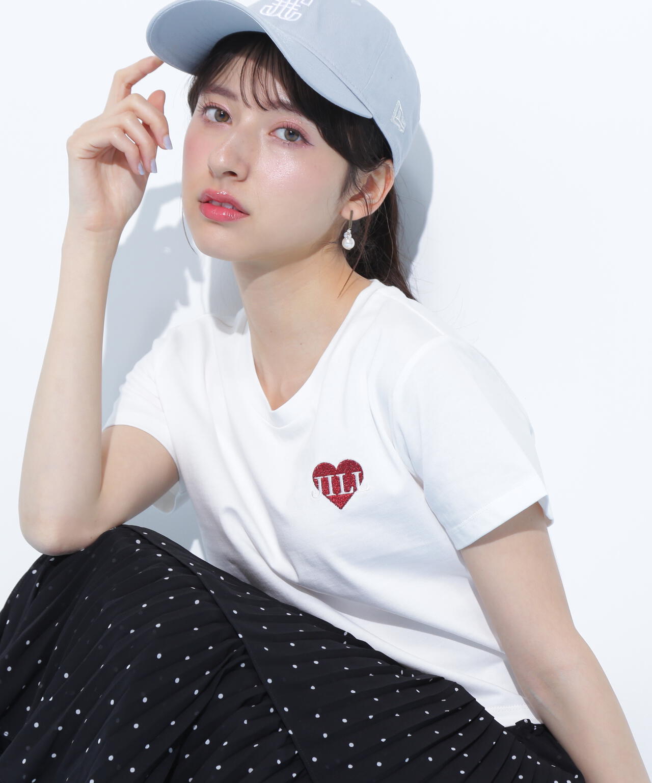 ワンポイント刺しゅうがキャッチーなTシャツ。ハートモチーフとブランド名をキラキラ糸で刺しゅうしたデザインです。コンパクトでハイウエストのボトムスとバランスが取りやすく、ウエスト周りがもたつかないすっきりシルエット。クロップド丈なのでINもしやすく、今季ご用意しているボトムスと相性バツグンです。※撮影時照明の関係により、色味が違って見える場合がございます。