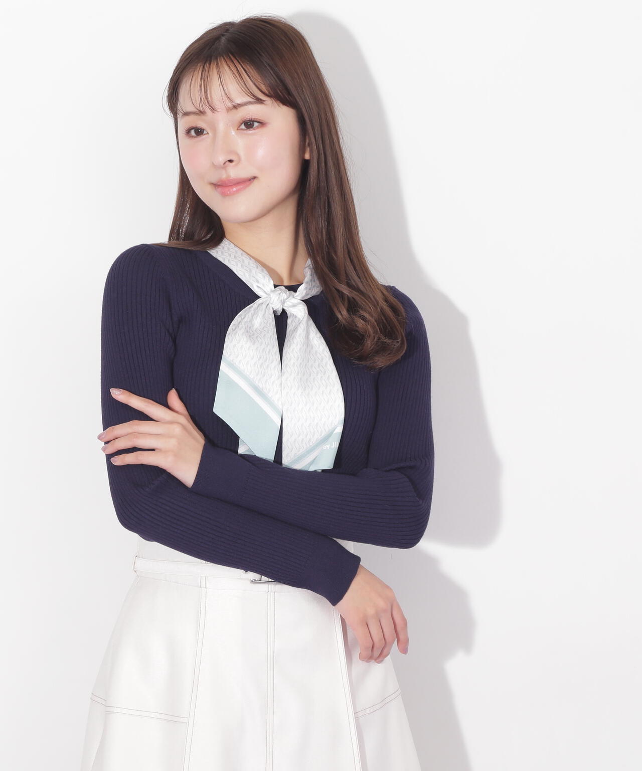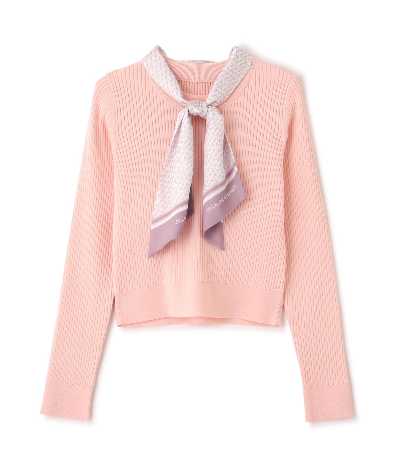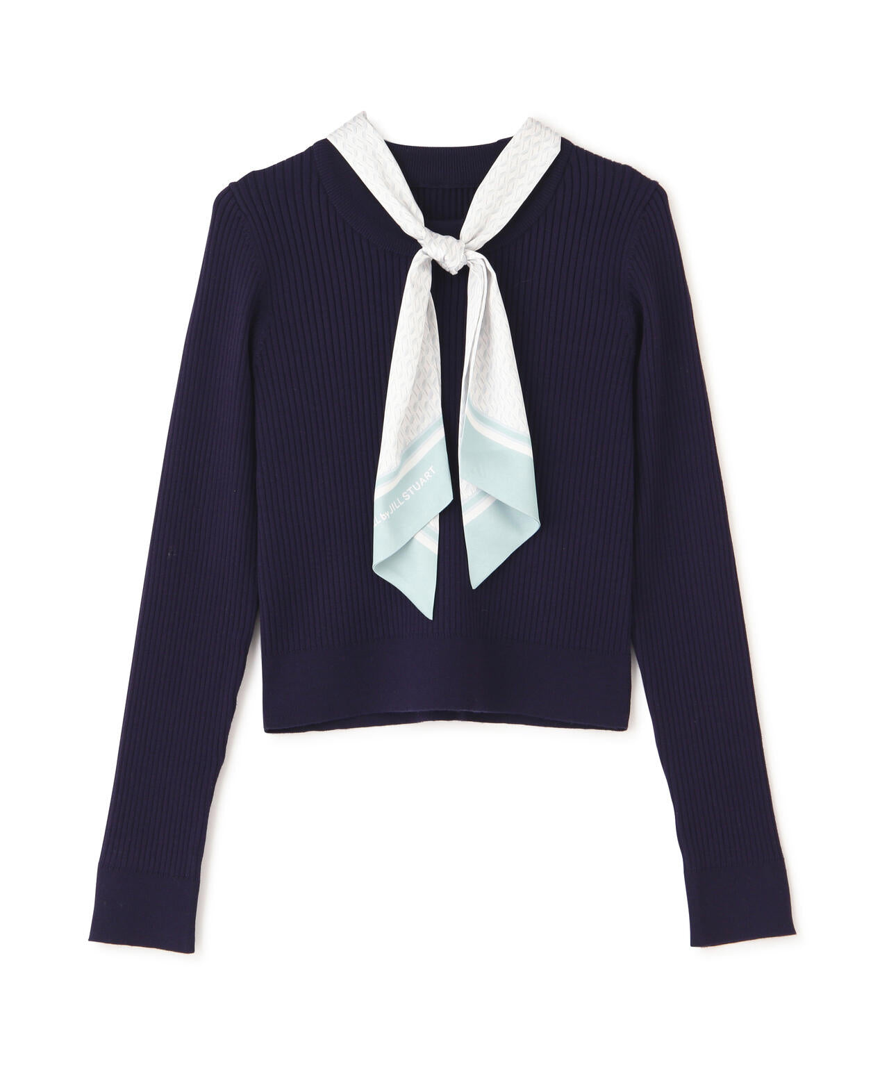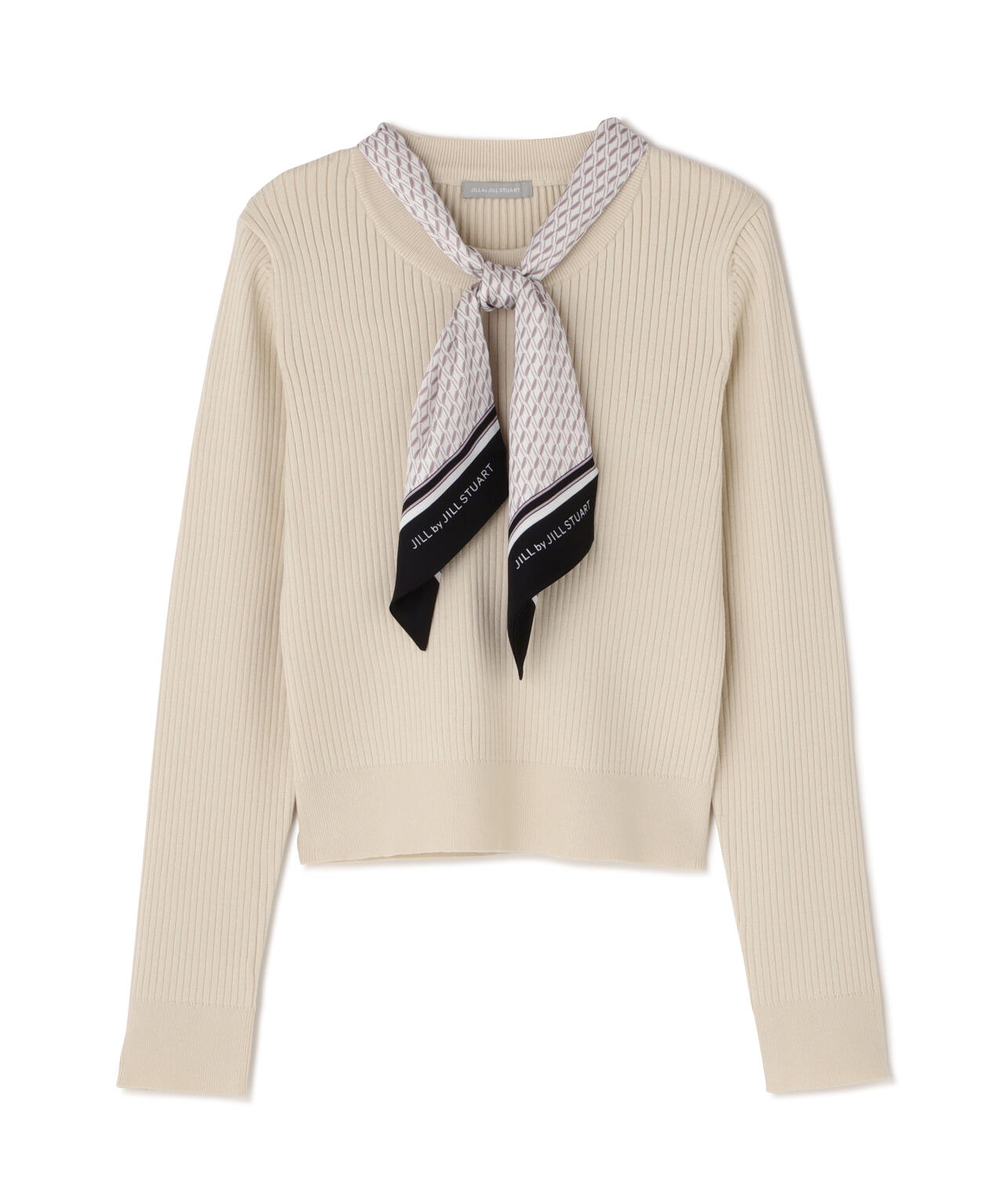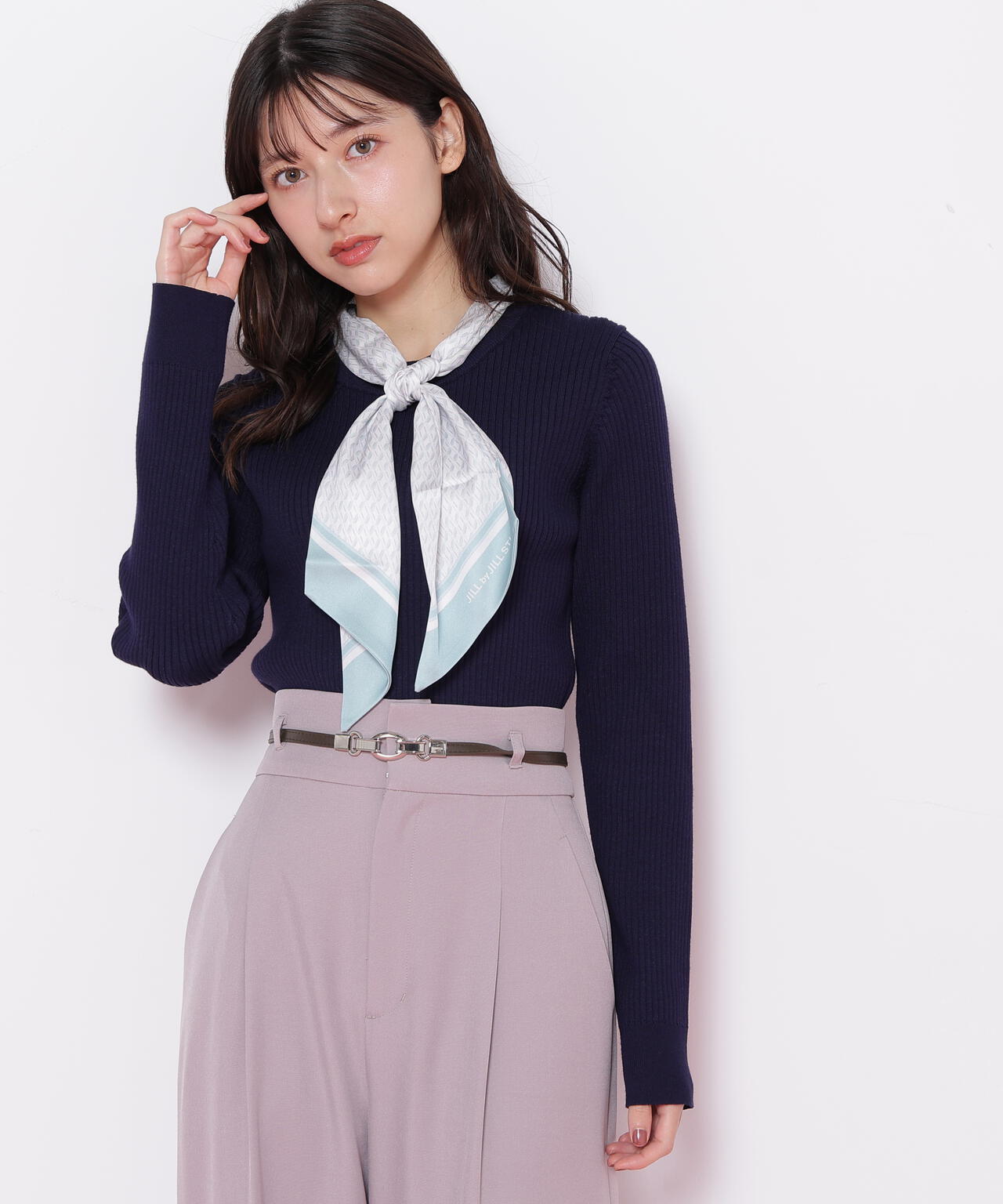 JILL by JILL STUARTオリジナル柄スカーフ付きニット。チェックを幾何学柄風にしてポイントでロゴを入れた、オリジナル柄スカーフです。スカーフはタテに4つ折りしてループに通し、結んでから先を開くとキレイに決まります。後ろのループからスカーフを取ると、ボトルネックのシンプルニットとしても使えるデザイン。ボトムスを選ばず着回せます。ネイビーはトレンドのグリーンカラーをスカーフに取り入ているのでおススメです。※撮影時照明の関係により、色味が違って見える場合がございます。