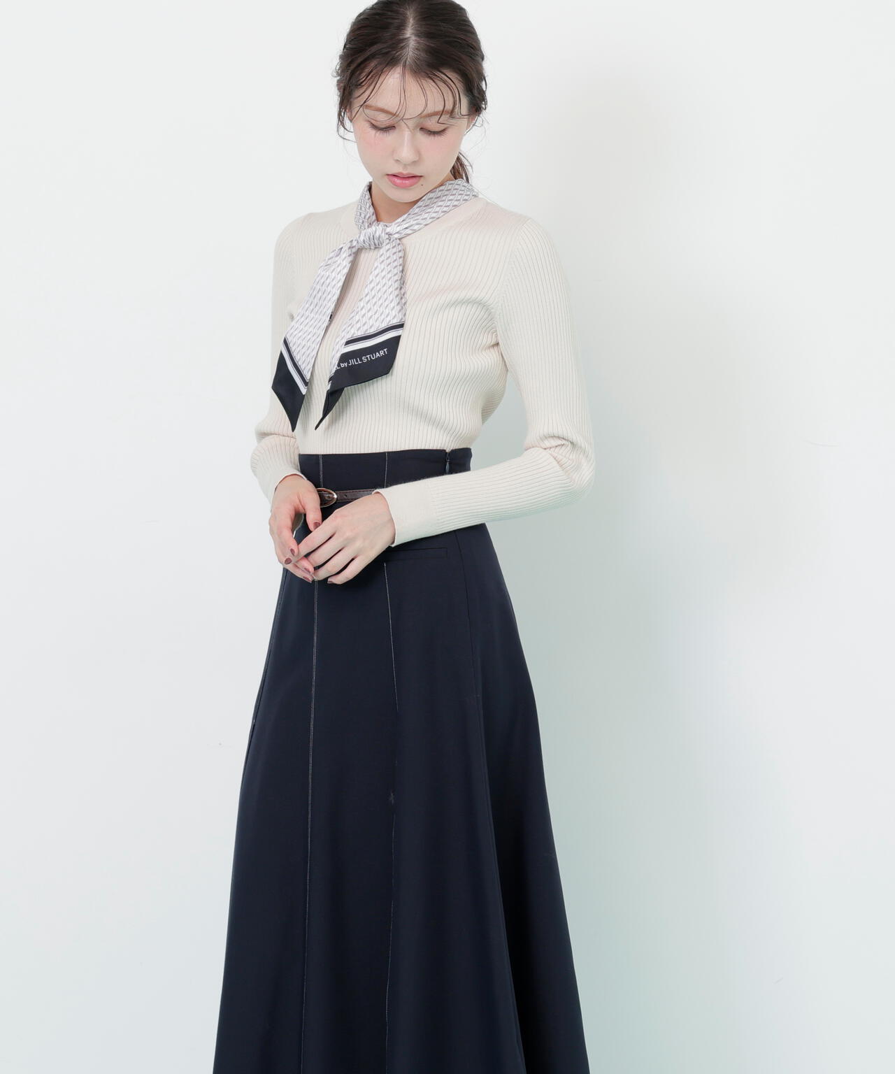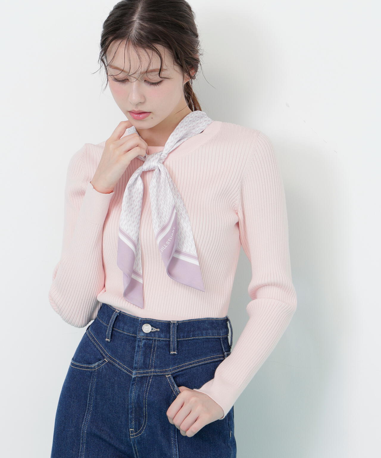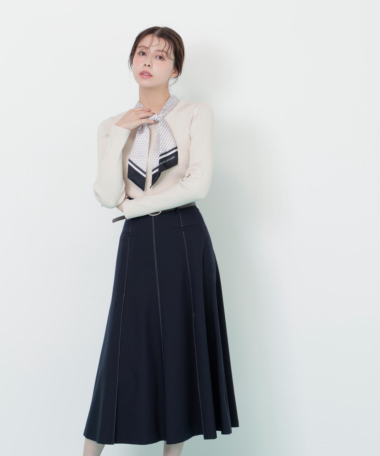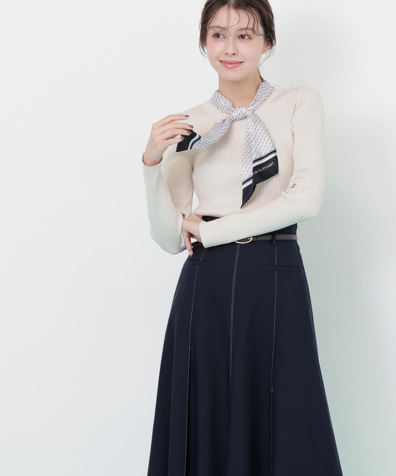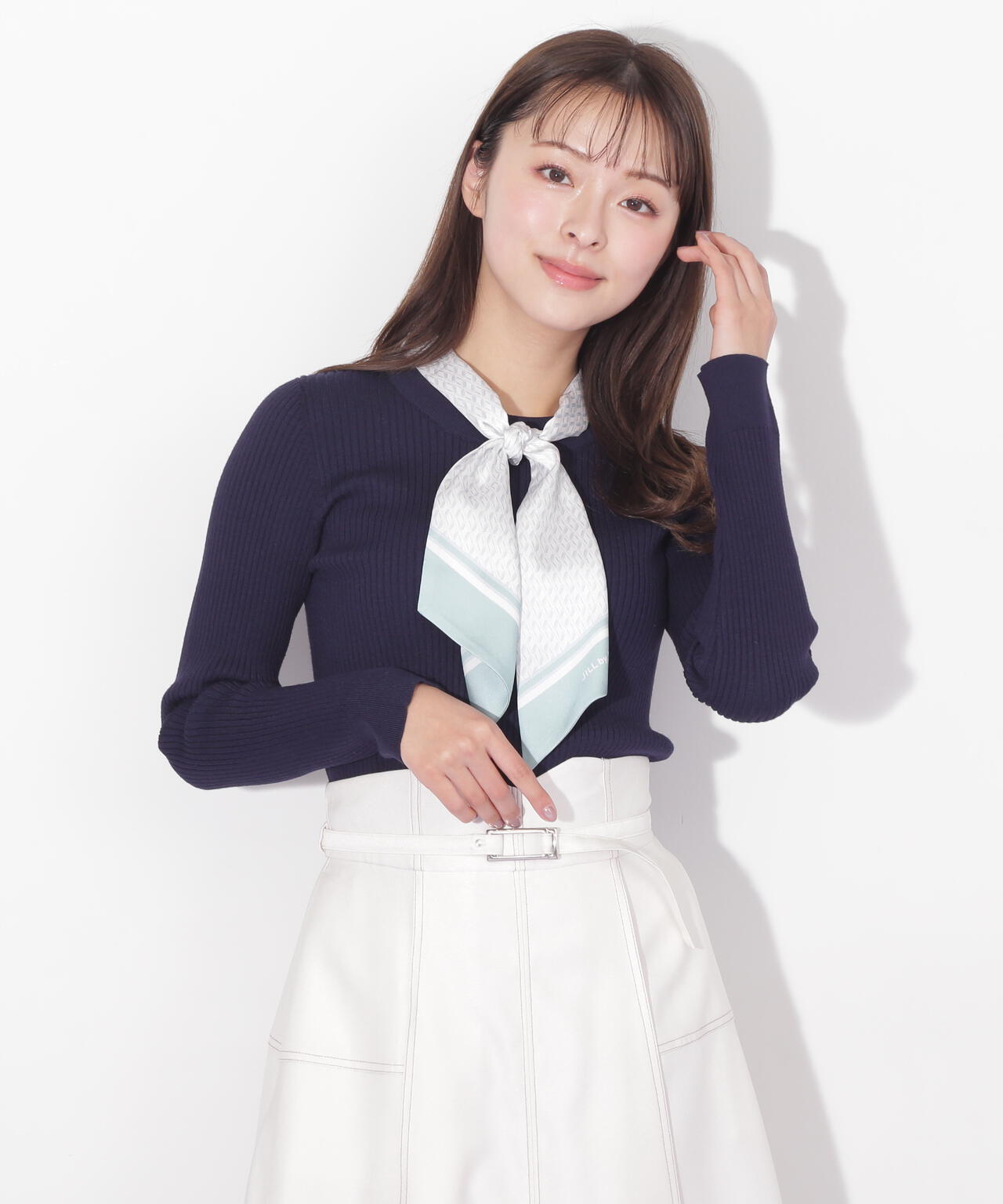 JILL by JILL STUARTオリジナル柄スカーフ付きニット。チェックを幾何学柄風にしてポイントでロゴを入れた、オリジナル柄スカーフです。スカーフはタテに4つ折りしてループに通し、結んでから先を開くとキレイに決まります。後ろのループからスカーフを取ると、ボトルネックのシンプルニットとしても使えるデザイン。ボトムスを選ばず着回せます。ネイビーはトレンドのグリーンカラーをスカーフに取り入ているのでおススメです。※撮影時照明の関係により、色味が違って見える場合がございます。
