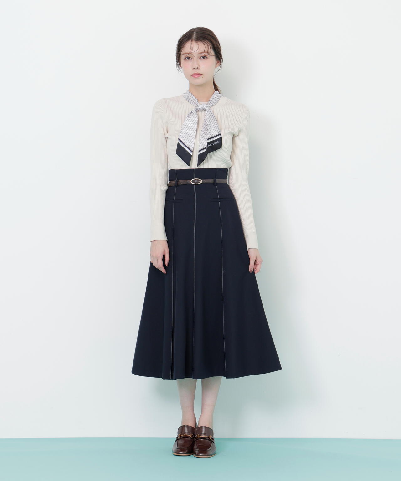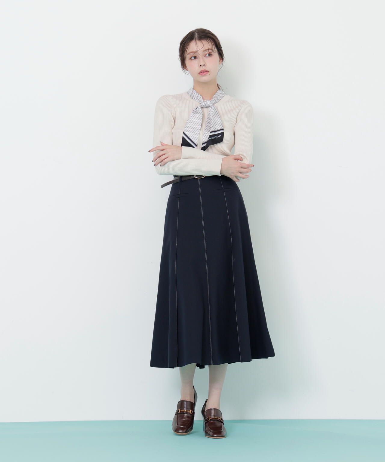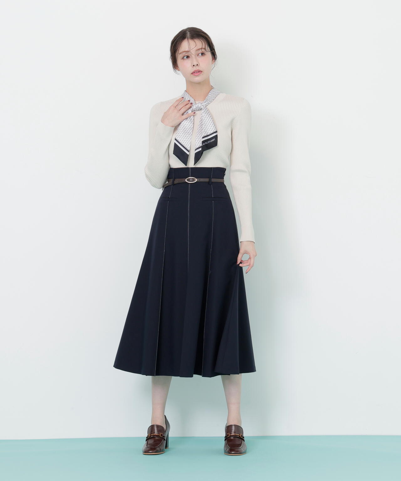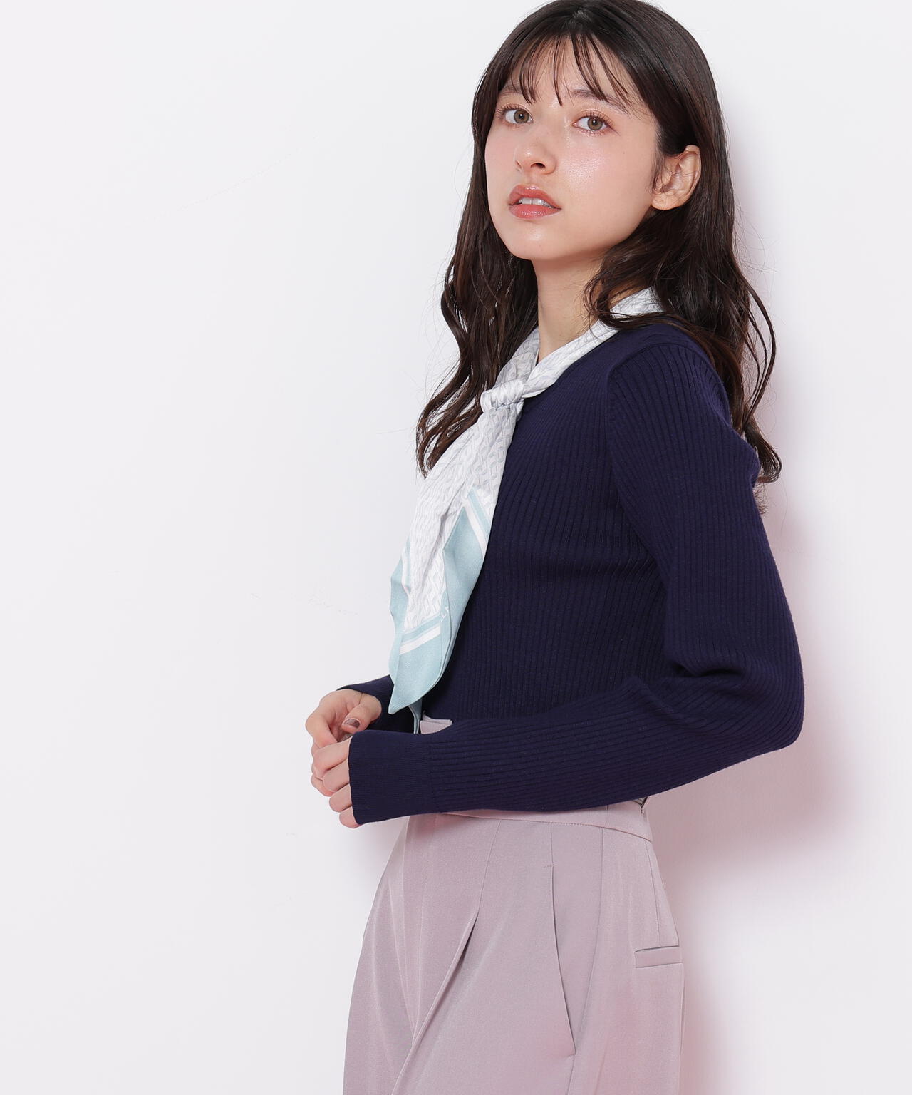 JILL by JILL STUARTオリジナル柄スカーフ付きニット。チェックを幾何学柄風にしてポイントでロゴを入れた、オリジナル柄スカーフです。スカーフはタテに4つ折りしてループに通し、結んでから先を開くとキレイに決まります。後ろのループからスカーフを取ると、ボトルネックのシンプルニットとしても使えるデザイン。ボトムスを選ばず着回せます。ネイビーはトレンドのグリーンカラーをスカーフに取り入ているのでおススメです。※撮影時照明の関係により、色味が違って見える場合がございます。