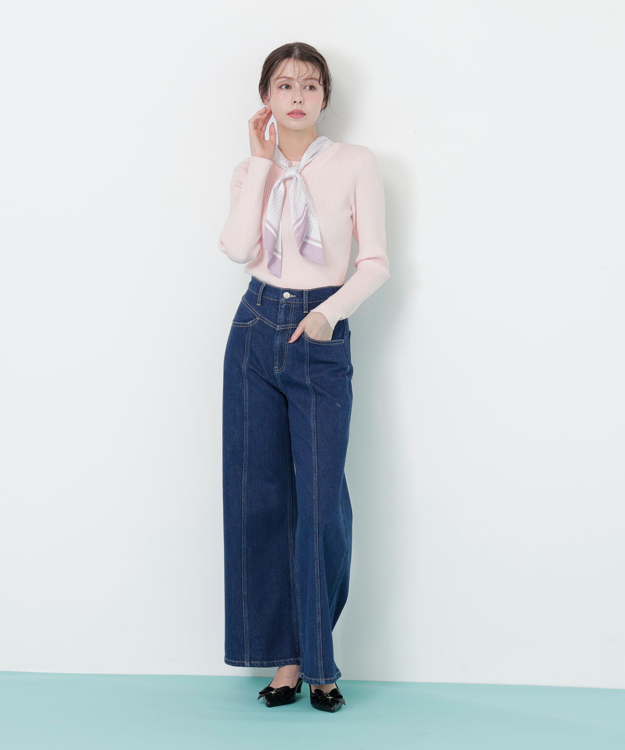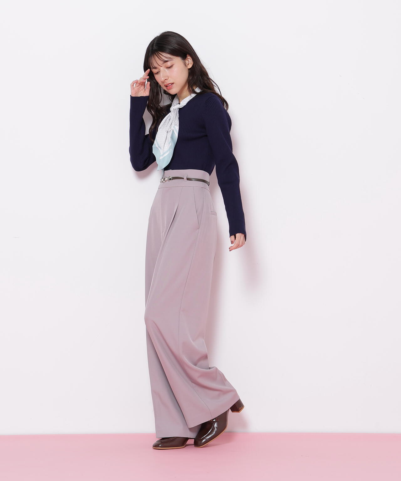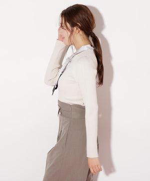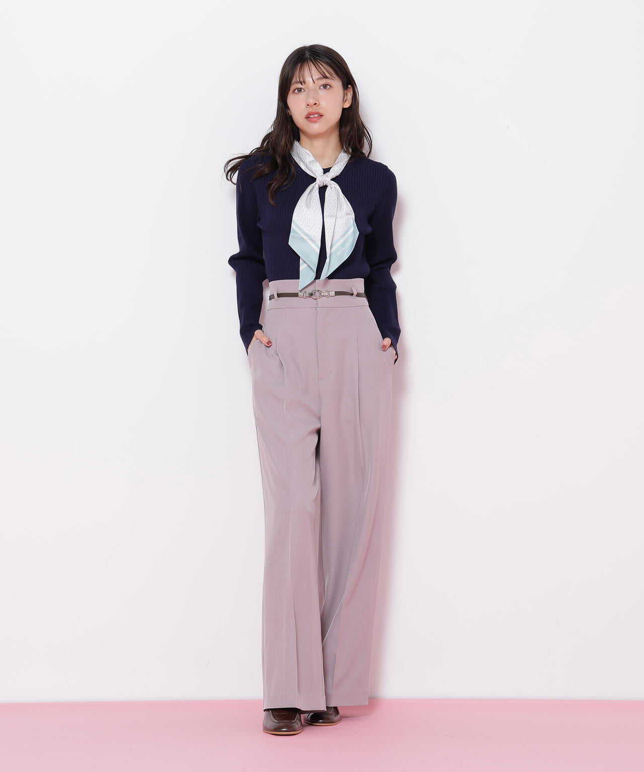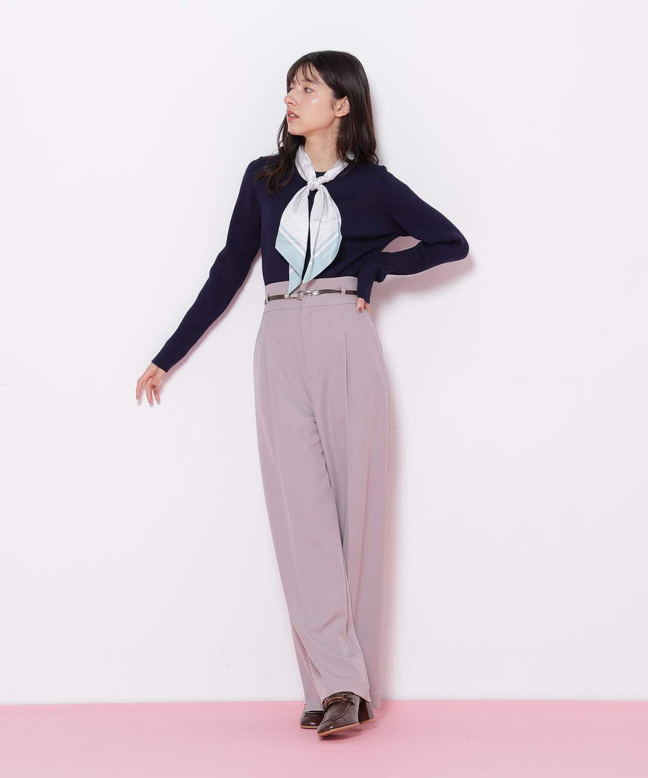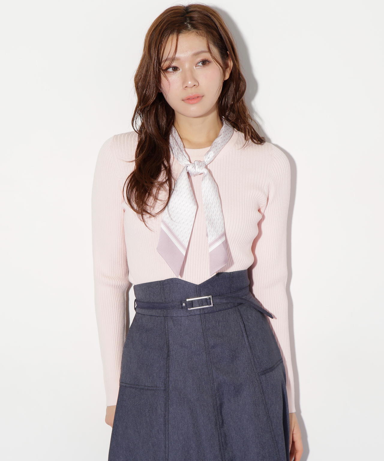 JILL by JILL STUARTオリジナル柄スカーフ付きニット。チェックを幾何学柄風にしてポイントでロゴを入れた、オリジナル柄スカーフです。スカーフはタテに4つ折りしてループに通し、結んでから先を開くとキレイに決まります。後ろのループからスカーフを取ると、ボトルネックのシンプルニットとしても使えるデザイン。ボトムスを選ばず着回せます。ネイビーはトレンドのグリーンカラーをスカーフに取り入ているのでおススメです。※撮影時照明の関係により、色味が違って見える場合がございます。