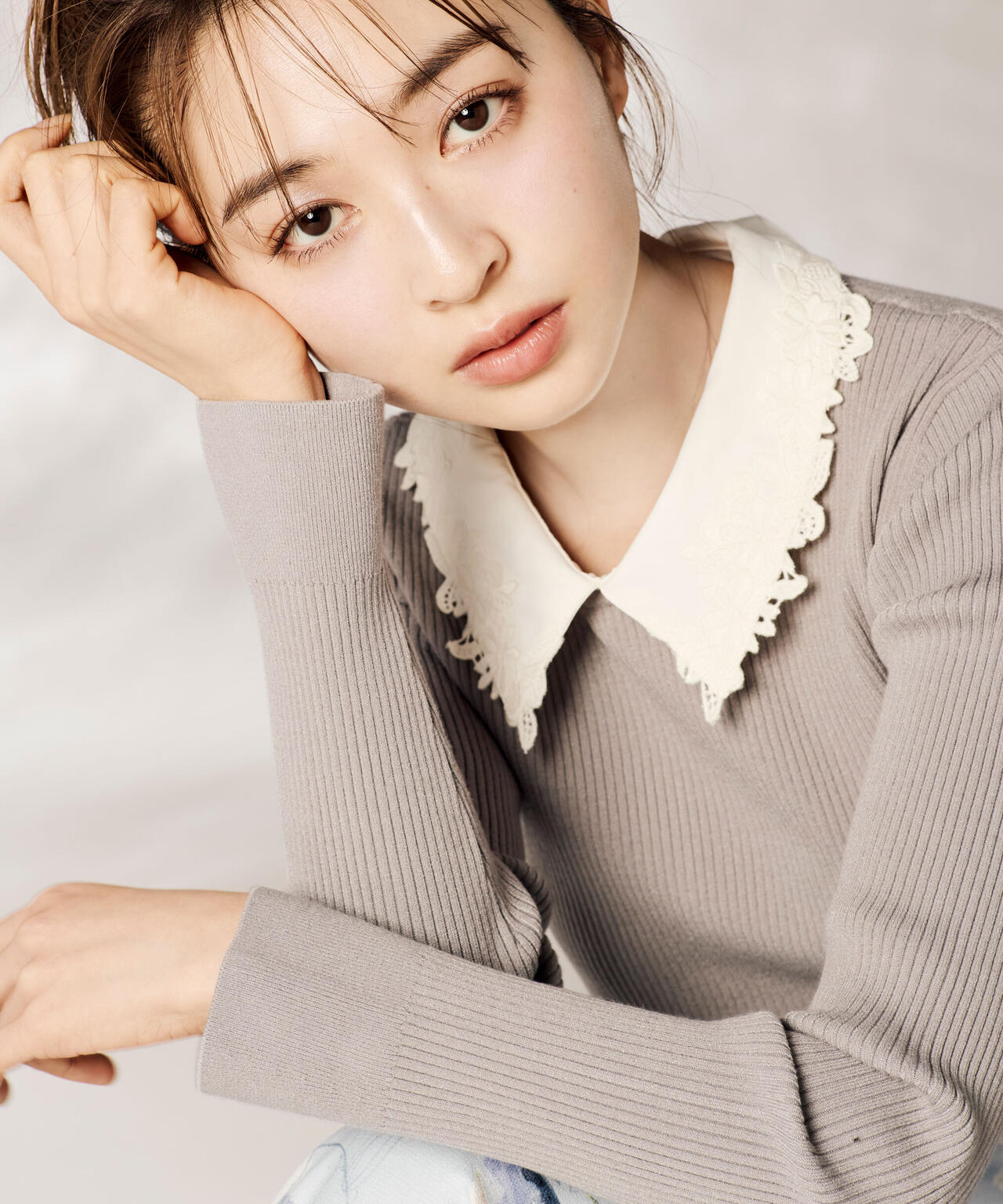 クラシカルな雰囲気の襟付きリブニット。白襟とレースの組み合わせで顔まわりを華やかに演出します。襟は取り外しできるので、シンプルなパワーショルダーのリブニットとしても着られるデザイン。身頃はすっきりシルエットのため、ボトムスにインするとスタイルアップ見えを叶えてくれます。※撮影時照明の関係により、色味が違って見える場合がございます。