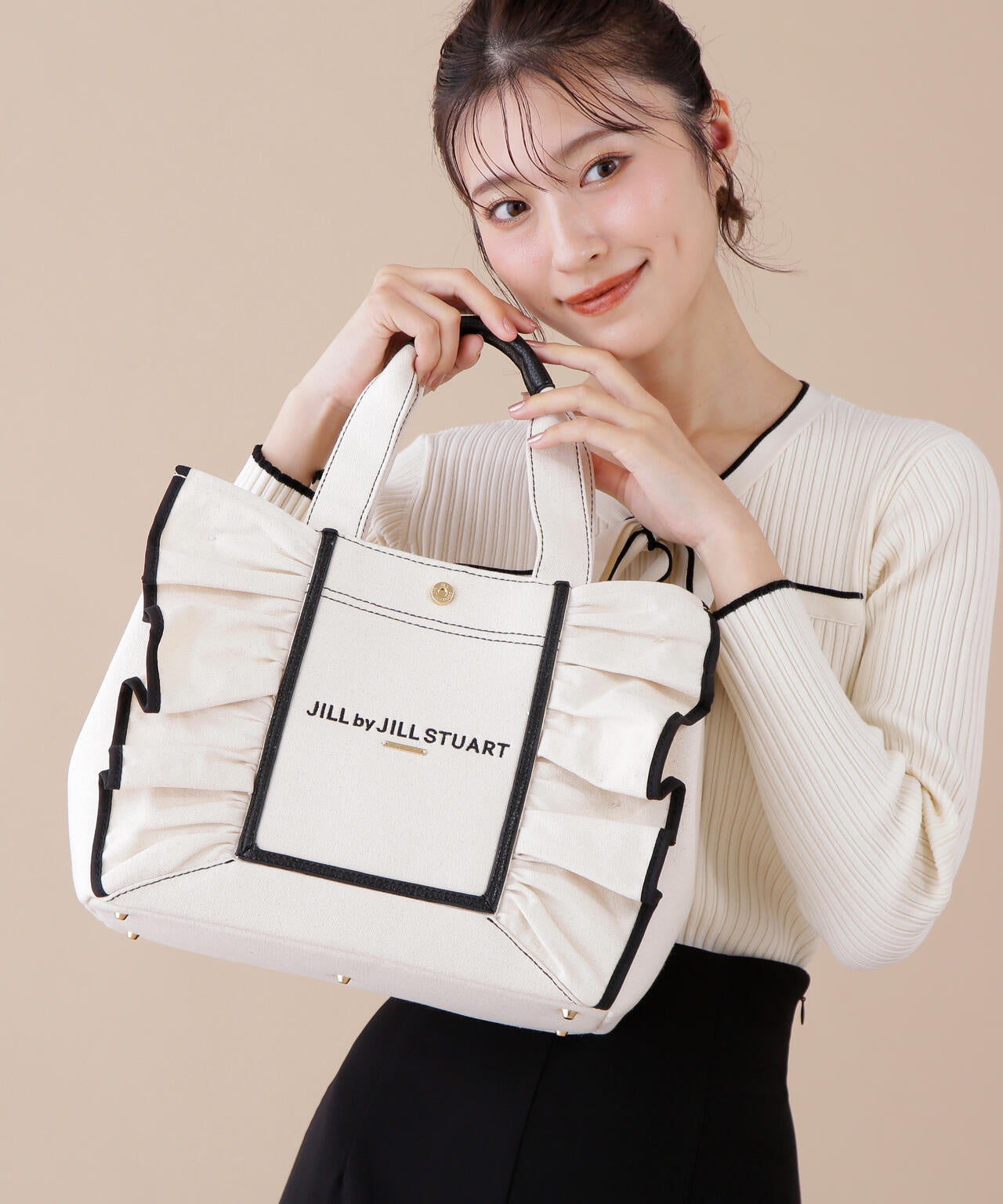 JILL by JILL STUARTのアイコンバッグ「フリルトート」5周年を記念して登場!ボリュームあるワイドフリルと額縁のような配色テープディテールがポイント。従来のフリルバッグとは異なるロゴの書体とサイズ、フリルも大人っぽく仕上げています。ハンドル部分には合皮素材を合わせて、品の良さと実用性も兼ね備えました。両脇にはスナップボタンが付いているので、荷物の収納量に合わせてフォルム調節ができます。中は便利なポケット付き。※撮影時照明の関係により、色味が違って見える場合がございます。