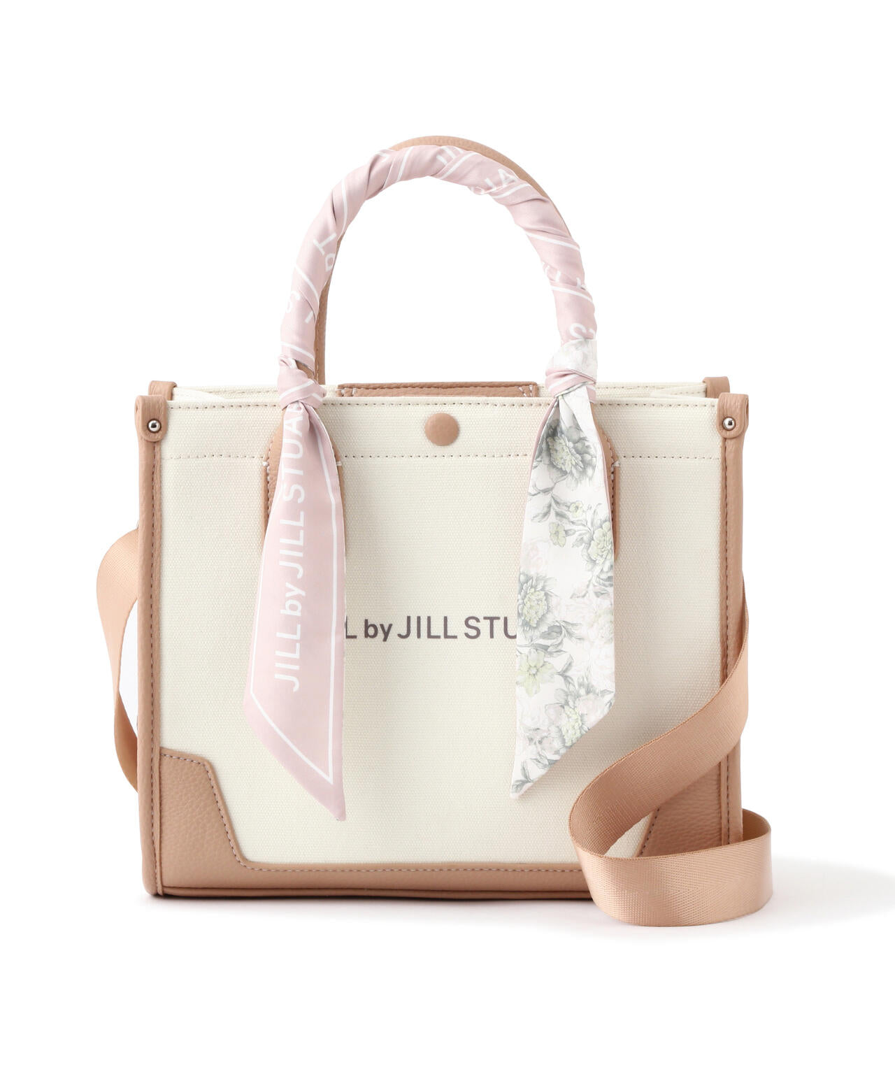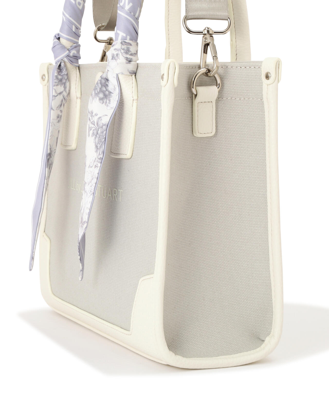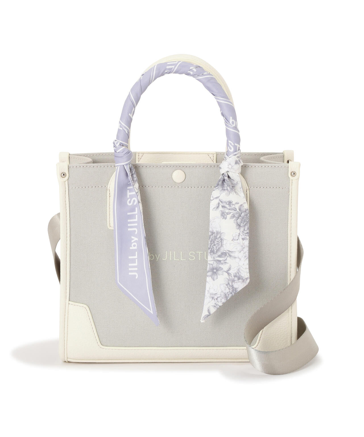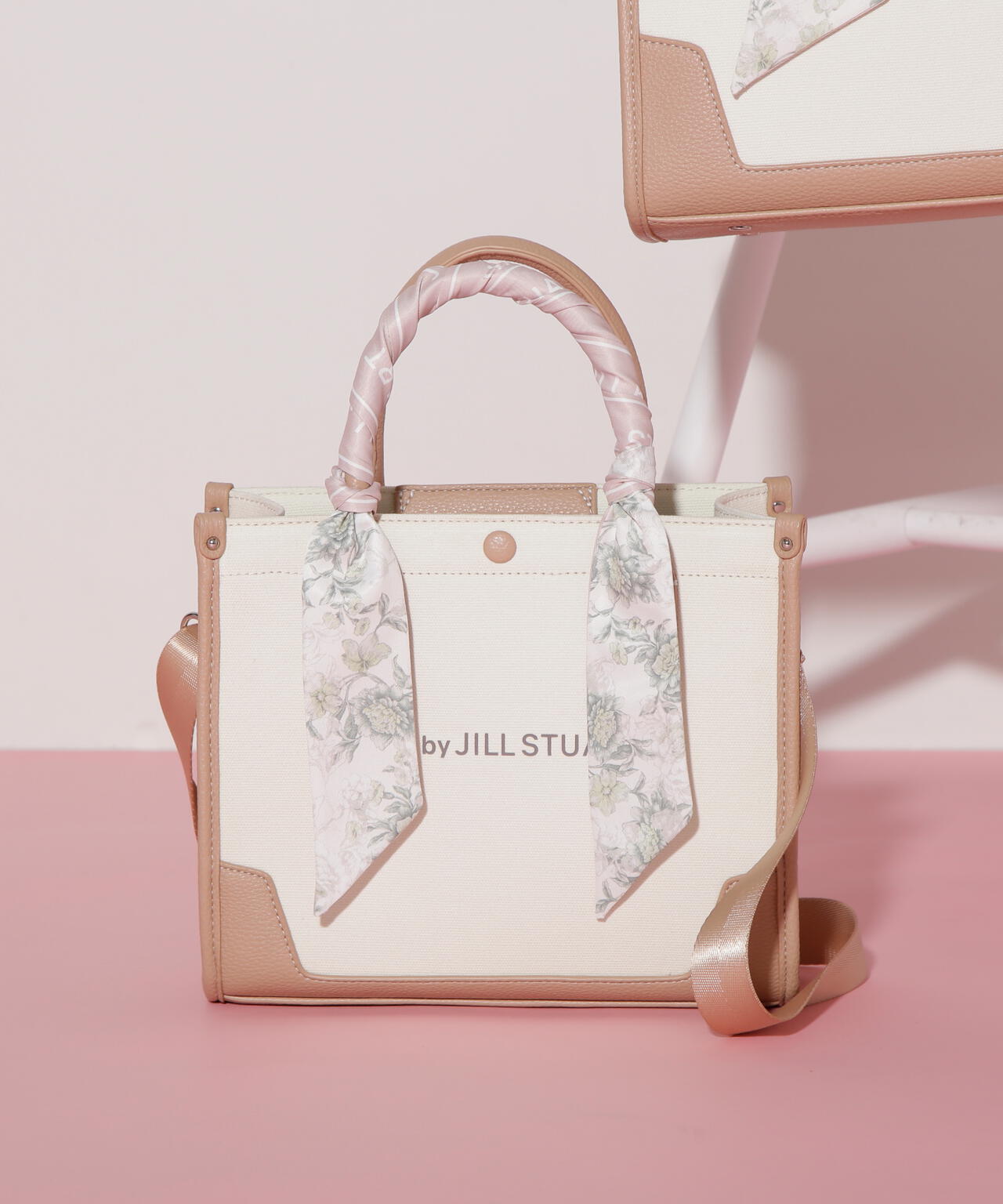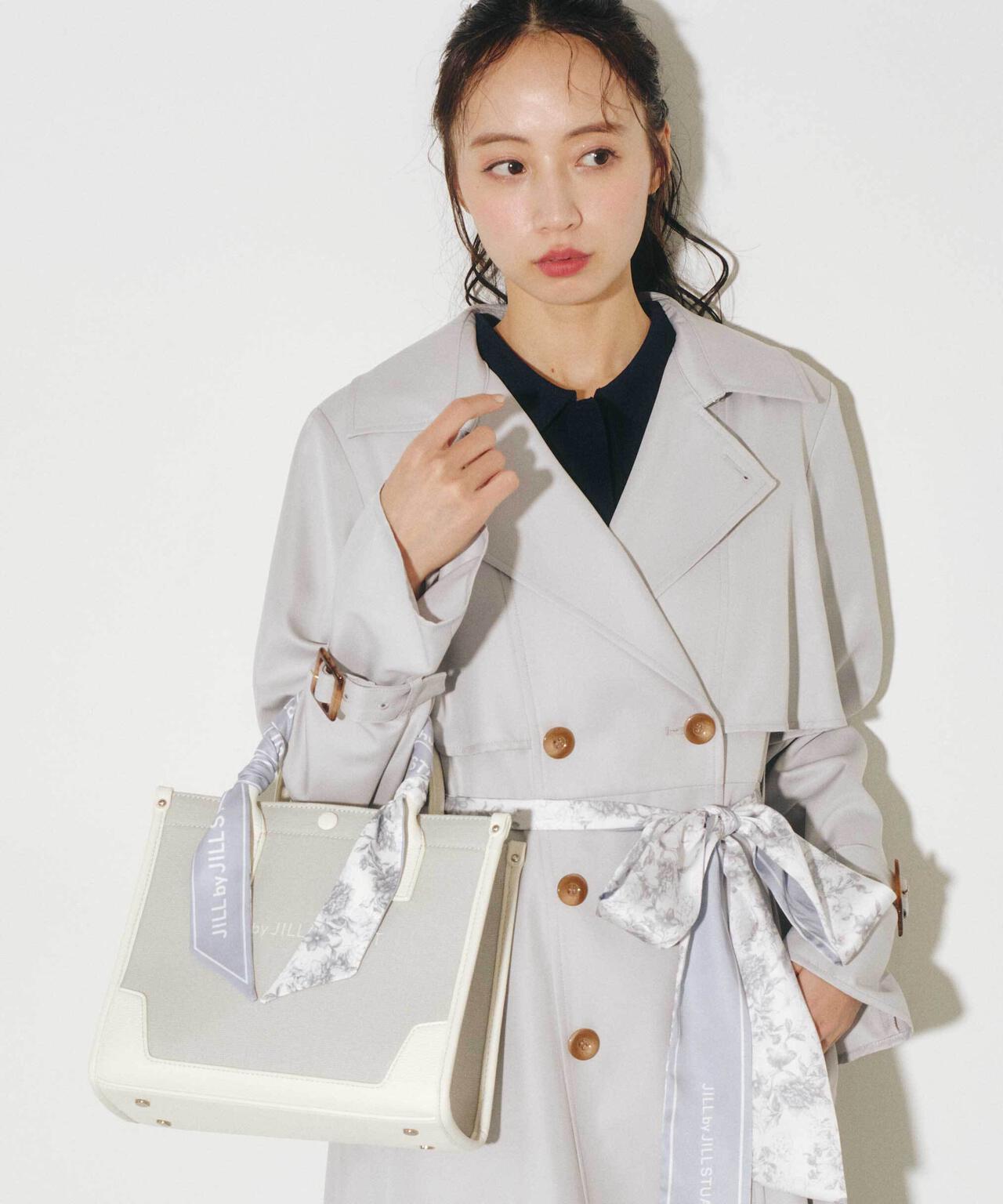 JILL by JILL STUARTのスカーフ付きトートバッグ。こちらは小さいサイズで、貴重品をはじめ文庫本などが収納できます。口元は中身を隠せるフラップマグネットボタン開閉。小分け収納に便利なアウトポケット1つ、ファスナーポケット1つ。異素材のハンドル使いやボディは、キレイに縁取りされているため、しっかりとしたフォルムと扱いやすさが魅力。持ち手は、花柄×ロゴ入りスカーフがアクセントになります。この春ご用意している(スカーフ付きトレンチコート店舗商品番号125-5151002)とスカーフは同じ柄を使用しています。ショルダーベルトは取り外しできる2Way仕様です。※撮影時照明の関係により、色味が違って見える場合がございます。