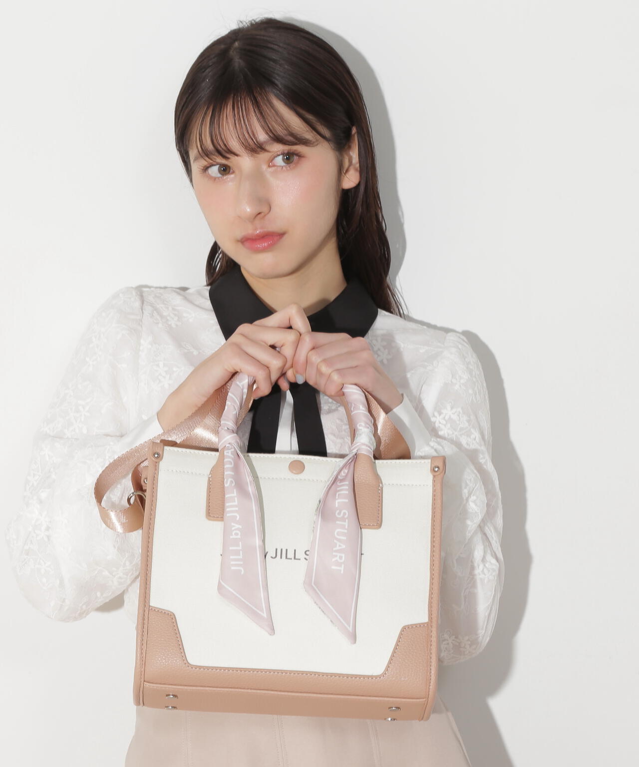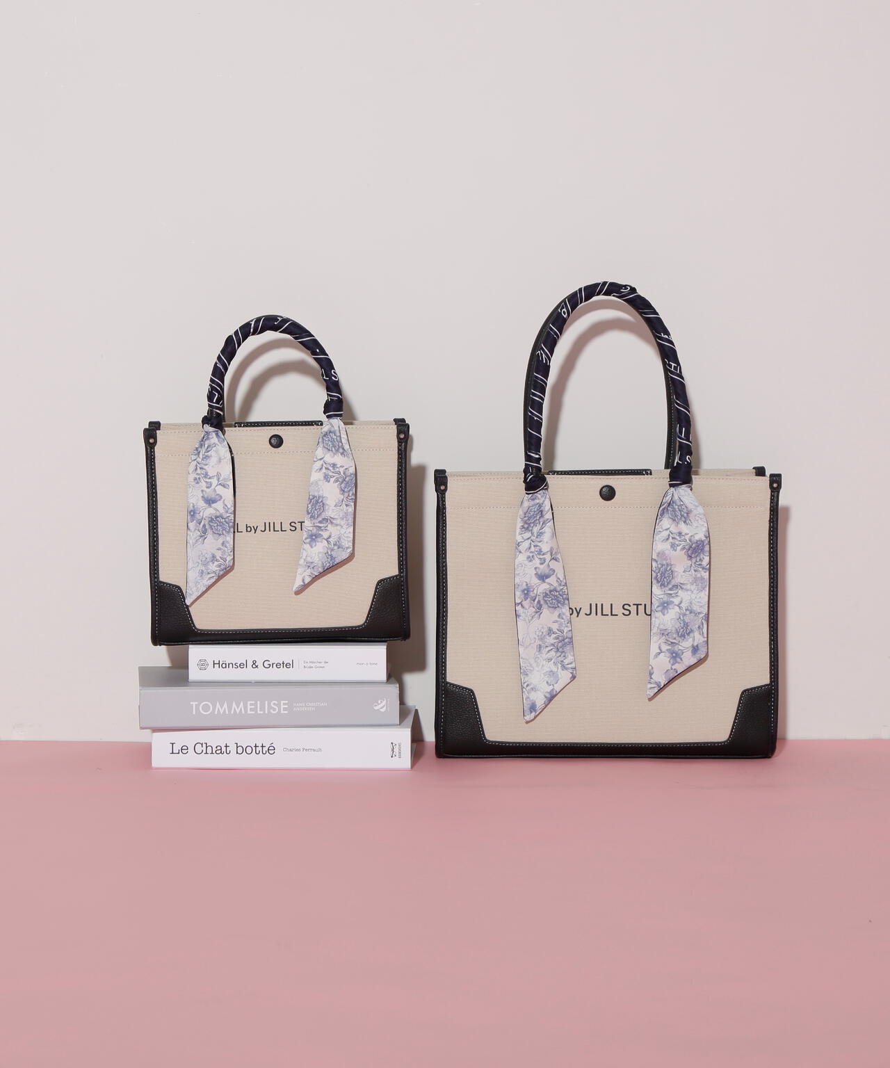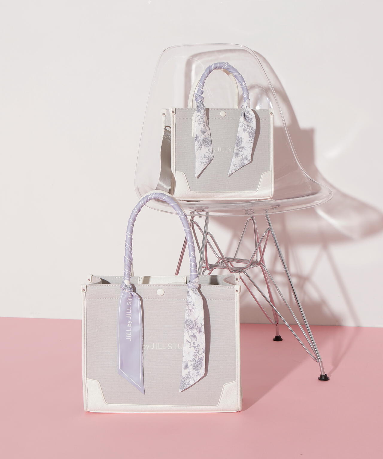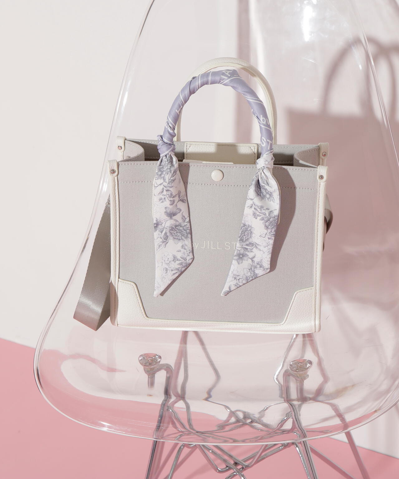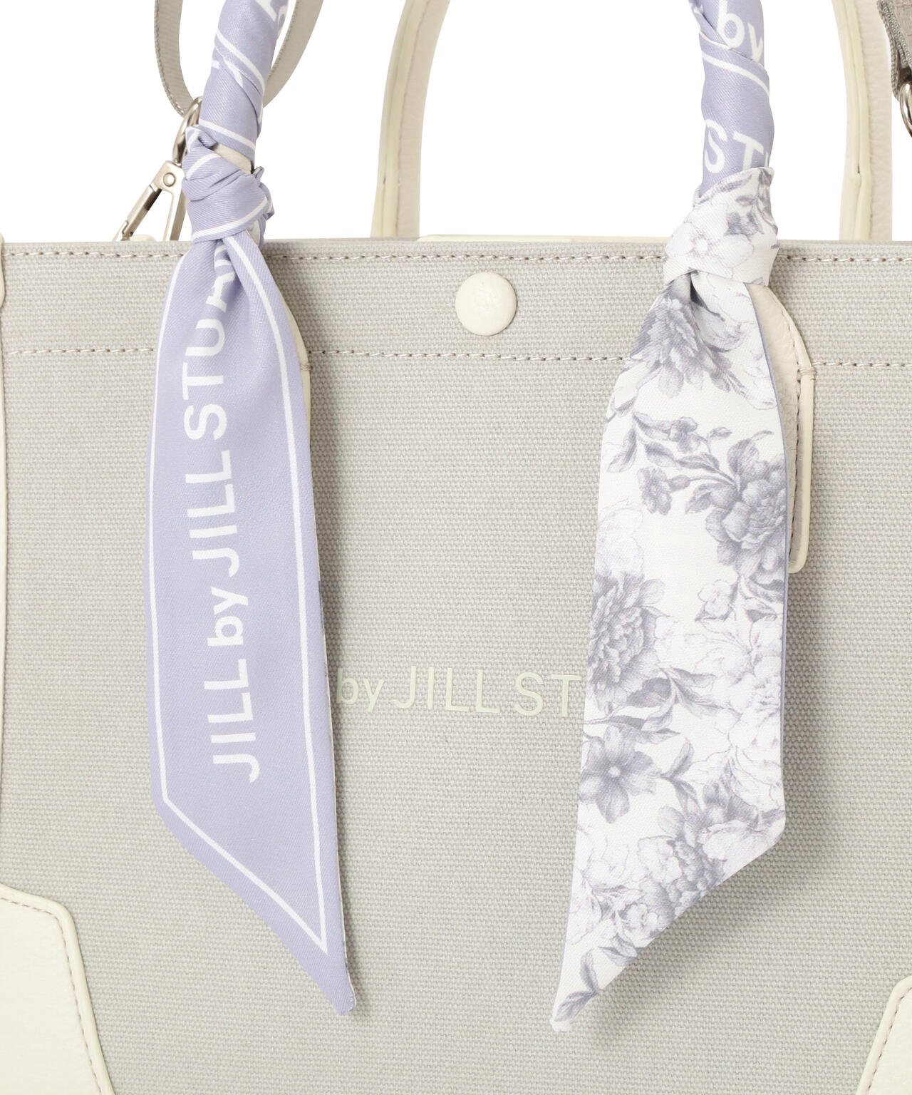 JILL by JILL STUARTのスカーフ付きトートバッグ。こちらは小さいサイズで、貴重品をはじめ文庫本などが収納できます。口元は中身を隠せるフラップマグネットボタン開閉。小分け収納に便利なアウトポケット1つ、ファスナーポケット1つ。異素材のハンドル使いやボディは、キレイに縁取りされているため、しっかりとしたフォルムと扱いやすさが魅力。持ち手は、花柄×ロゴ入りスカーフがアクセントになります。この春ご用意している(スカーフ付きトレンチコート店舗商品番号125-5151002)とスカーフは同じ柄を使用しています。ショルダーベルトは取り外しできる2Way仕様です。※撮影時照明の関係により、色味が違って見える場合がございます。