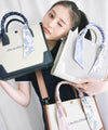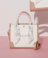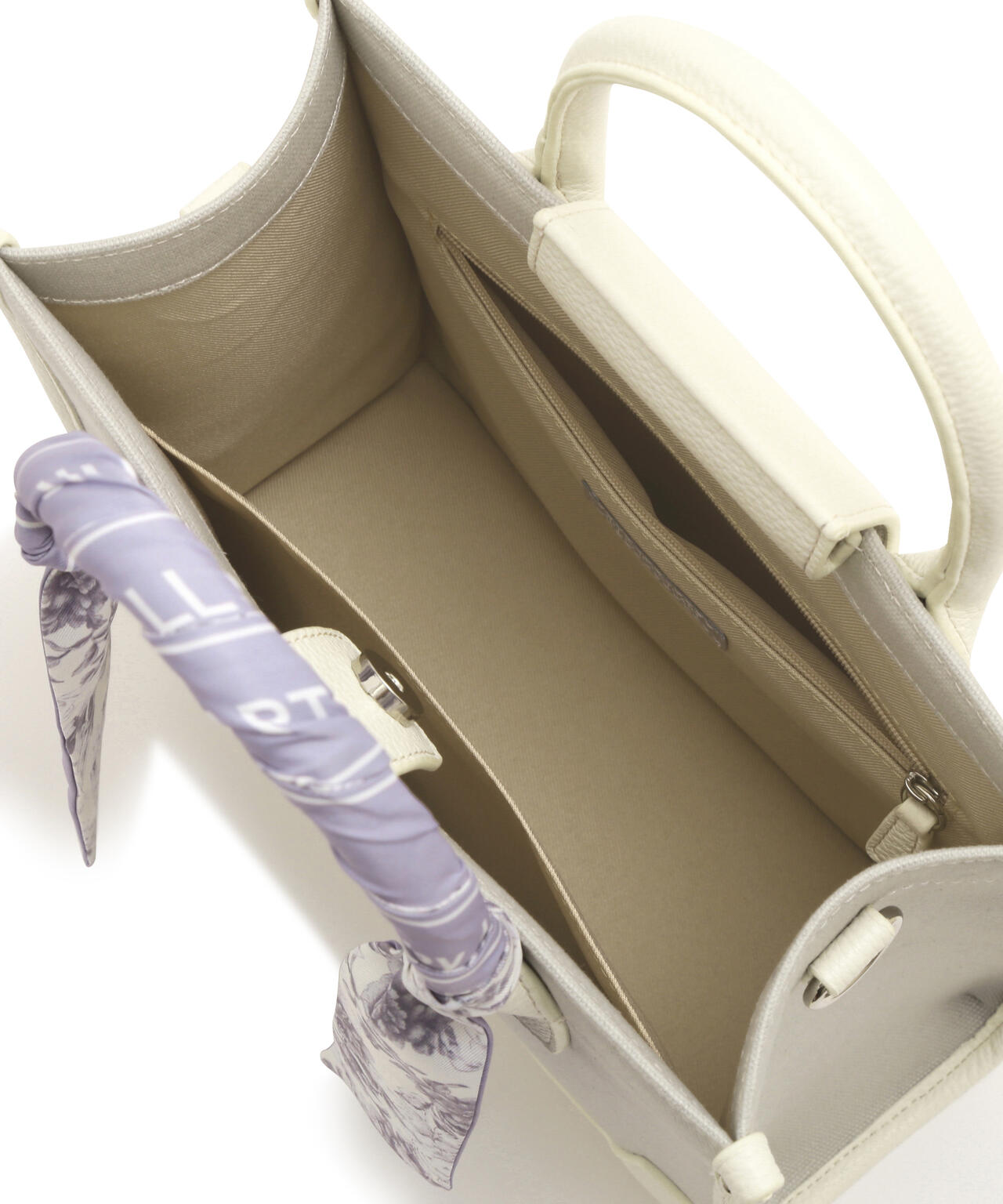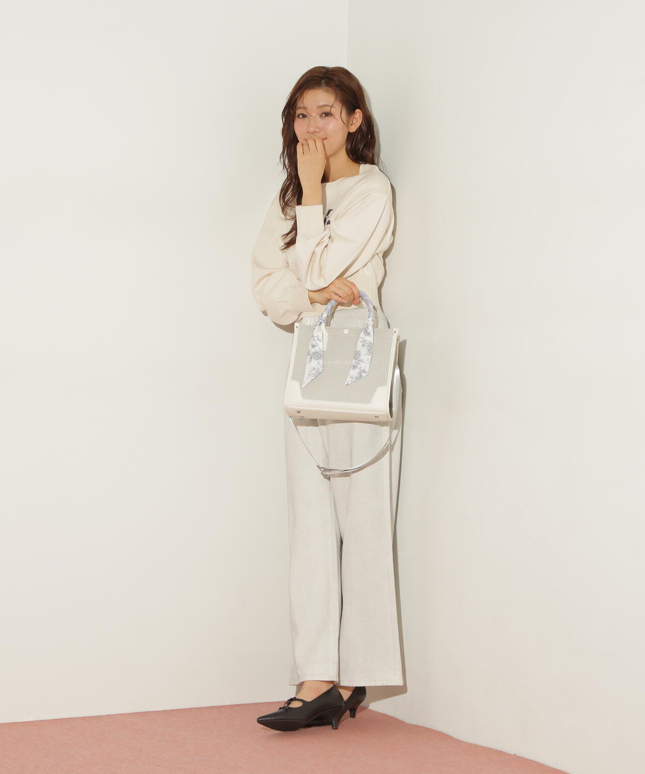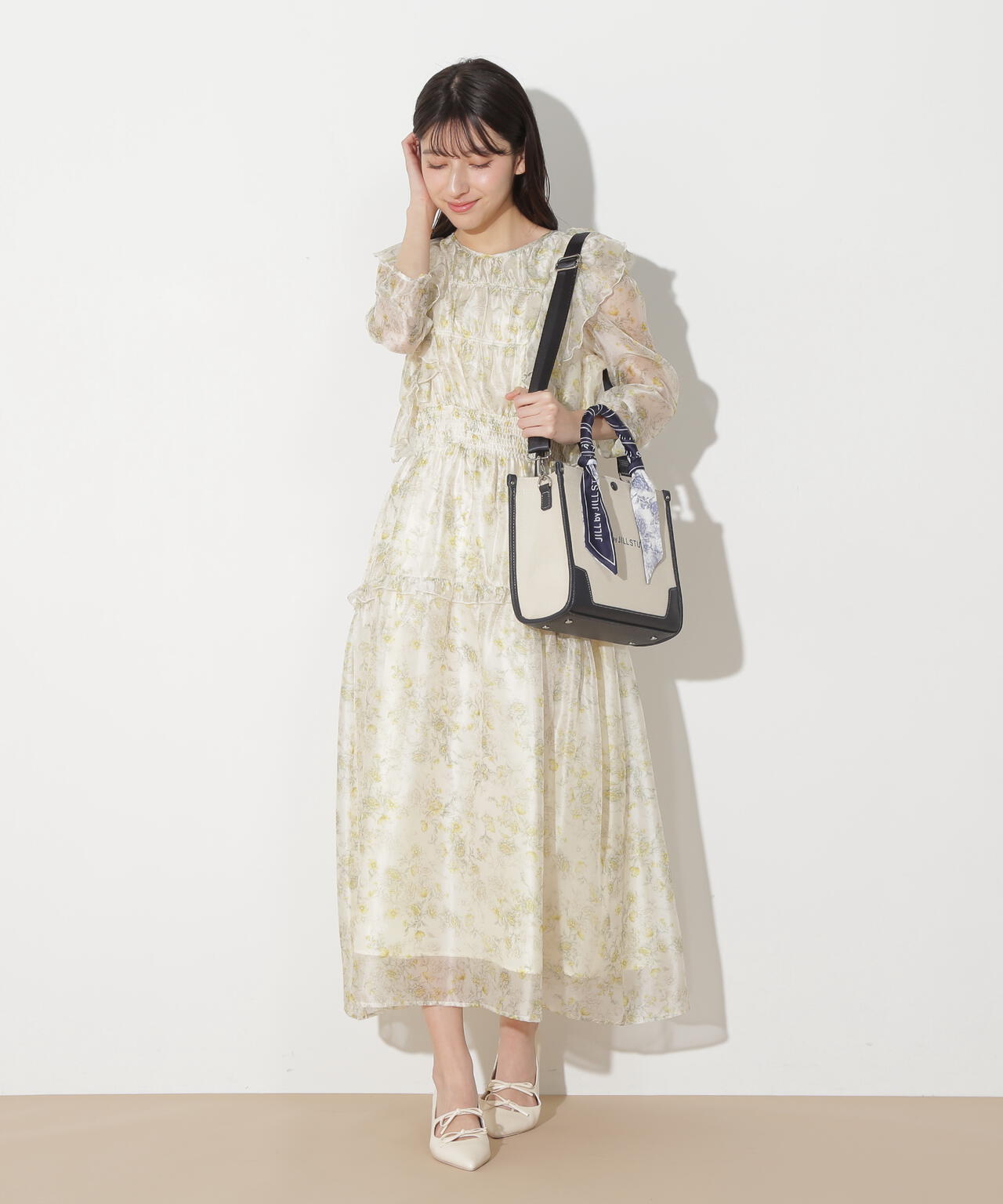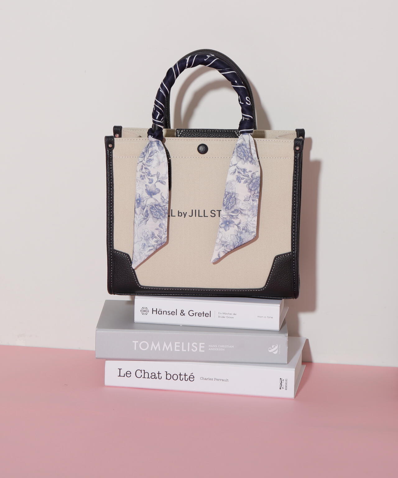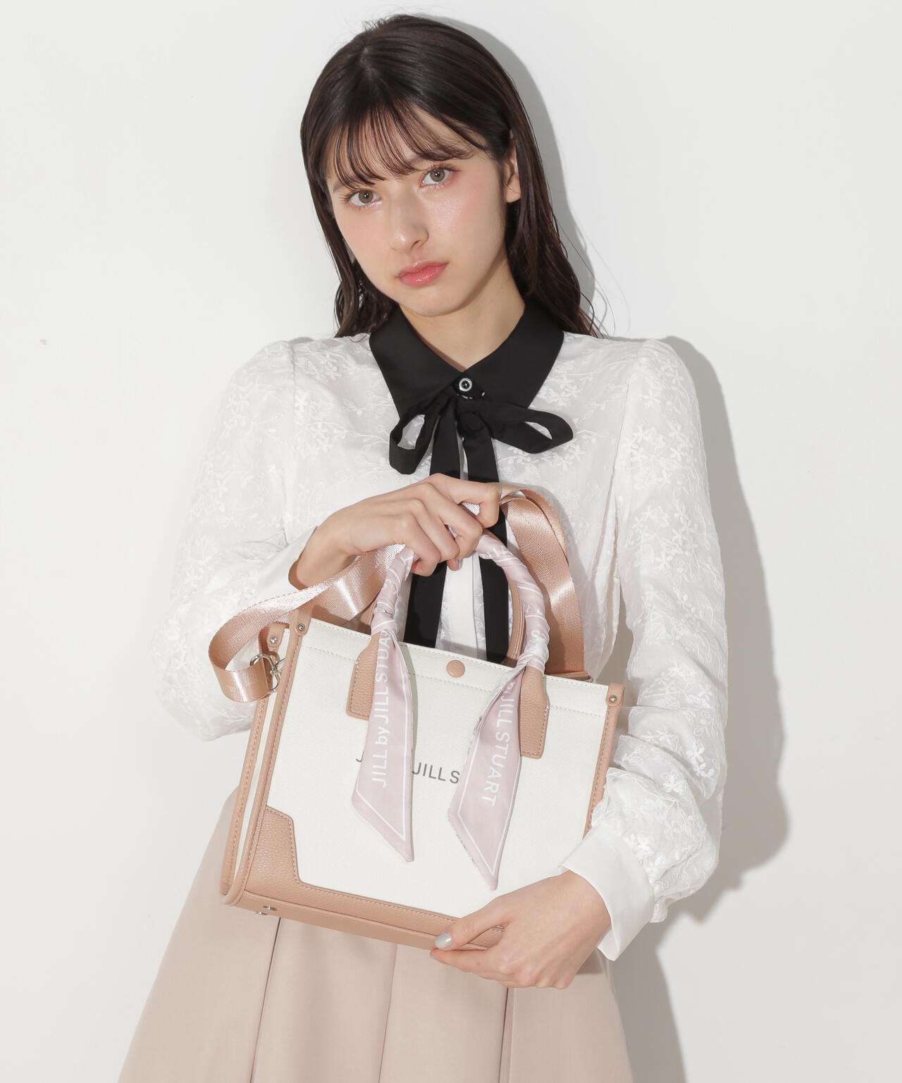 JILL by JILL STUARTのスカーフ付きトートバッグ。こちらは小さいサイズで、貴重品をはじめ文庫本などが収納できます。口元は中身を隠せるフラップマグネットボタン開閉。小分け収納に便利なアウトポケット1つ、ファスナーポケット1つ。異素材のハンドル使いやボディは、キレイに縁取りされているため、しっかりとしたフォルムと扱いやすさが魅力。持ち手は、花柄×ロゴ入りスカーフがアクセントになります。この春ご用意している(スカーフ付きトレンチコート店舗商品番号125-5151002)とスカーフは同じ柄を使用しています。ショルダーベルトは取り外しできる2Way仕様です。※撮影時照明の関係により、色味が違って見える場合がございます。