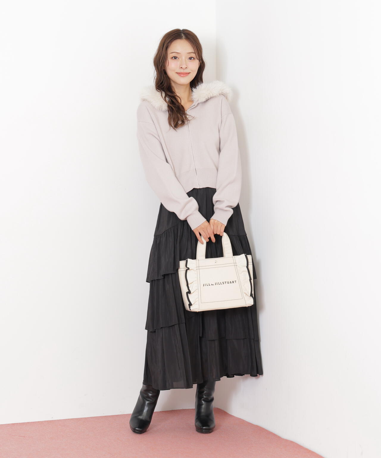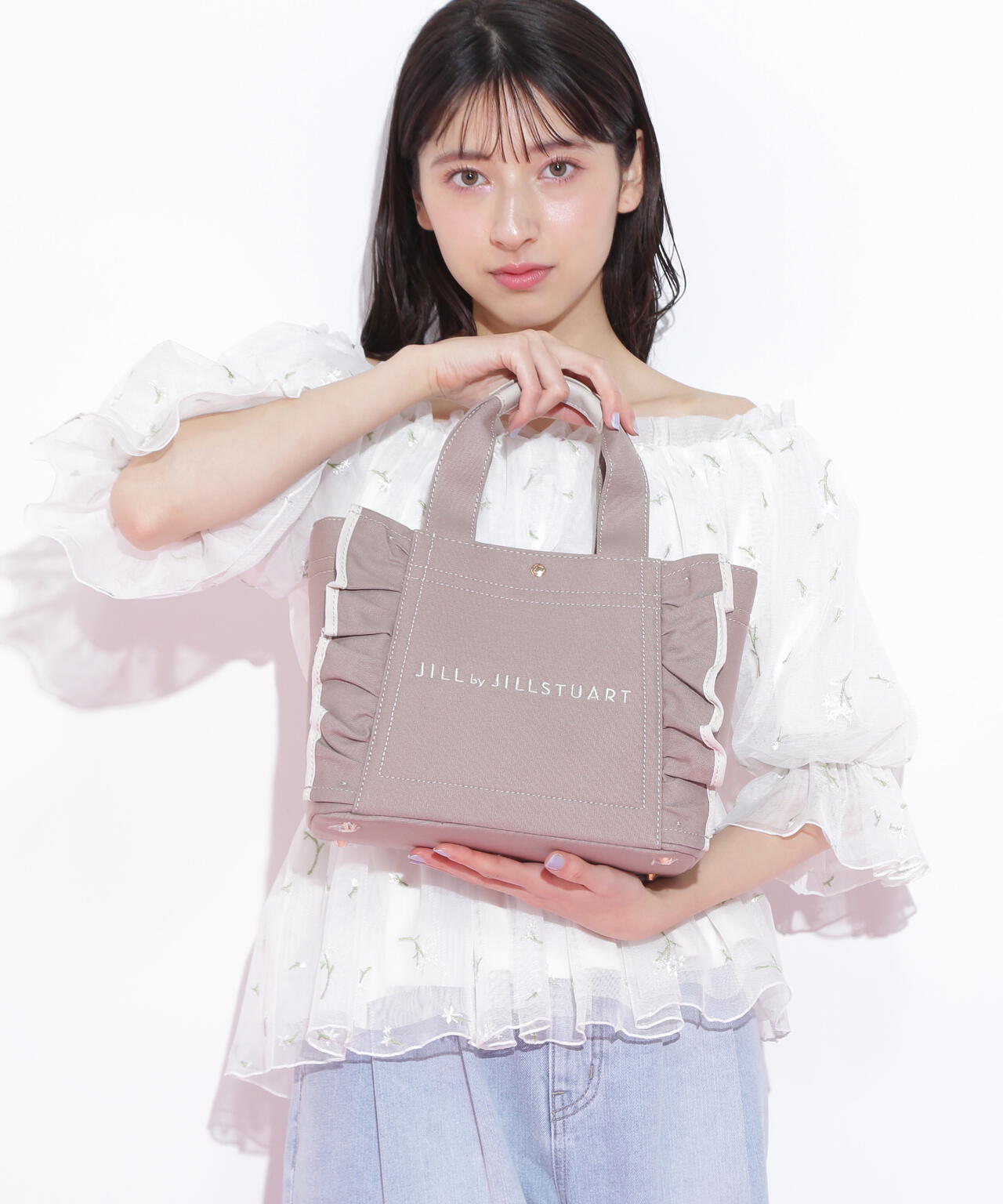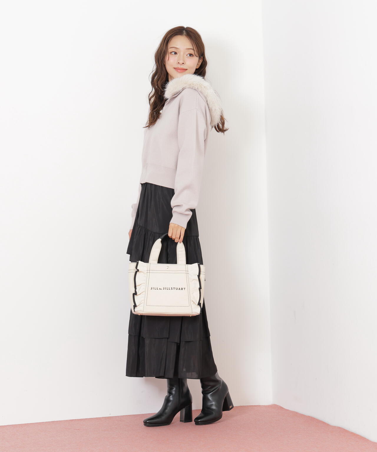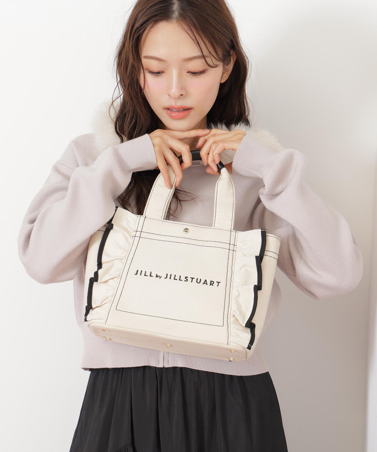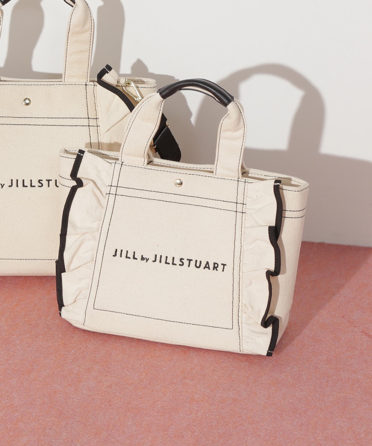 JILL by JILL STUARTで大人気のフリルトートバッグ。立体的なフリルディテールにパイピングをきかせたキュートなデザイン。スクエア型の小ぶりなシルエットながら、マチがしっかりあり普段使いにおススメ。ハンドル部分には合皮素材を合わせて、品の良さと実用性も兼ね備えました。※撮影時照明の関係により、色味が違って見える場合がございます。