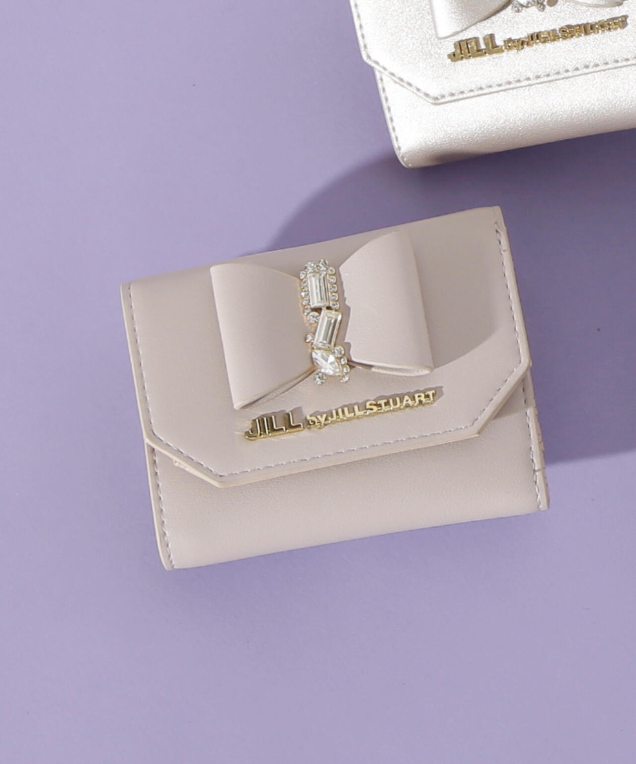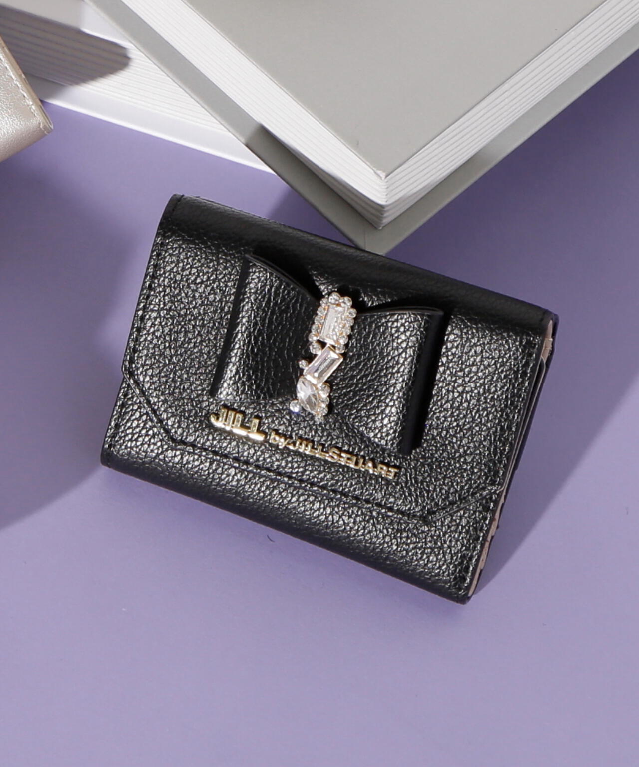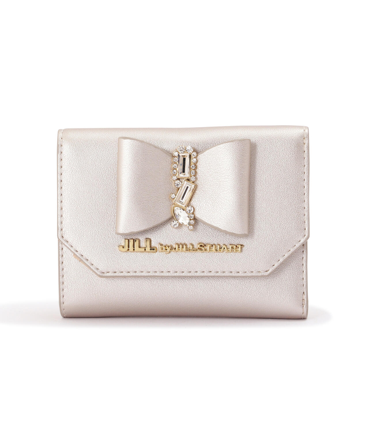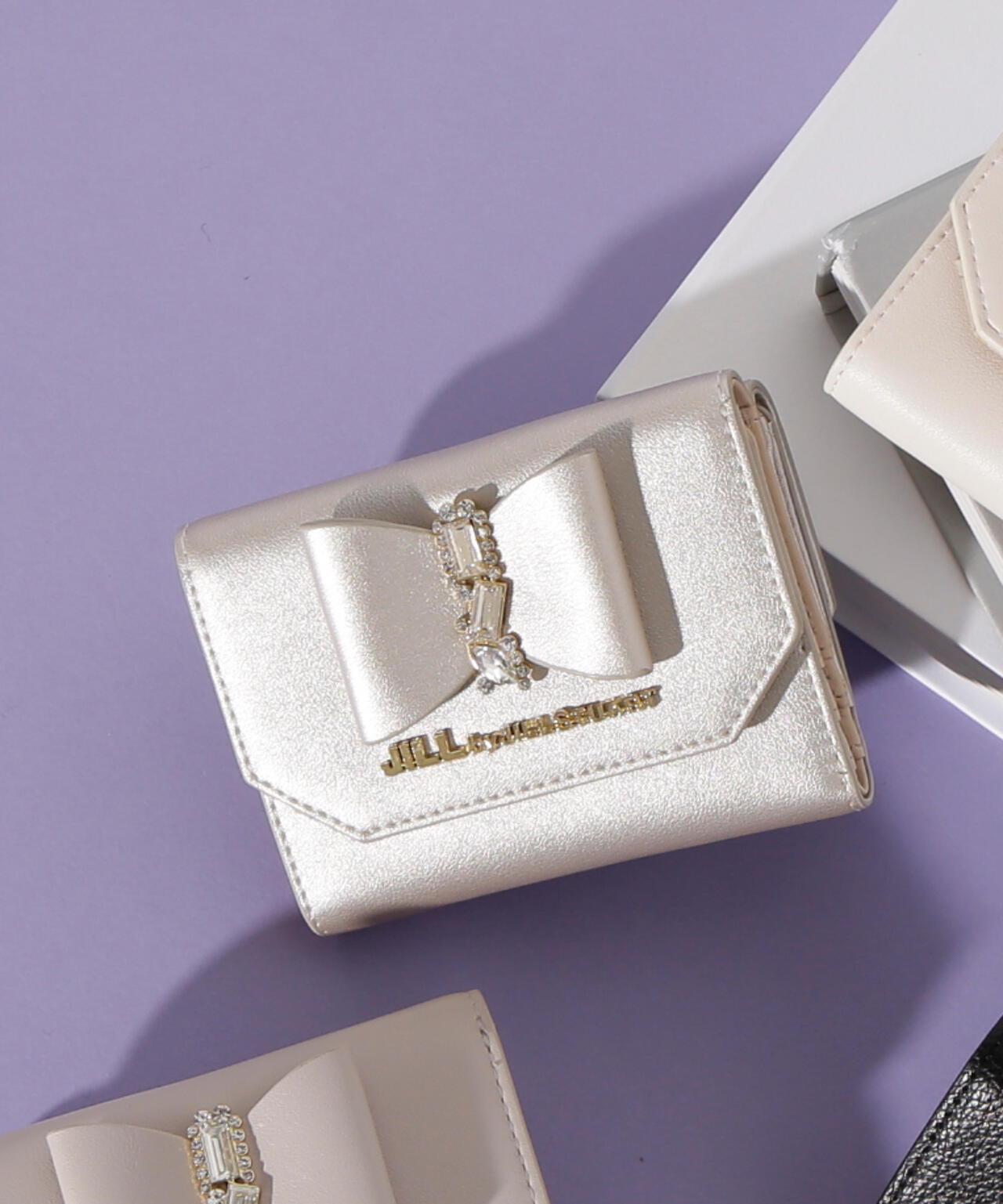 きらめく装飾でリボンをデコレーションしたレディライクなミニ財布。スナップボタン開閉でコインケース、紙幣とカード類を入れられる便利なデザインです。小さいバッグの中に入れやすい三つ折りのコンパクトなサイズなので、すっきり持ちたい方にもお勧めです。※撮影時照明の関係により、色味が違って見える場合がございます。
