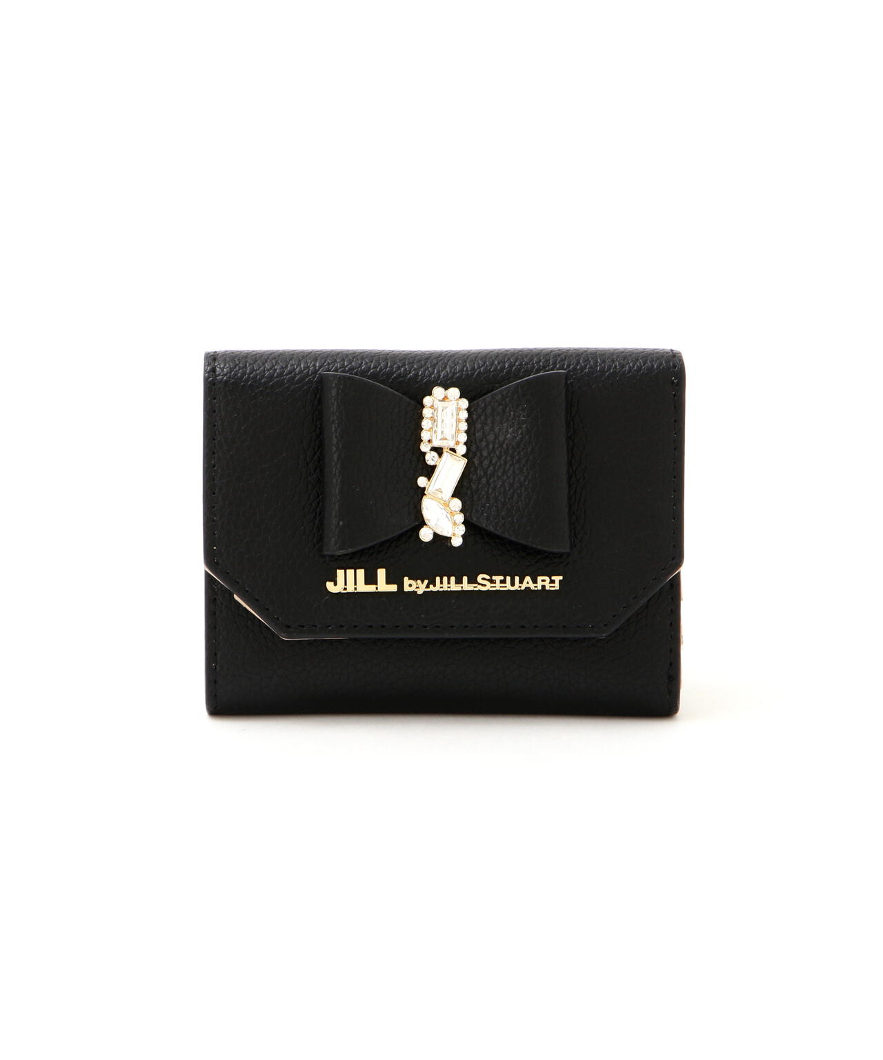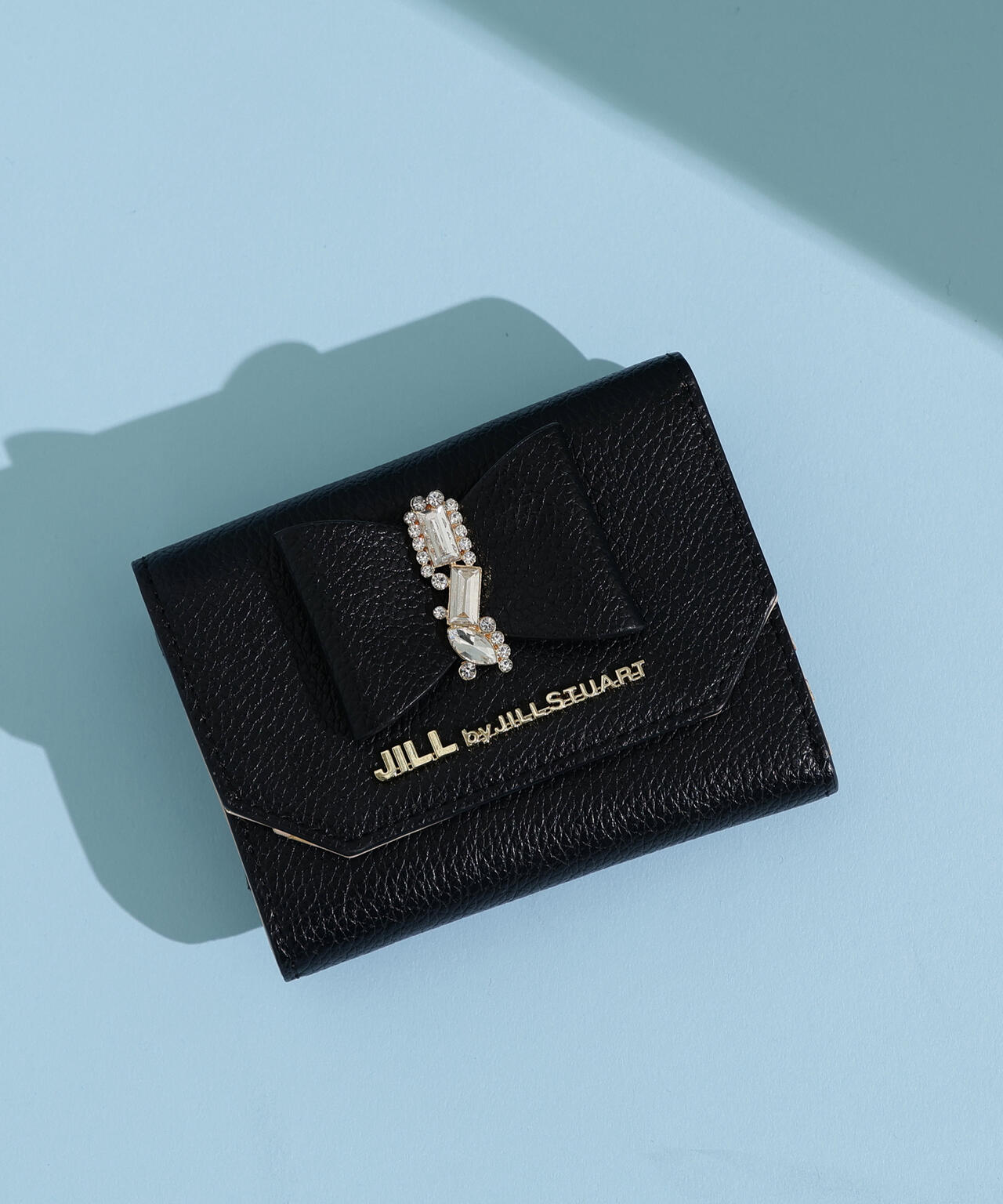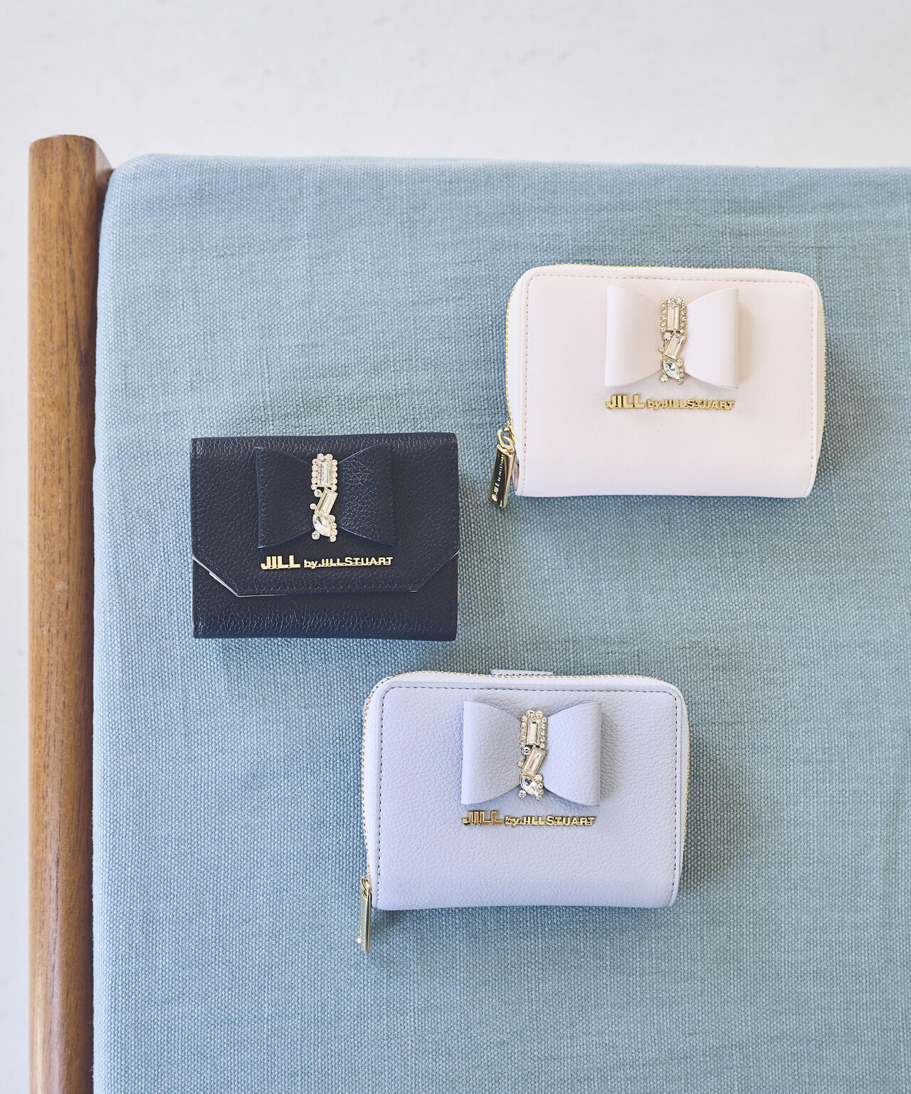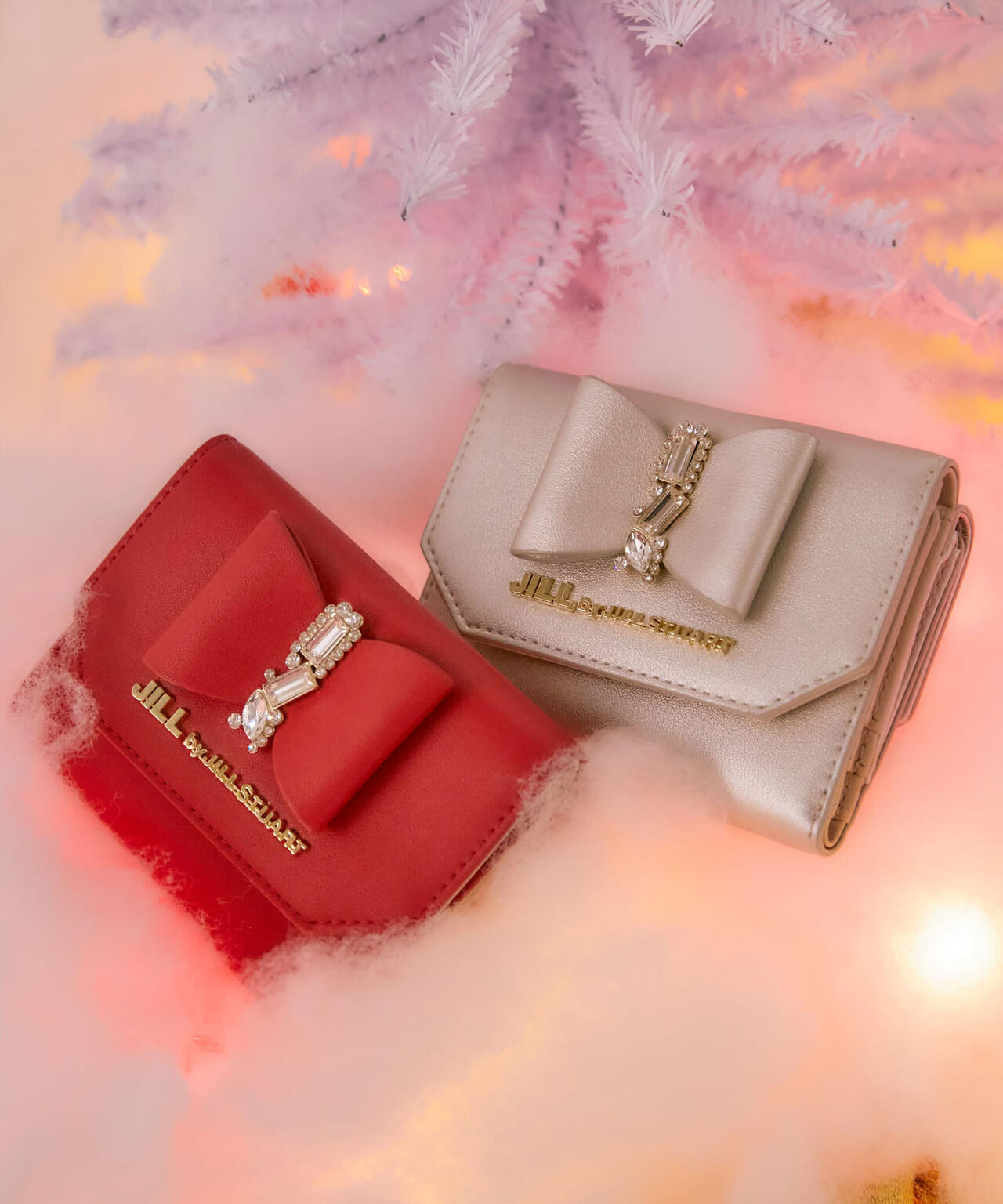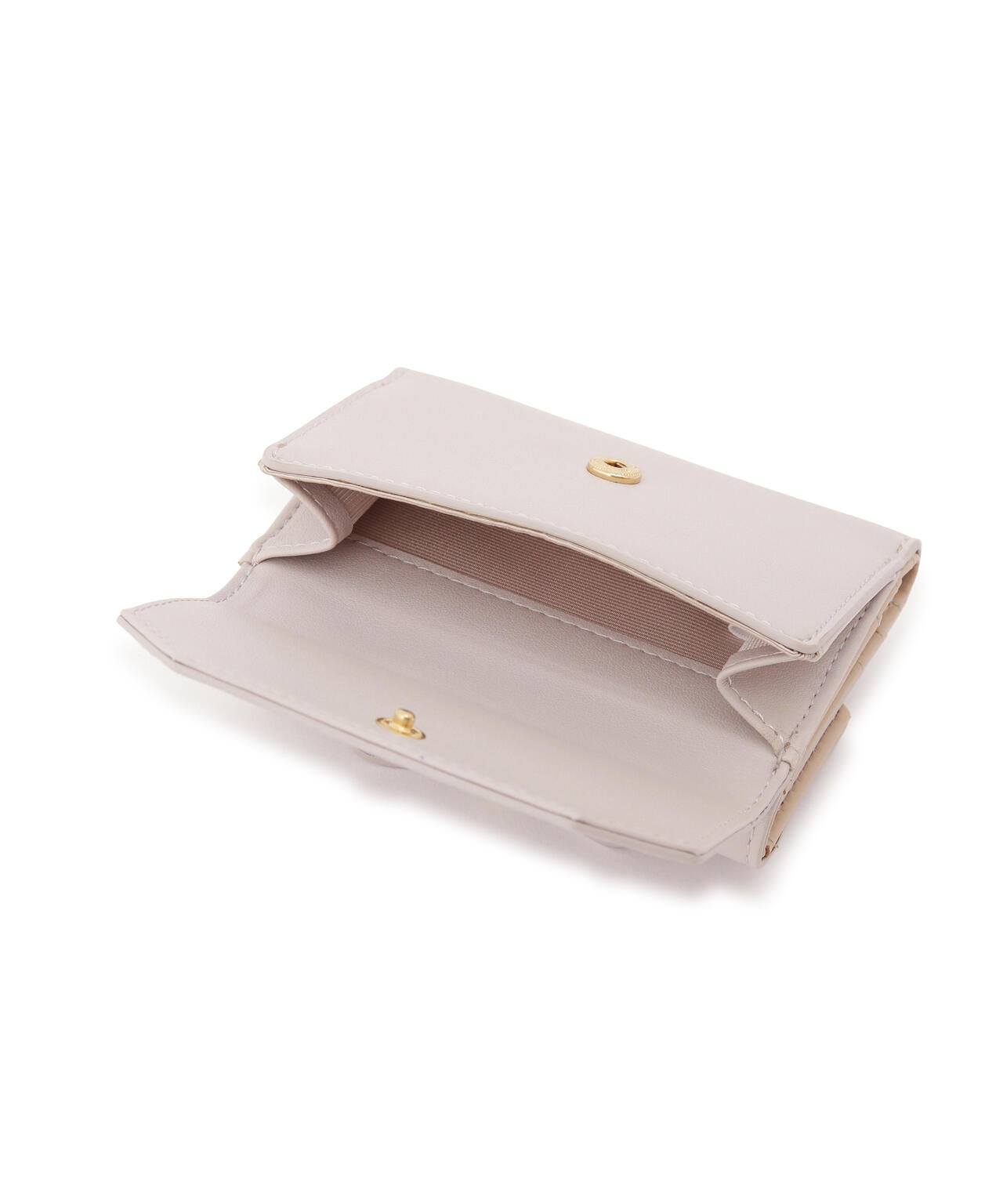 きらめく装飾でリボンをデコレーションしたレディライクなミニ財布。スナップボタン開閉でコインケース、紙幣とカード類を入れられる便利なデザインです。小さいバッグの中に入れやすい三つ折りのコンパクトなサイズなので、すっきり持ちたい方にもお勧めです。※撮影時照明の関係により、色味が違って見える場合がございます。