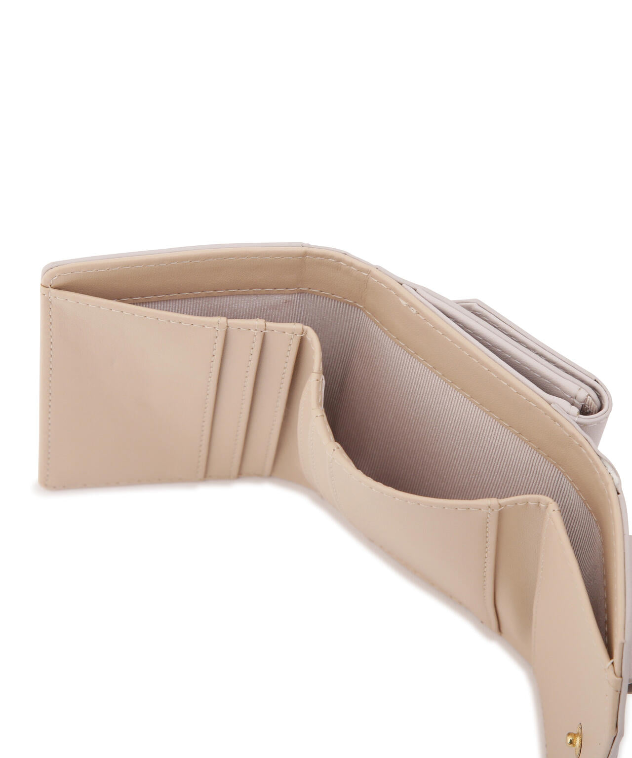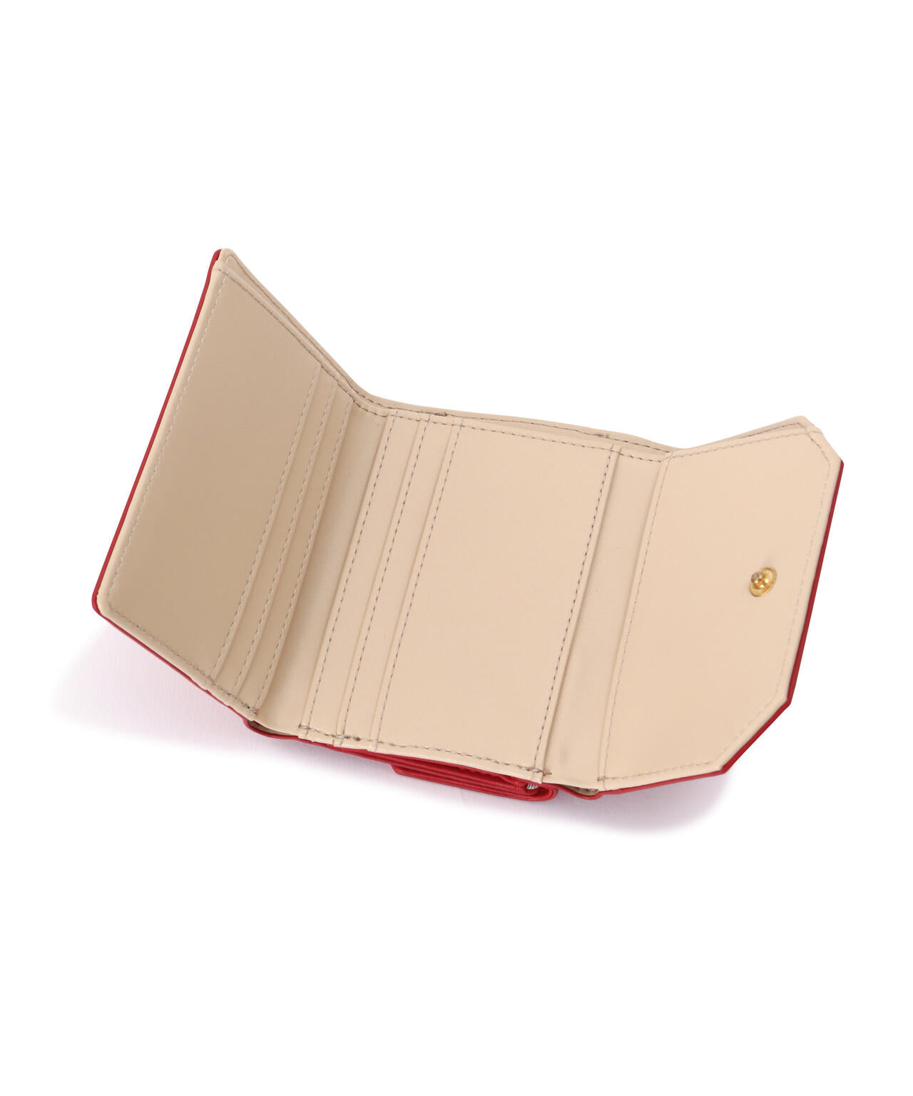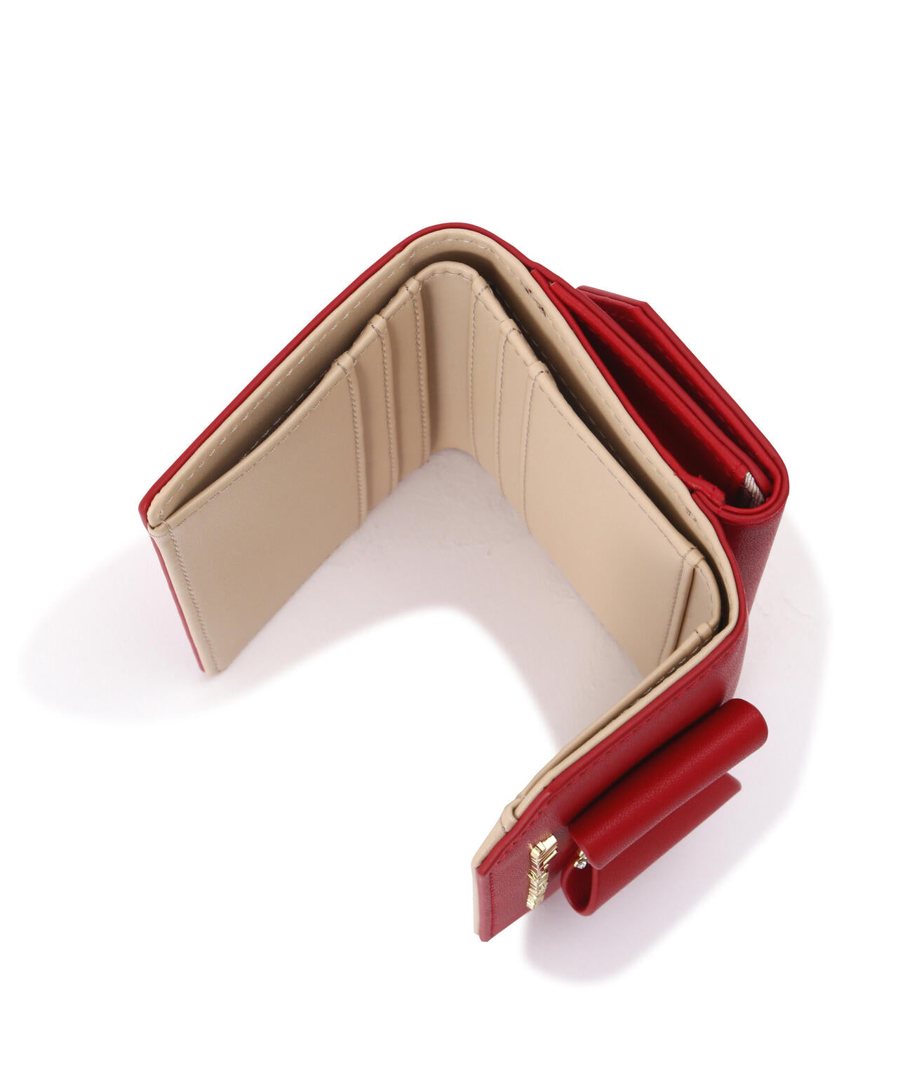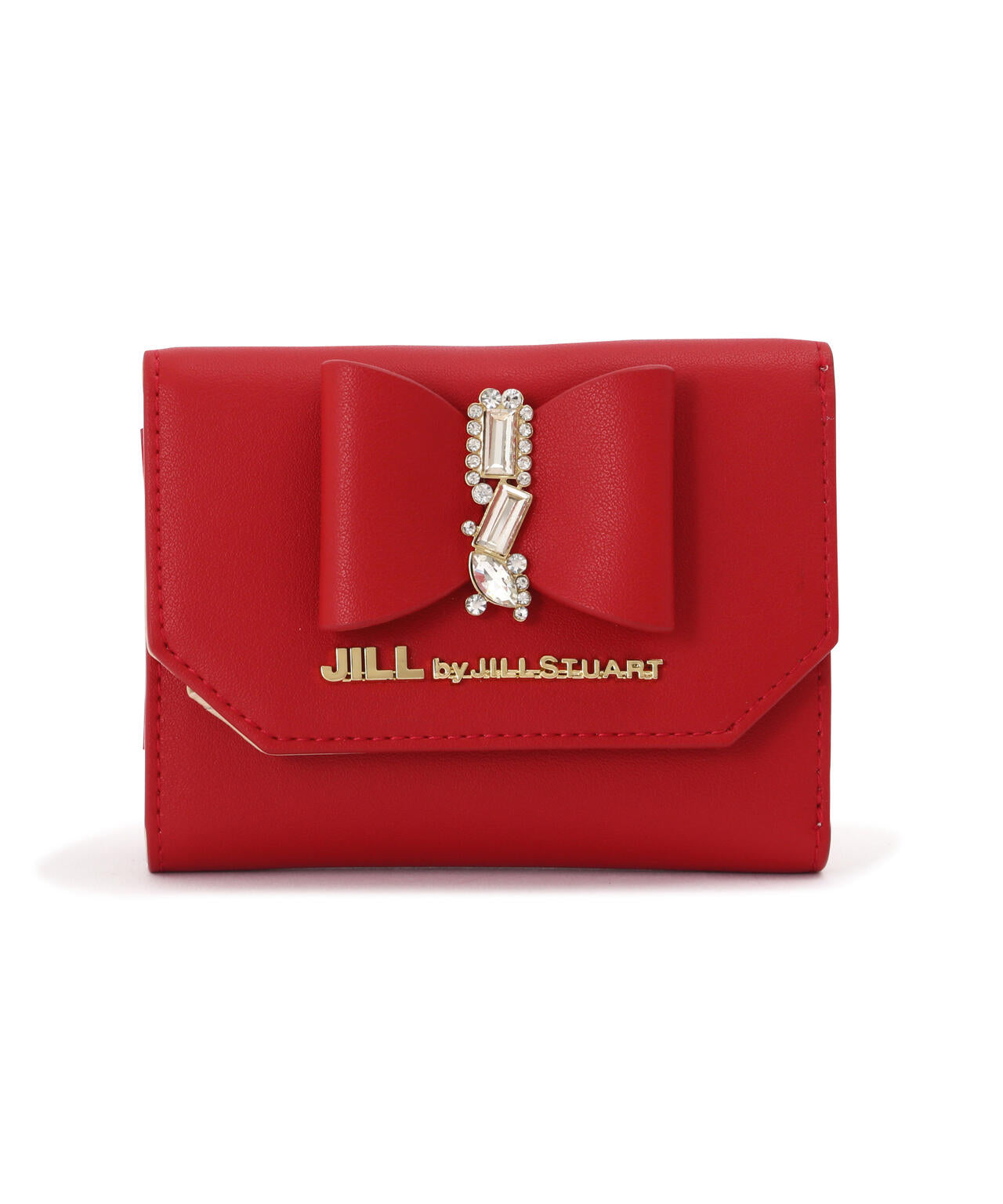 きらめく装飾でリボンをデコレーションしたレディライクなミニ財布。スナップボタン開閉でコインケース、紙幣とカード類を入れられる便利なデザインです。小さいバッグの中に入れやすい三つ折りのコンパクトなサイズなので、すっきり持ちたい方にもお勧めです。※撮影時照明の関係により、色味が違って見える場合がございます。