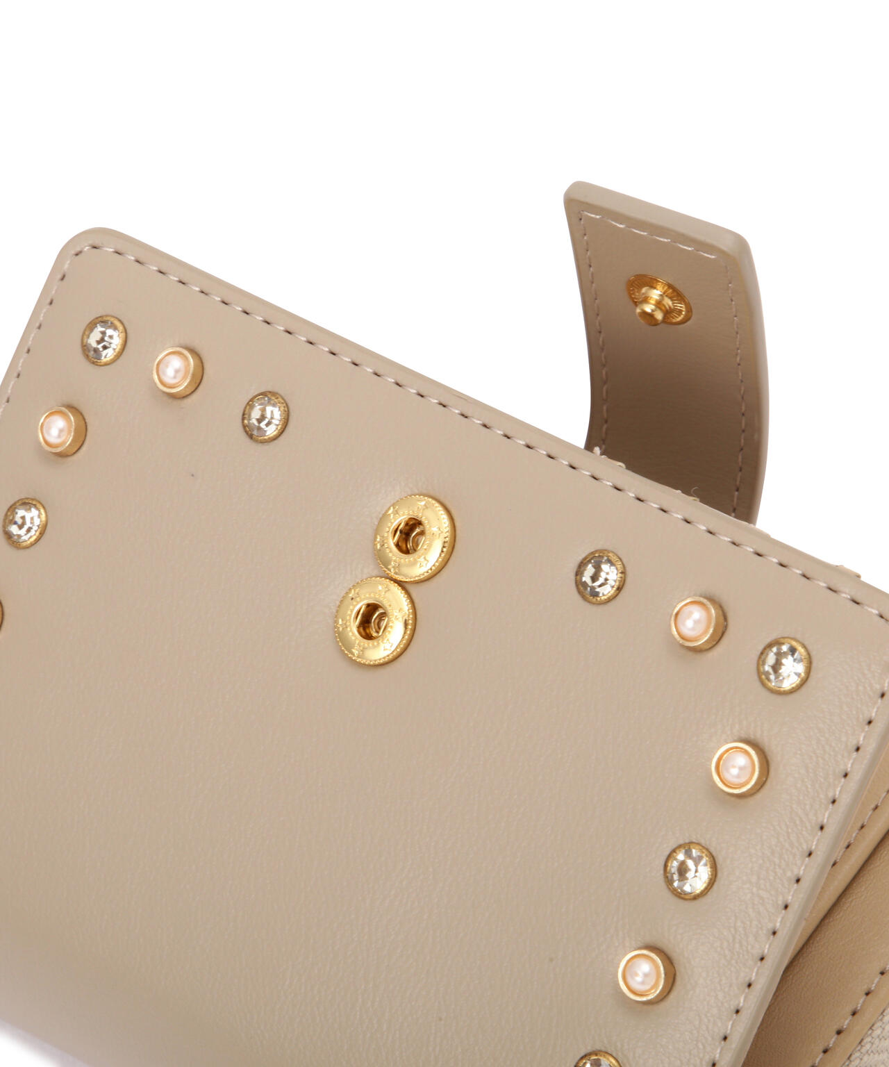 JILL by JILL STUARTのパールラインウォレット。落ち着いたカラーに、パール&スタッズをあしらった品の良いディテールがポイント。バッグの中にコンパクトに収納できる便利な仕様。スナップボタン開閉でカード類・お札入れ、コの字ファスナー部分はコイン入れです。※撮影時照明の関係により、色味が違って見える場合がございます。