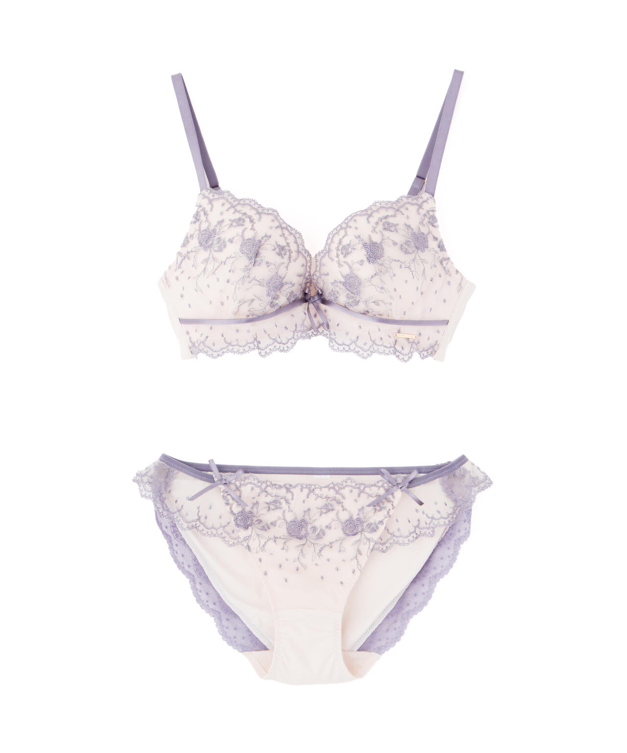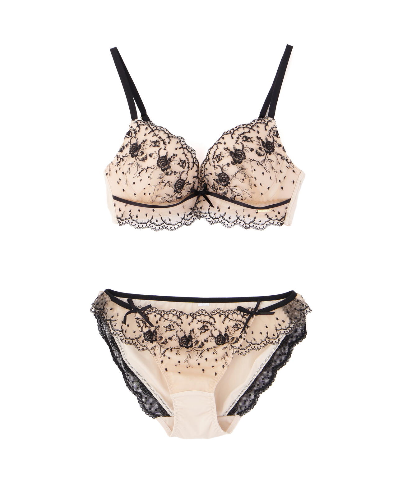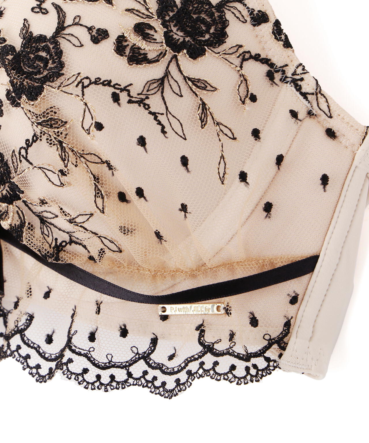 「PEACH JOHN×JILL by JILL STUART」コラボレーション第二弾!こちらは3サイズ展開のブラジャー&ショーツのセットです。Pサイズ:「ブラC65×ショーツS」Sサイズ:「ブラC70×ショーツM」Mサイズ:「ブラD70×ショーツM」となります。ドット×小花レースが可愛らしいエンブロイダリーレースを使用したデザイン。スカラップ部分は、葉っぱや小花で構成されたアーチがアクセント。カップとアンダーのレースはギャザーを寄せているので、フェミニンな表情に見せてくれます。※撮影時照明の関係により、色味が違って見える場合がございます。