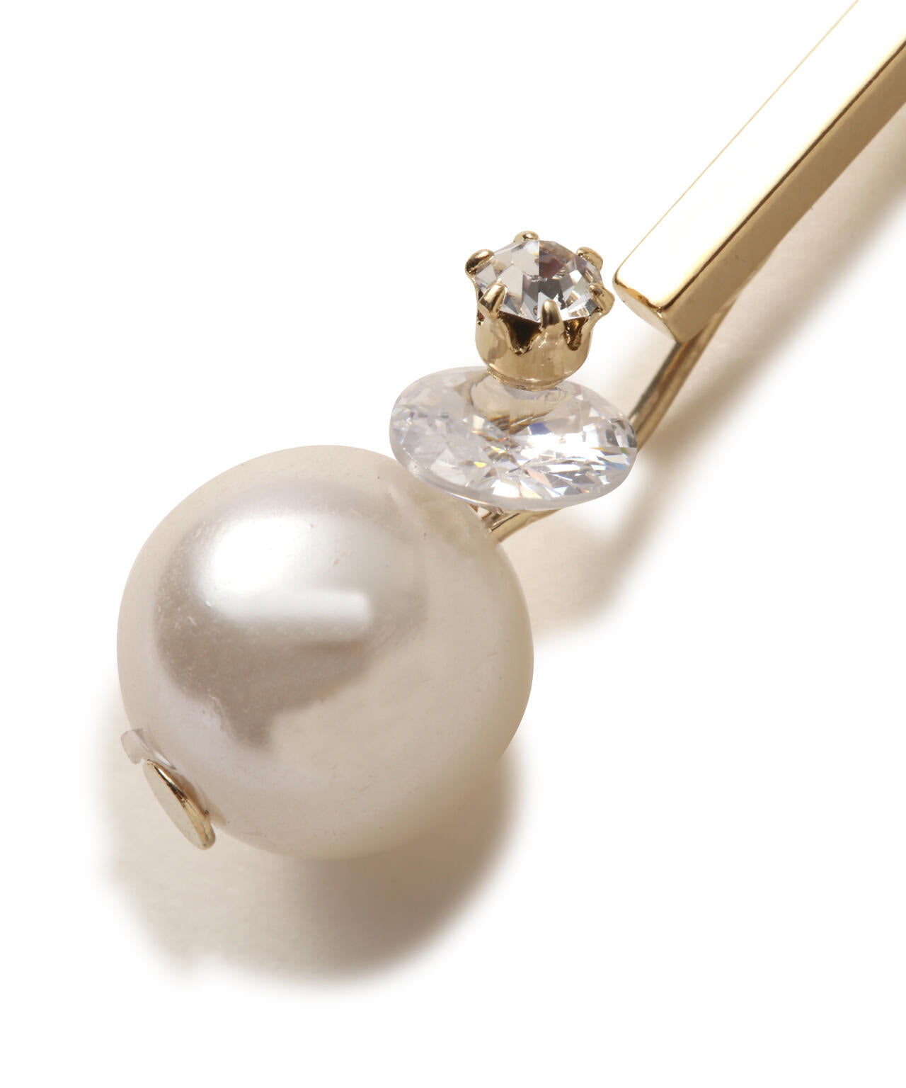 耳元で揺れるドロップパール調が女性らしいピアス。ドロップパール調とIラインパーツの組み合わせで、品よく映るデザインです。デイリーはもちろん、お呼ばれなどのキレイめシーンにもオススメのアクセサリーです。※撮影時照明の関係により、色味が違って見える場合がございます。