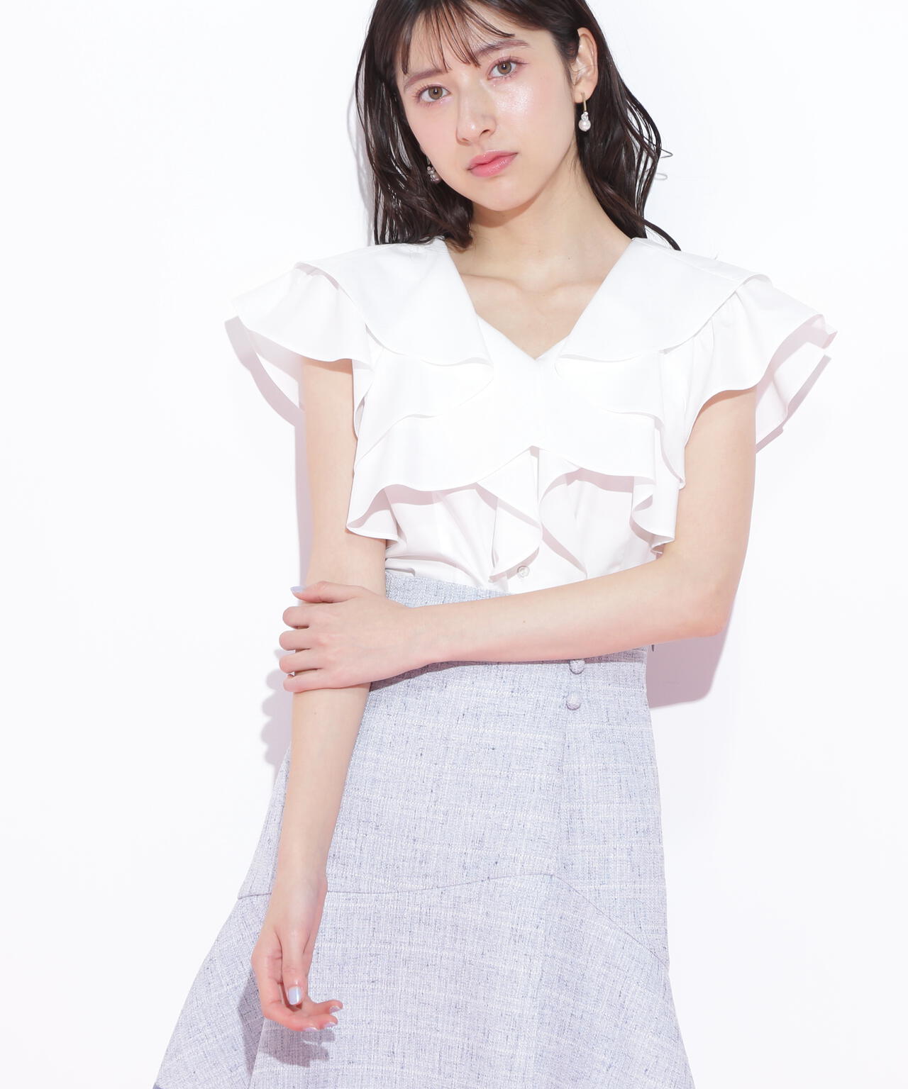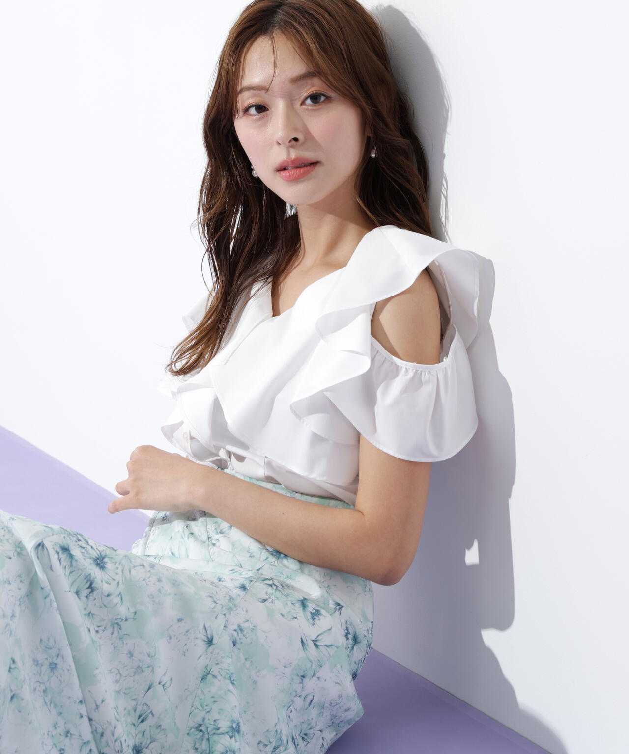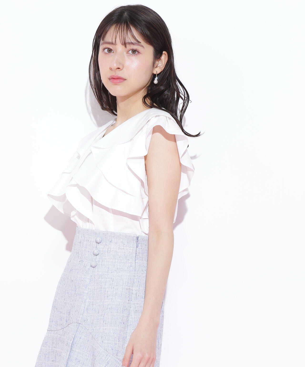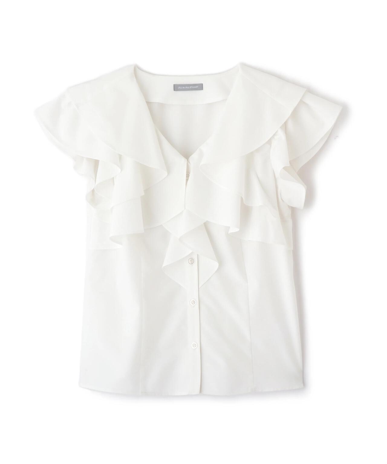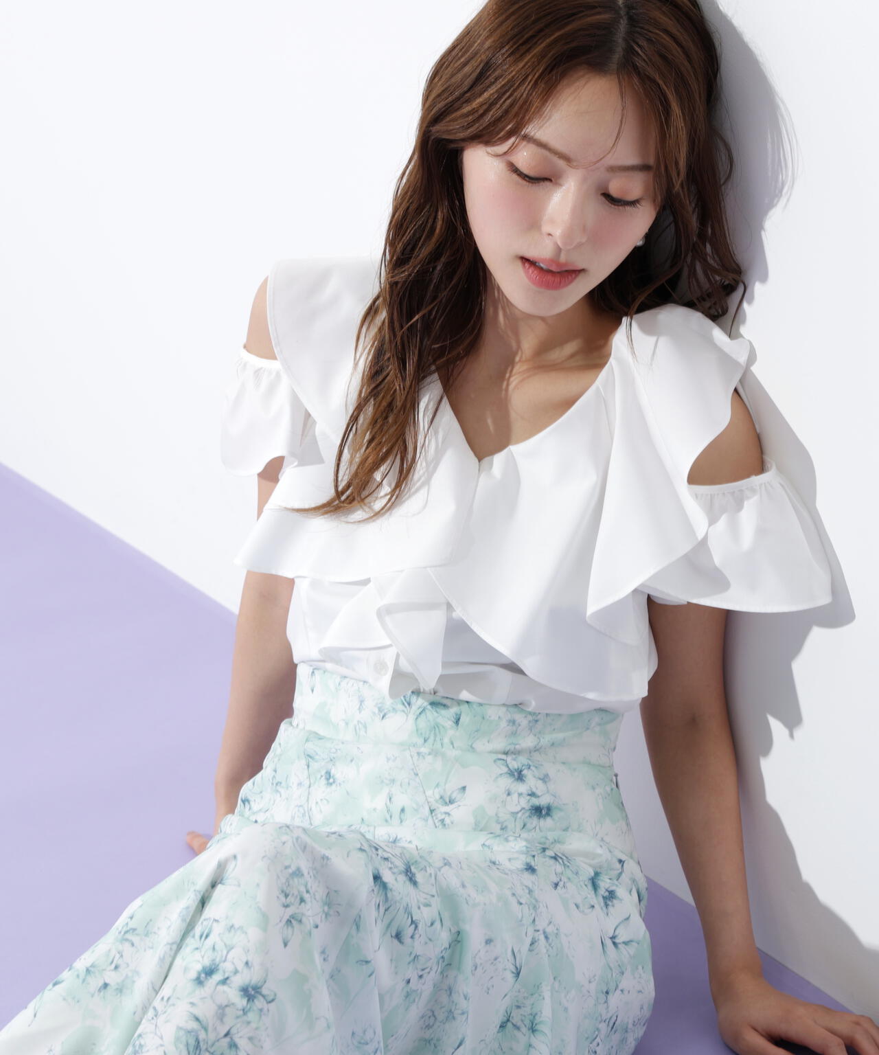 綿タッチで肌離れの良い素材を使用したフリルブラウス。肩のボタンでフリル袖を外し、肩開きデザインにも着られる2wayデザインです。軽量ながらも透け感がなく、甘すぎないフリルデザインのため、デニムはもちろん、フラワープリントフレアスカート(店舗商品番号125-5220003)とのコーディネートもオススメです。※撮影時照明の関係により、色味が違って見える場合がございます。