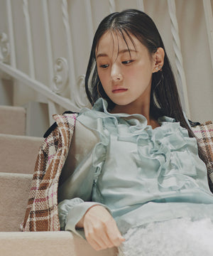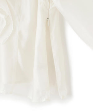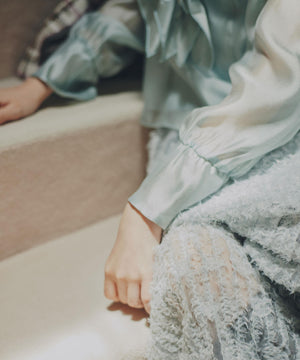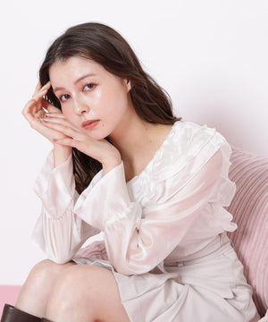 ボリュームのあるフリルが華やかなブラウス。光沢のあるシアー素材を使用、身頃は裏地付きです。袖口はゴム仕様なので、腕まくりをすると袖丈の長さ調節可能。秋冬トレンドのブラウン系のボトムスにも合うカラーを揃えています。※撮影時照明の関係により、色味が違って見える場合がございます。