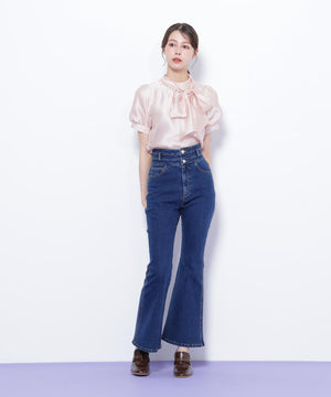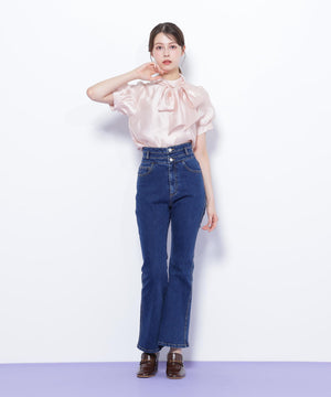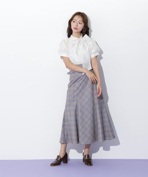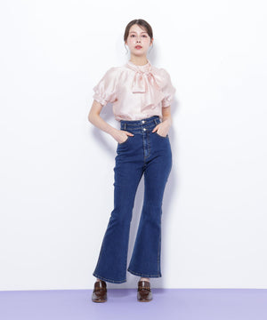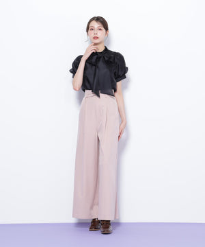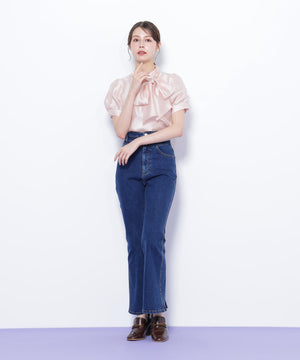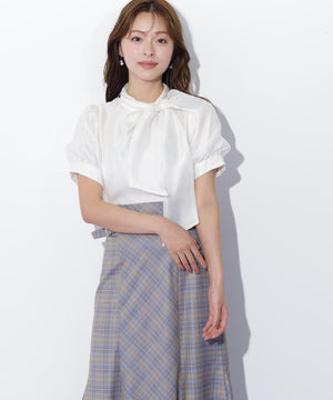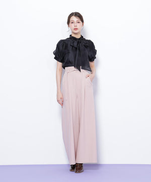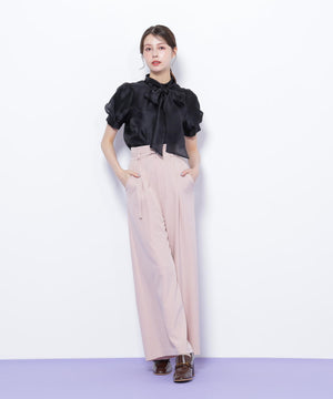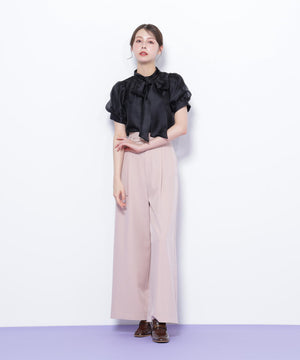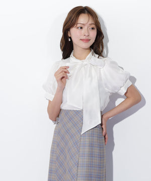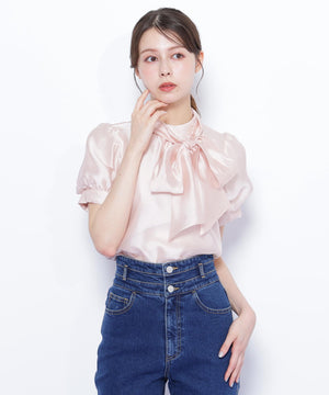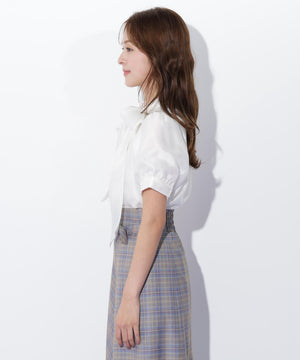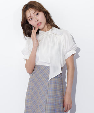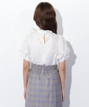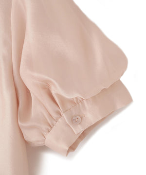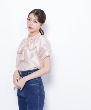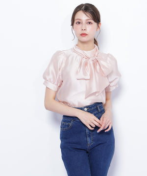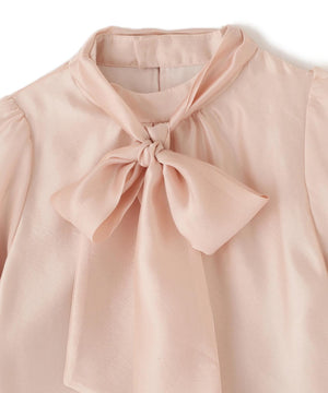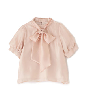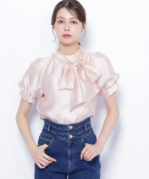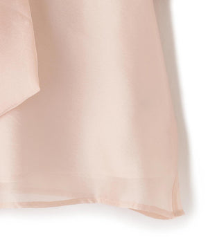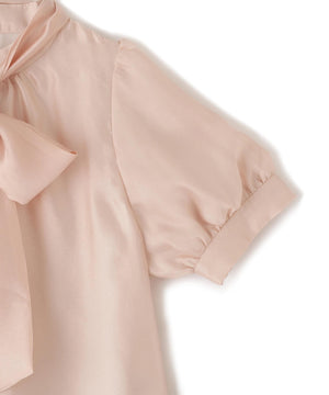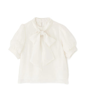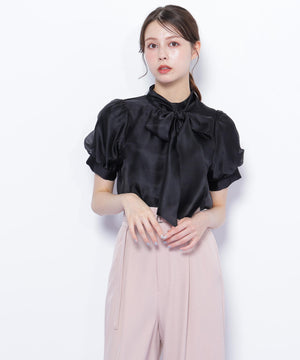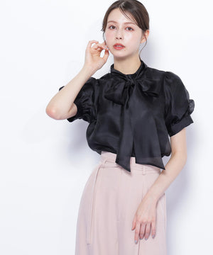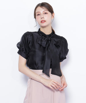 光沢感がリュクスな印象のボウタイブラウス。繊細な光沢感の柔らかく薄手の柔らかいオーガンジーを使用しています。総裏地仕様のため透けすぎず、上品な着こなしが叶います。袖は程よいボリュームを持たせたパフスリーブが女性らしく、シンプルながらコーディネートの主役としても、レイヤードアイテムとしても活躍。存在感のあるふんわりとしたボウタイは取り外しできます。※撮影時照明の関係により、色味が違って見える場合がございます。