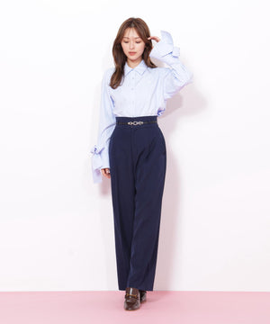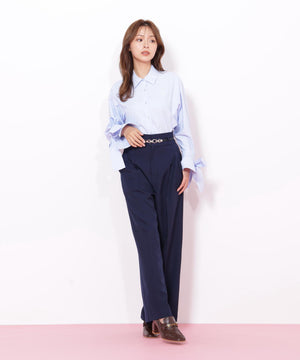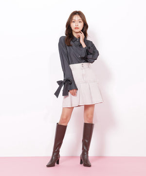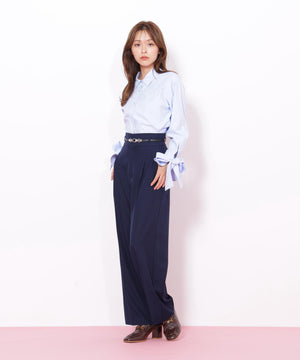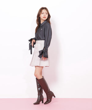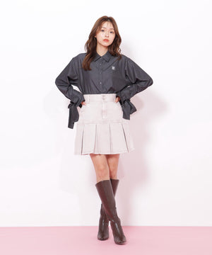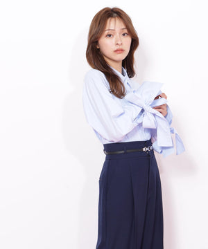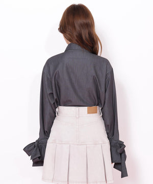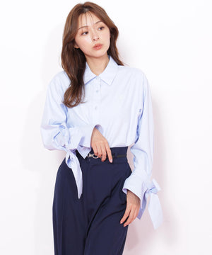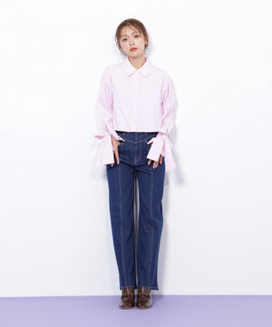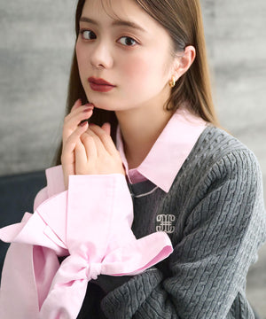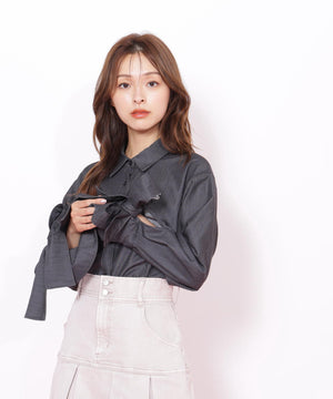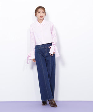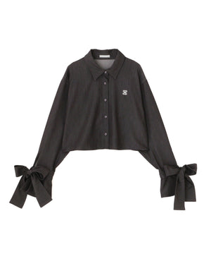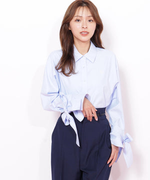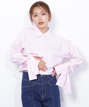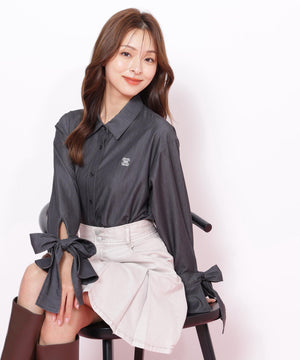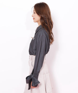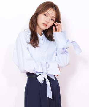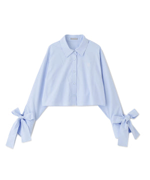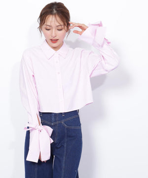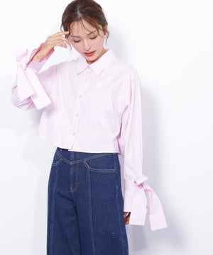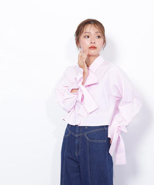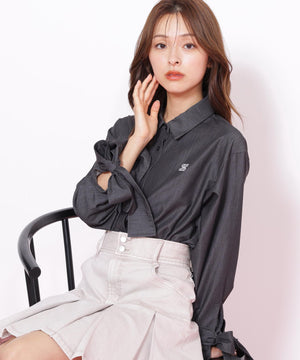 リボンカフスが視線を誘うシャツブラウス。1枚着はもちろん、ジャケットを羽織り、袖口からちらっとリボンをのぞかせるのもおすすめです。胸元にはJモチーフの刺しゅう入り。トレンドのクロップド丈なので、ニットやスウェットとのレイヤードも楽しめます。さらりとした薄手のデニムライクなグレーと、オックス調素材で発色がキレイなピンク・ブルーの3色展開です。※撮影時照明の関係により、色味が違って見える場合がございます。