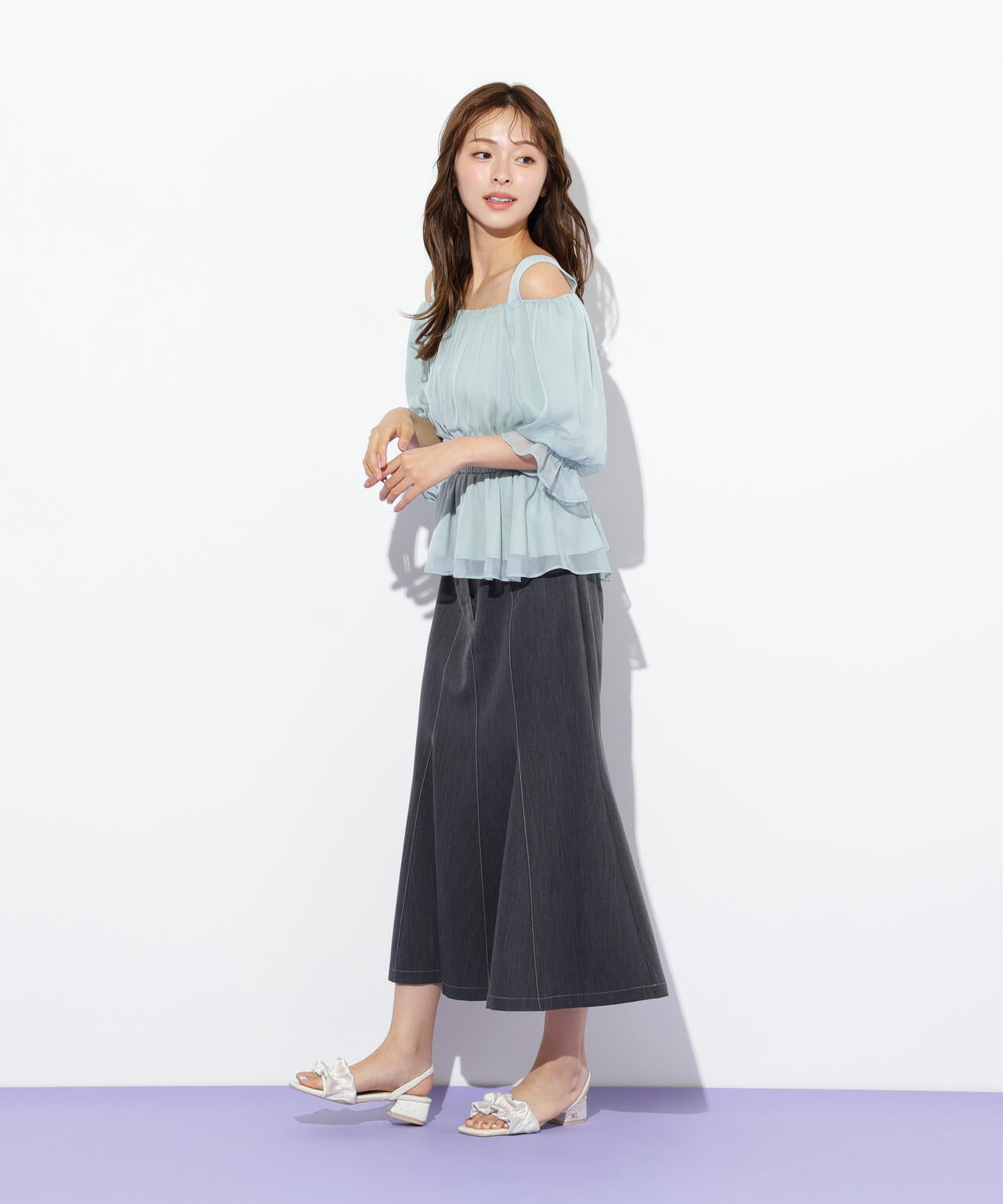 落ち感があり女性らしいシルエットを叶えるマーメイドスカート。程よい厚みのあるドライタッチな素材を使用しているので、インナーのあたりがでにくいです。ストレッチが効いているため、動きやすさとシワになりにくさも両立。コルセット風のウエスト切り替えで細見えし、後ろウエストは取り外しできるビッグリボン付きで、気になるヒップまわりをカバーします。これからの季節、Tシャツや楊柳オフショルパフブラウス(店舗商品番号1255210008)合わせがおすすめです。※撮影時照明の関係により、色味が違って見える場合がございます。