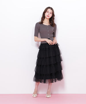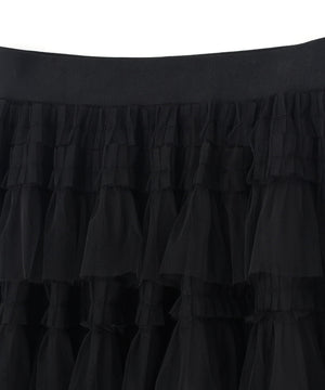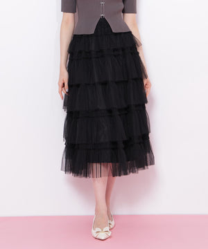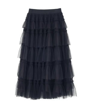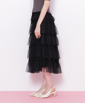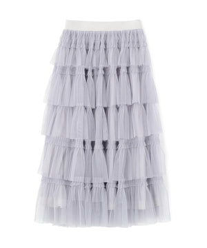 甘さと存在感を両取りしたボリュームのあるティアードスカート。軽やかなチュール素材を何層にも重ね、動くたびにふんわりと広がるシルエットです。Tシャツと合わせてカジュアルダウンしたり、ブラウスやニットを合わせたフェミニンコーデもおすすめです。※撮影時照明の関係により、色味が違って見える場合がございます。