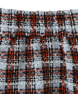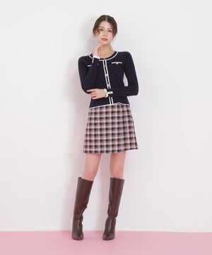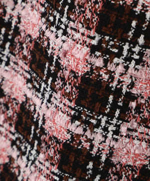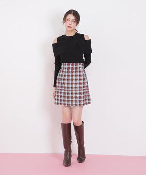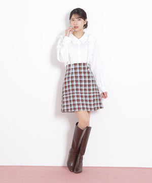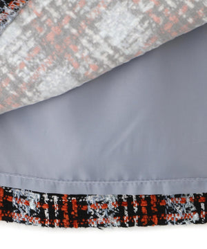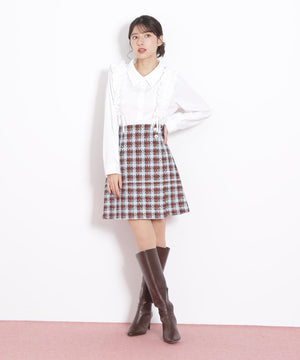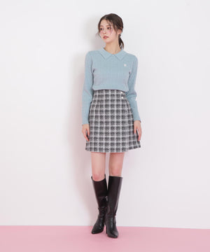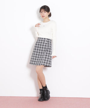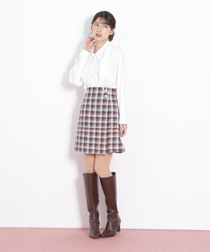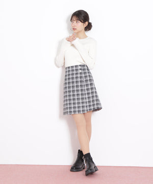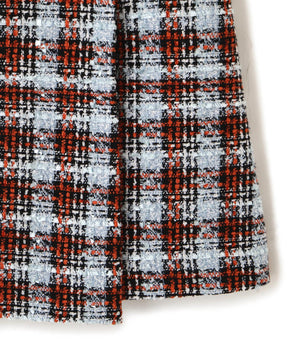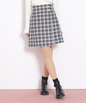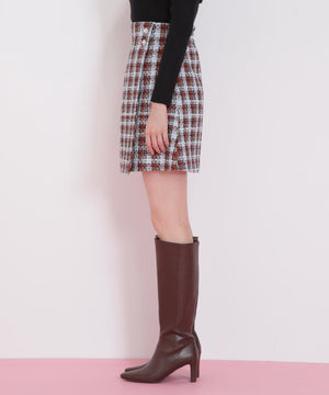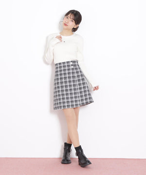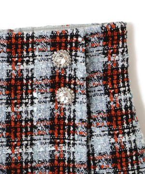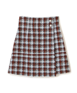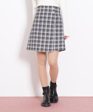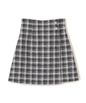 柔らかいツイード生地を使用したラップデザインのキレイめミニスカート。ハイウエスト設定に、キラキラ艶めくビジュー調ボタンがポイントです。ニットやカーディガンとも相性抜群。冬はダウンやショートアウター合わせもおすすめです。※撮影時照明の関係により、色味が違って見える場合がございます。