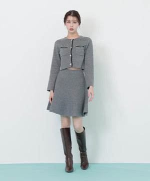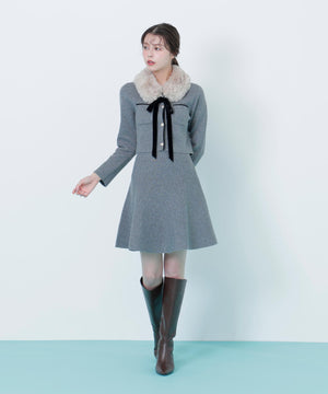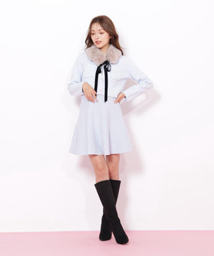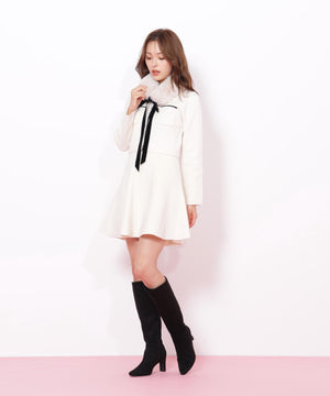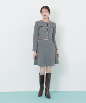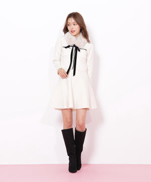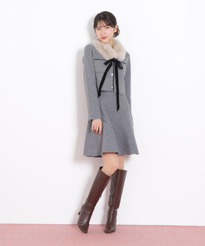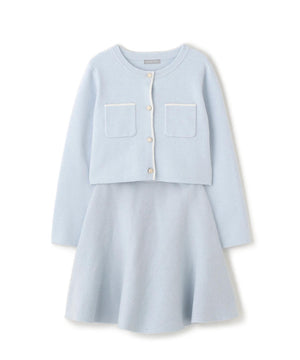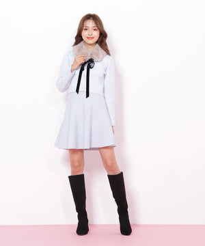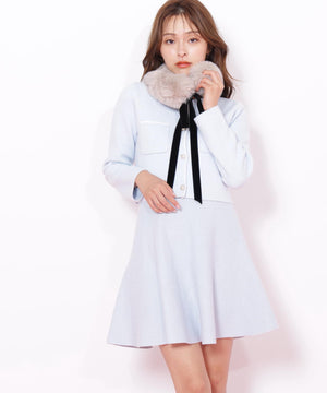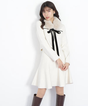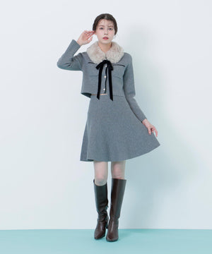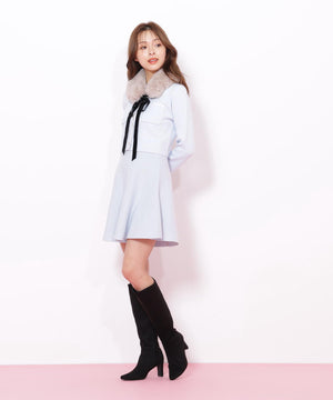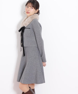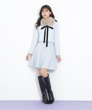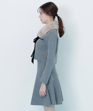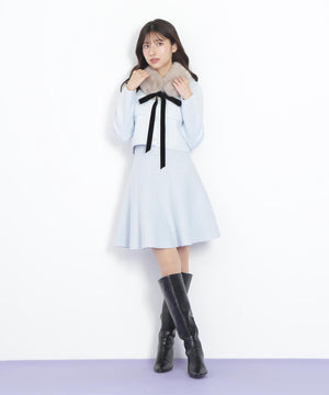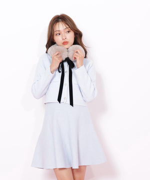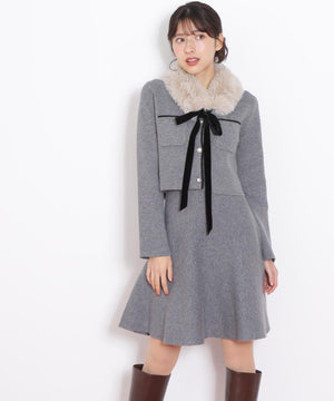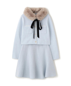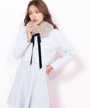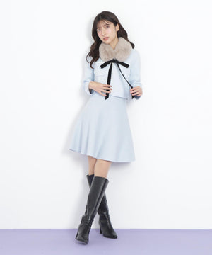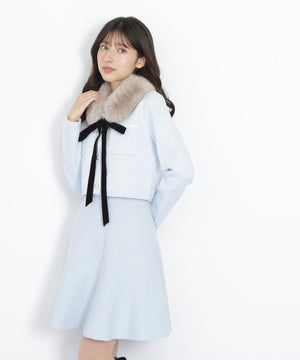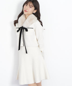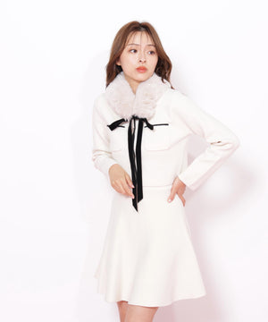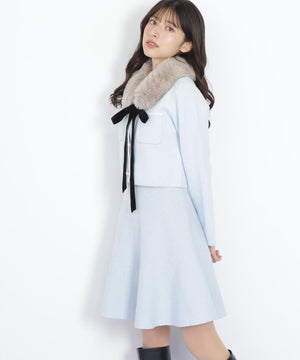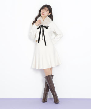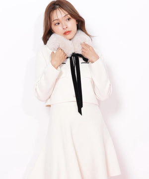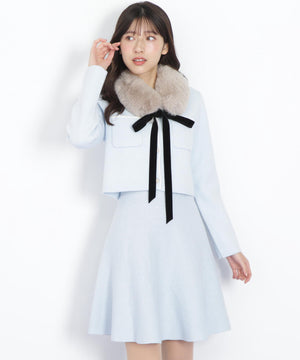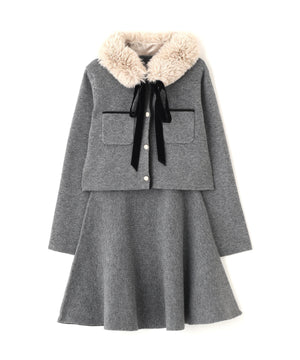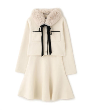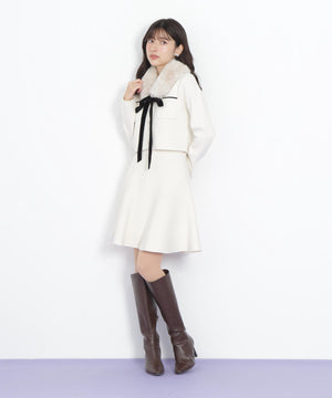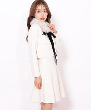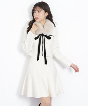 膨らみのある糸を使用したノーカラーニットジャケットとフレアミニスカートに、フェイクファーのティペットが付いているスペシャルSET。ニットジャケットは単品使いもできます。スカートはウエストの内側にゴムを沿わせているのでフィットし、キレイなフレアシルエットを叶えます。ふわふわのフェイクファーティペットはボリュームがあり、品の良いベロアリボンでシーズンムードを引き立てます。※撮影時照明の関係により、色味が違って見える場合がございます。