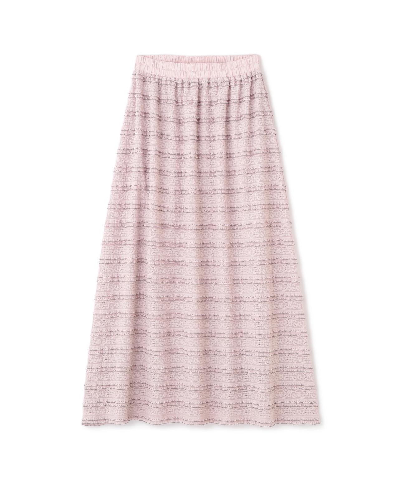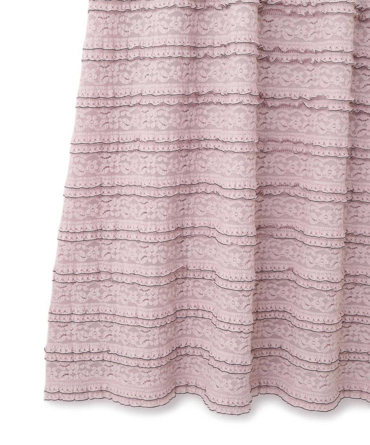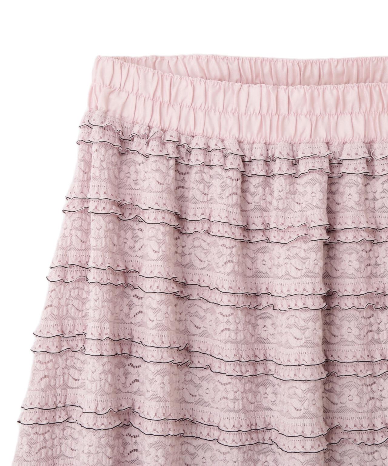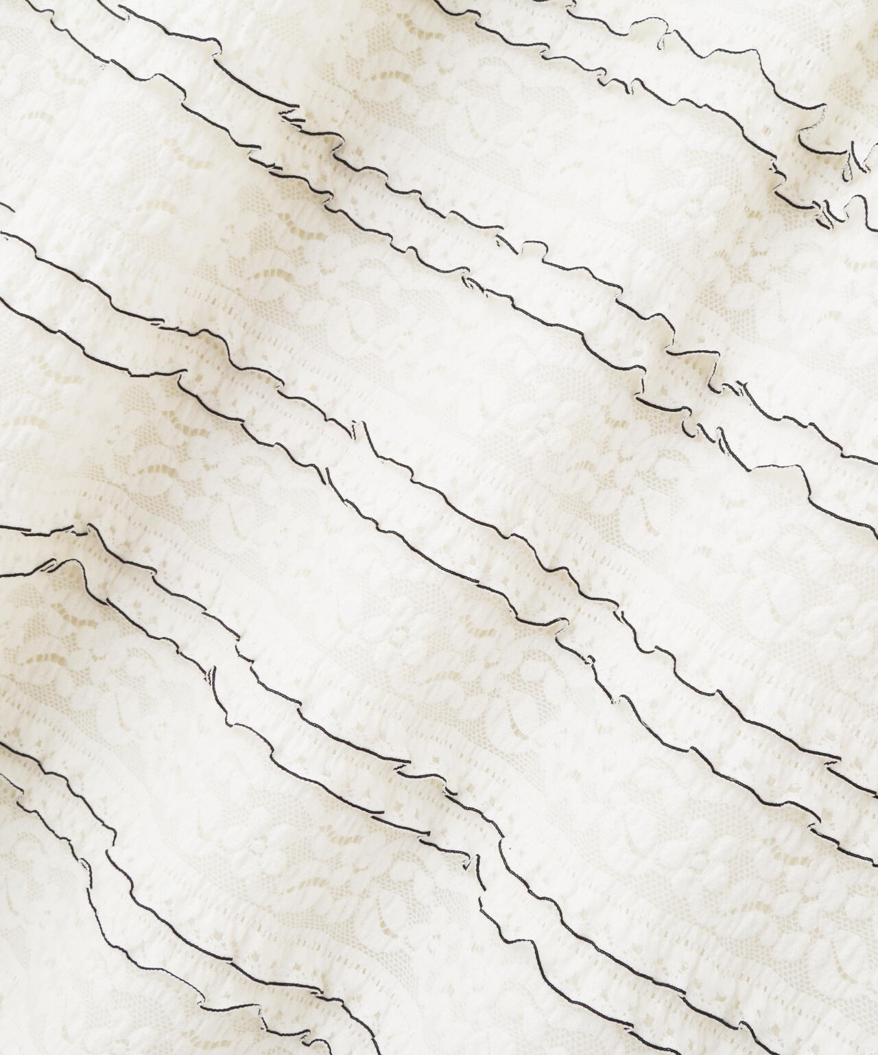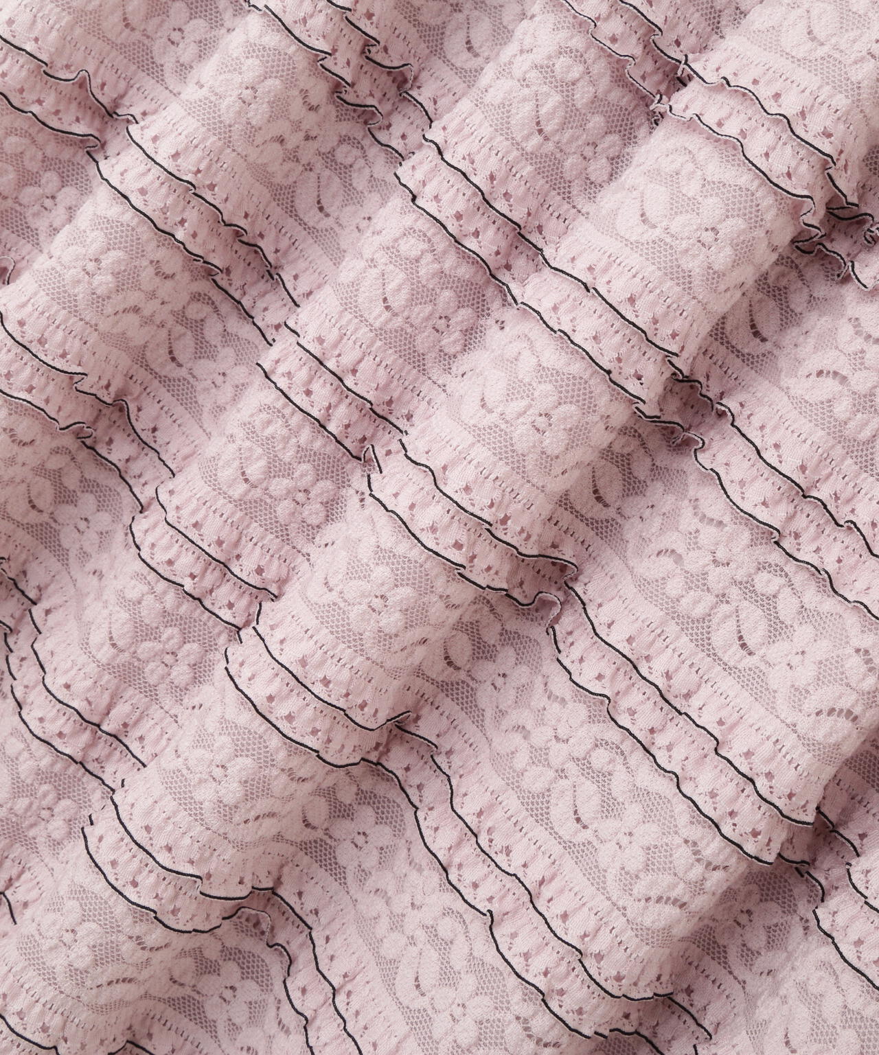 バイカラーのラインが効いたフリルレースのトップスとスカートのセットアップ。ストレッチレースで動きやすく、涼しげで肌離れも良い素材を使用しています。ペプラムデザインのトップスは、単品使いでパンツとの着回しも可能。スカートのウエストはゴム仕様でラクなはき心地です。また、ウエストには微光沢素材を使っているため、単品で使う時にもウエストがすっきり見えるデザインです。※撮影時照明の関係により、色味が違って見える場合がございます。