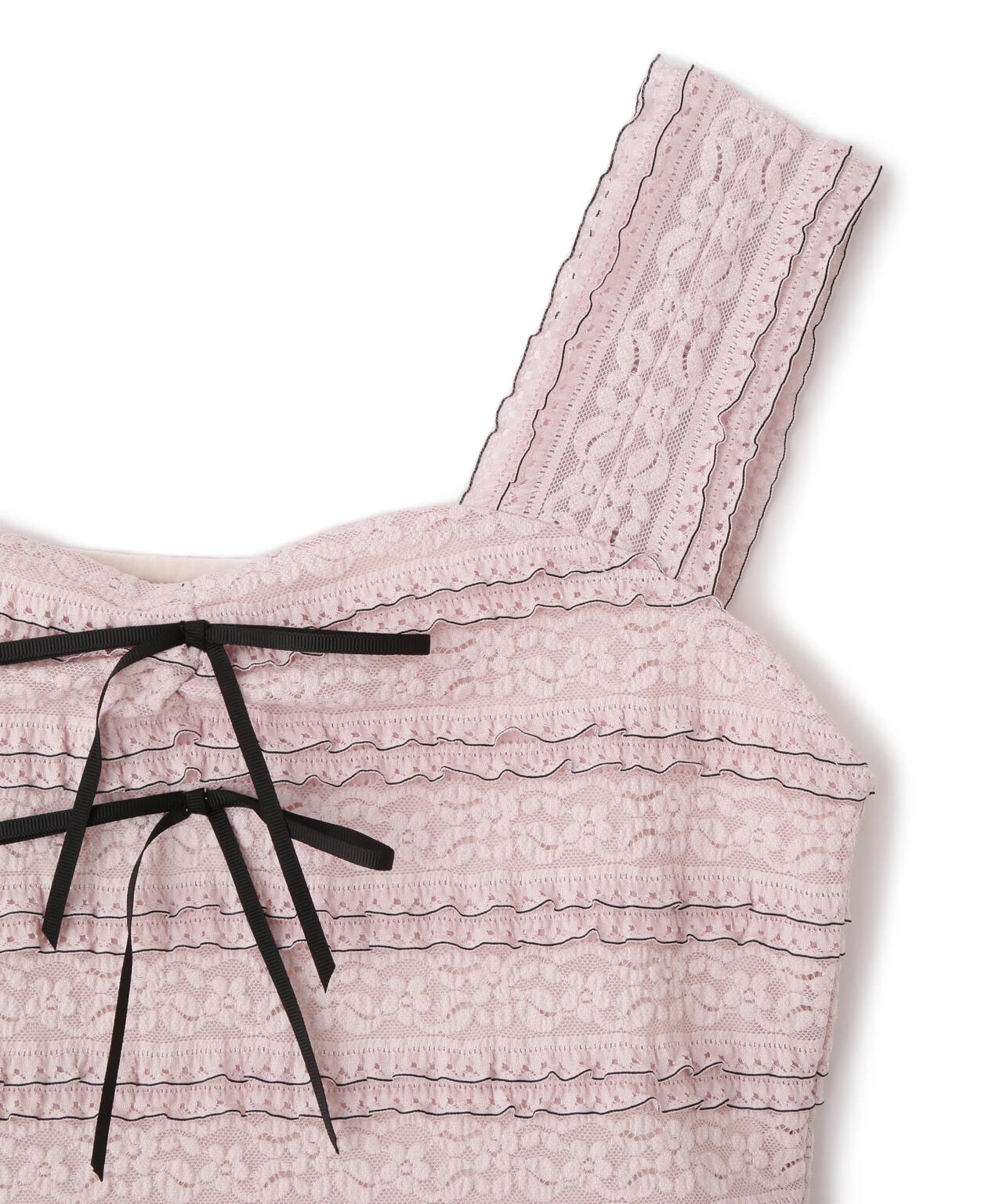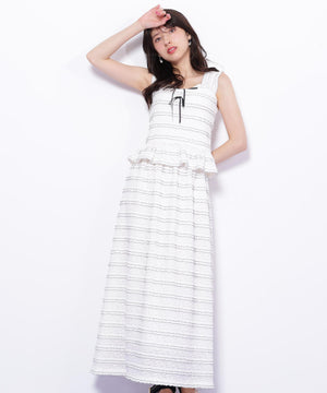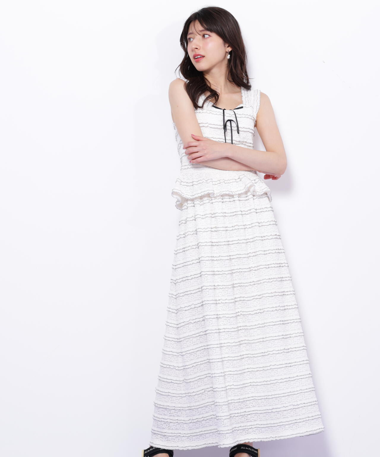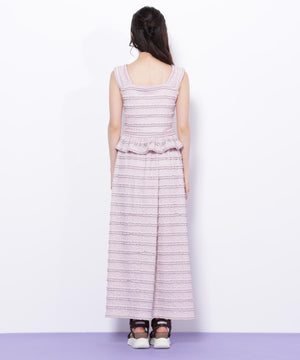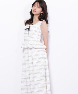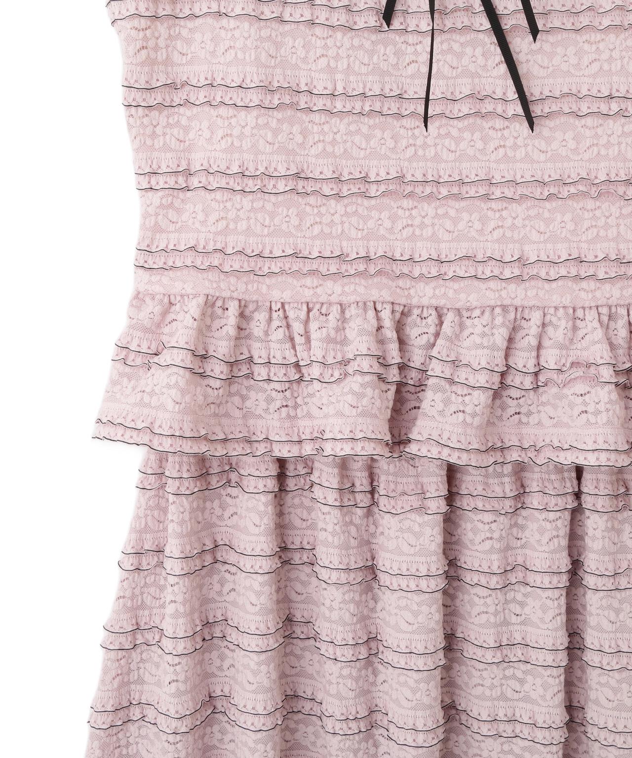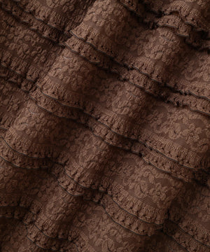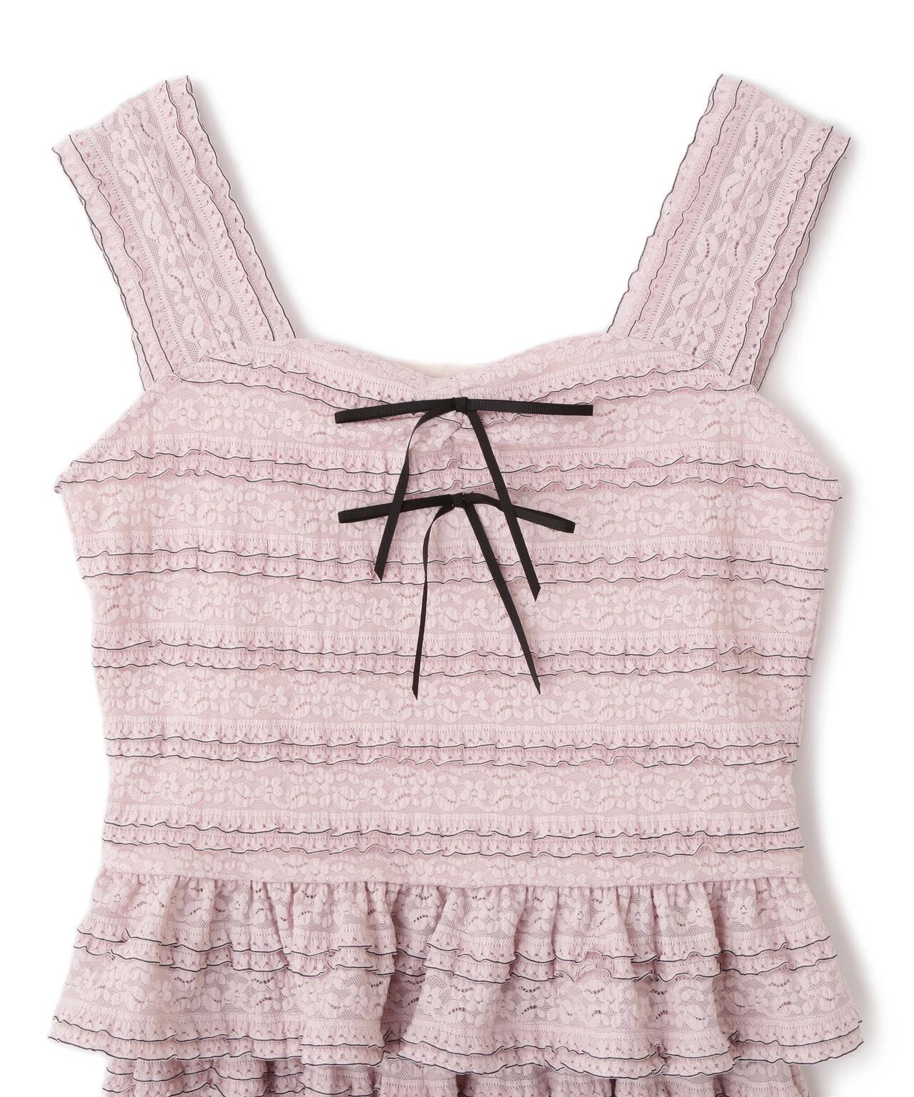 バイカラーのラインが効いたフリルレースのトップスとスカートのセットアップ。ストレッチレースで動きやすく、涼しげで肌離れも良い素材を使用しています。ペプラムデザインのトップスは、単品使いでパンツとの着回しも可能。スカートのウエストはゴム仕様でラクなはき心地です。また、ウエストには微光沢素材を使っているため、単品で使う時にもウエストがすっきり見えるデザインです。※撮影時照明の関係により、色味が違って見える場合がございます。