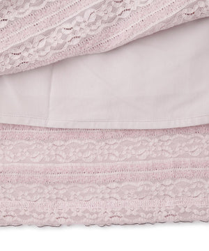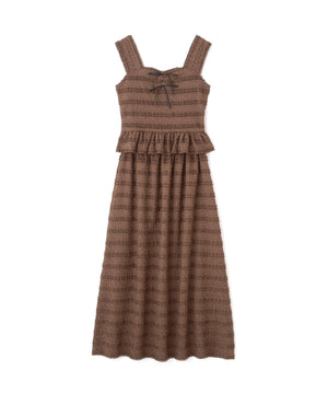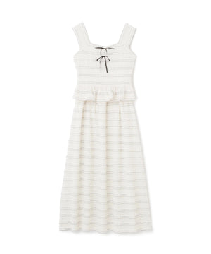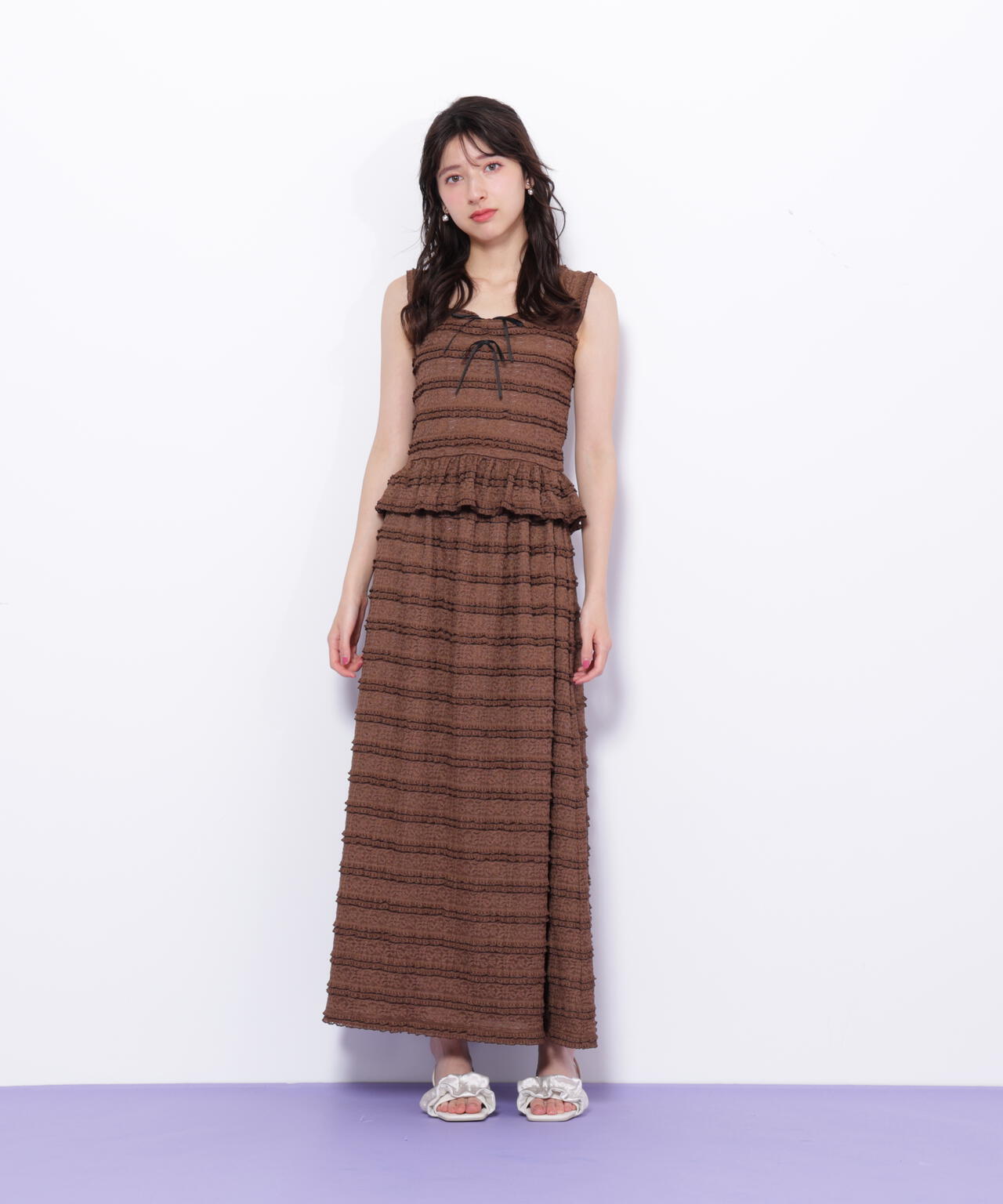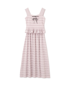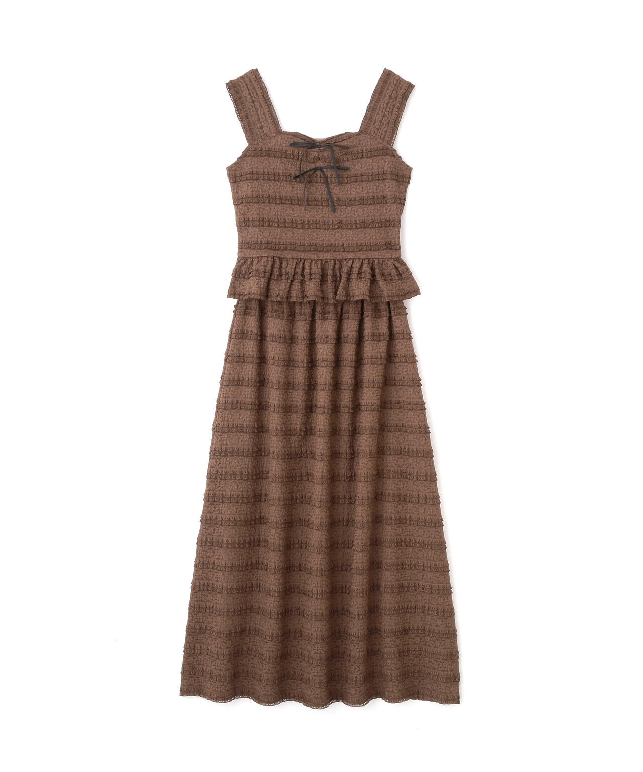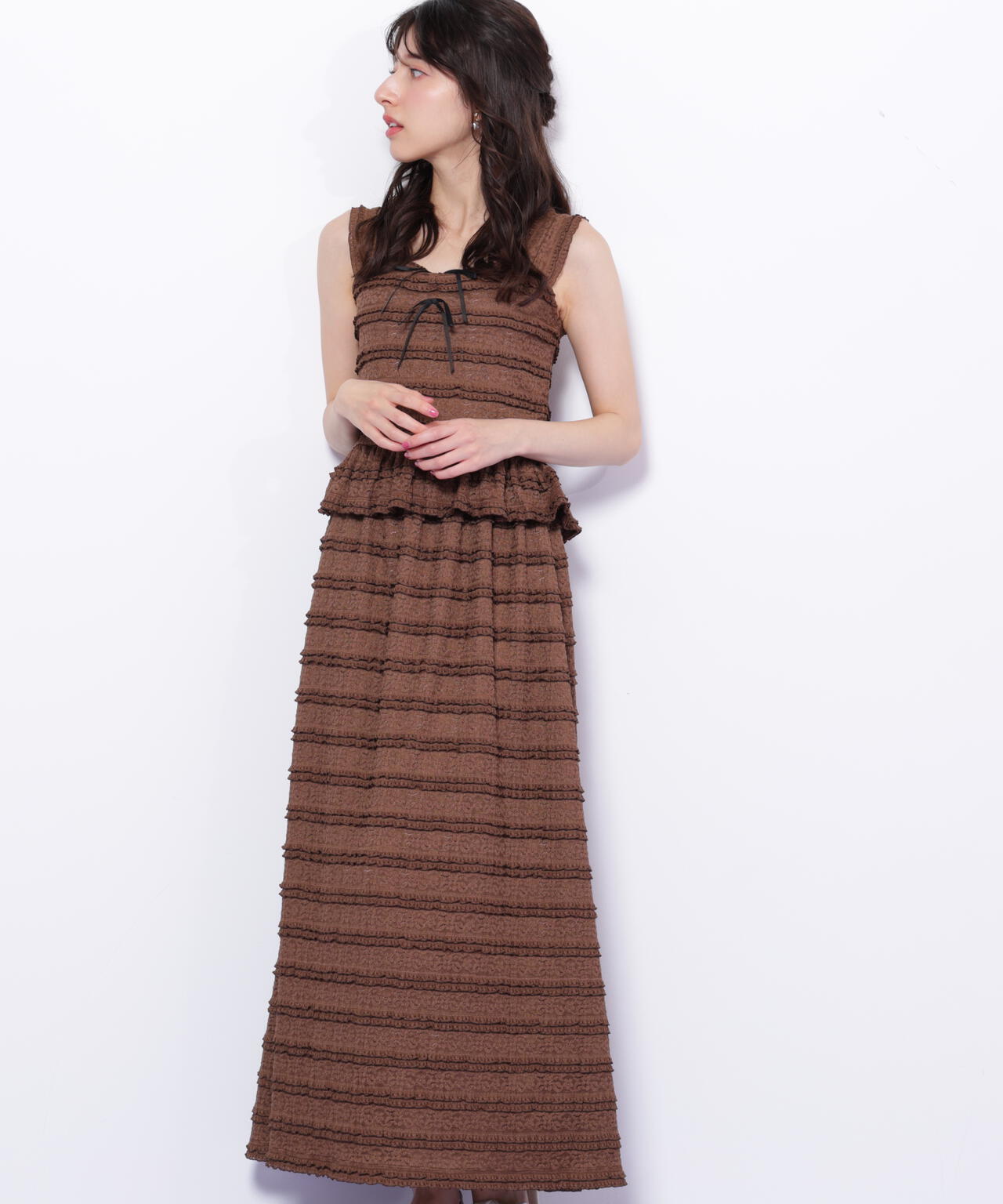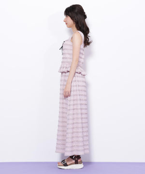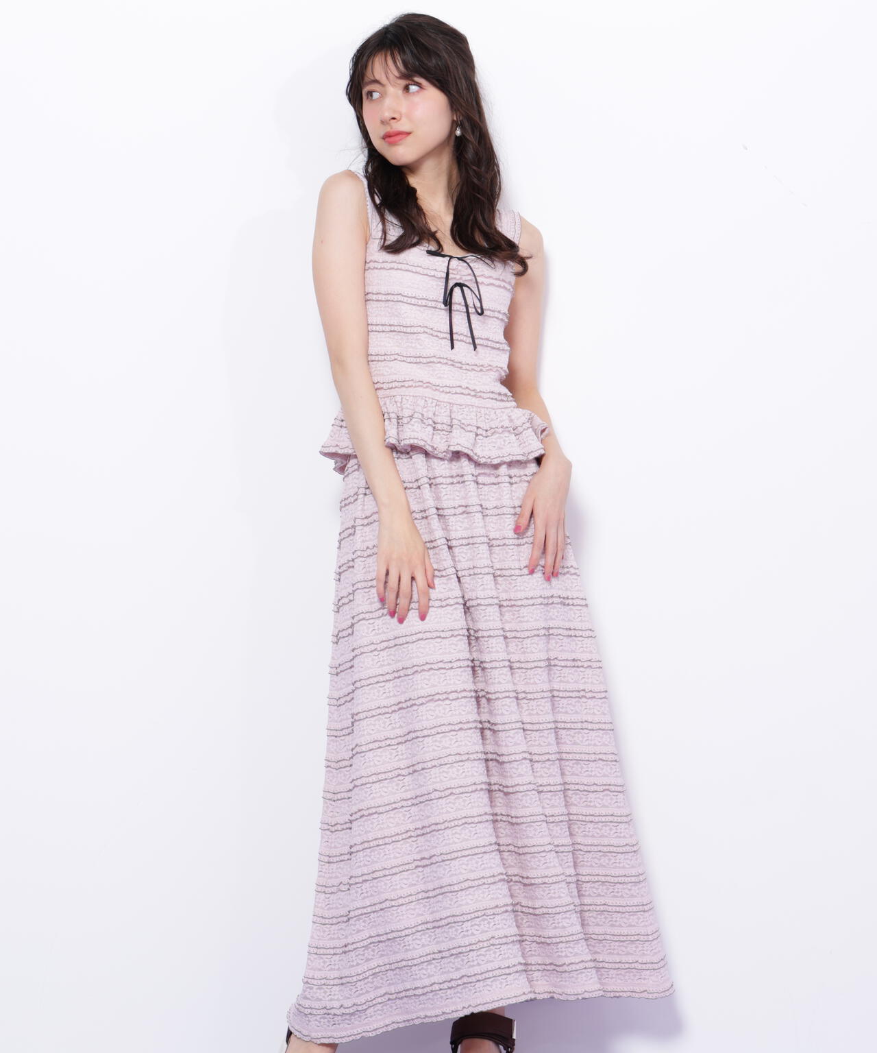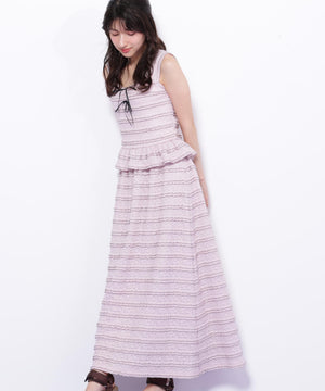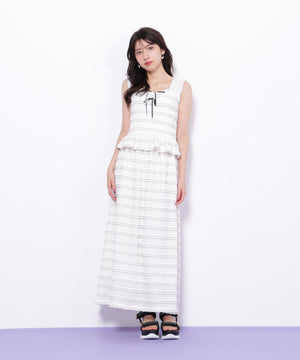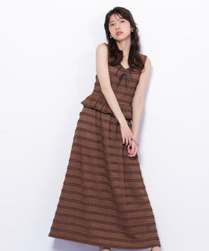 バイカラーのラインが効いたフリルレースのトップスとスカートのセットアップ。ストレッチレースで動きやすく、涼しげで肌離れも良い素材を使用しています。ペプラムデザインのトップスは、単品使いでパンツとの着回しも可能。スカートのウエストはゴム仕様でラクなはき心地です。また、ウエストには微光沢素材を使っているため、単品で使う時にもウエストがすっきり見えるデザインです。※撮影時照明の関係により、色味が違って見える場合がございます。
