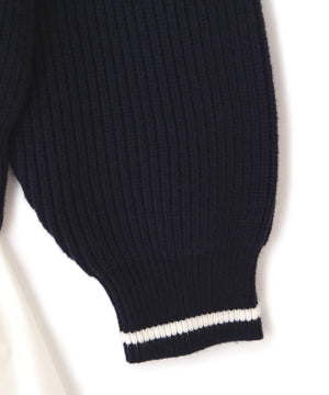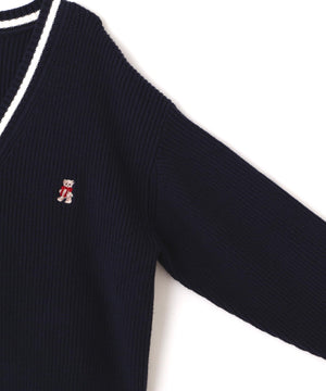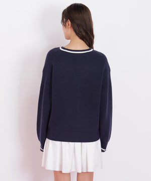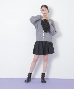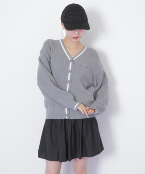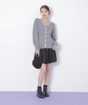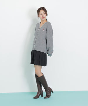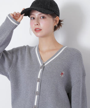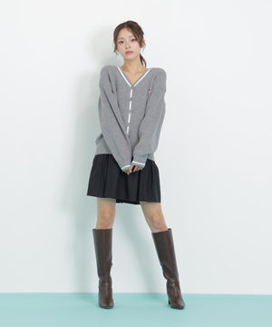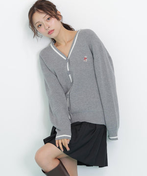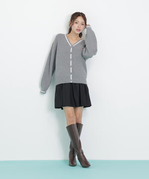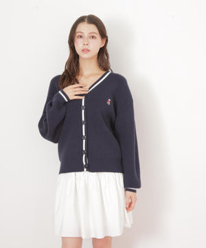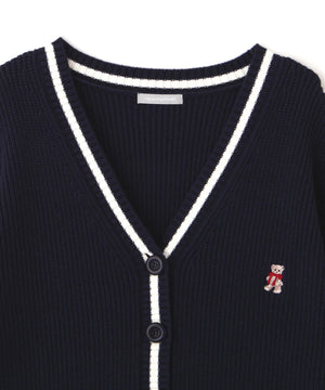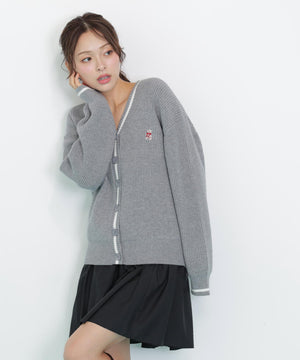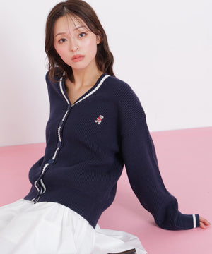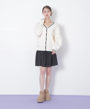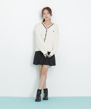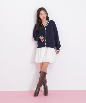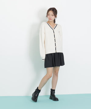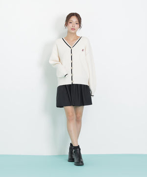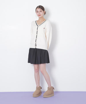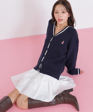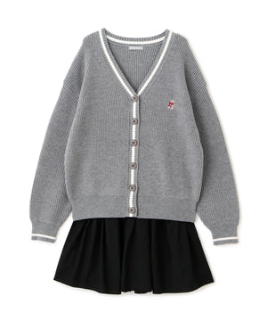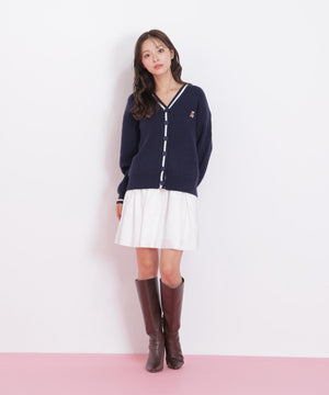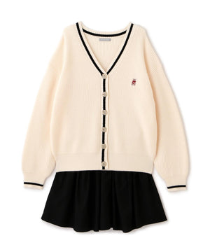 ミドルゲージの畦編みゆるニットカーディガンと布帛のティアードスカートのセット。単体でも使えるニットカーディガンは、オリジナルのベアモチーフの刺しゅうがワンポイントで入っています。配色ラインが効いた少しスクール感のあるデザインもアクセント。足元はロングブーツ合わせがおすすめです。※撮影時照明の関係により、色味が違って見える場合がございます。