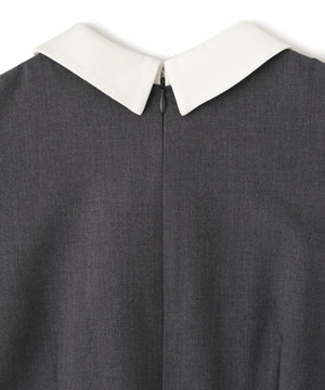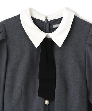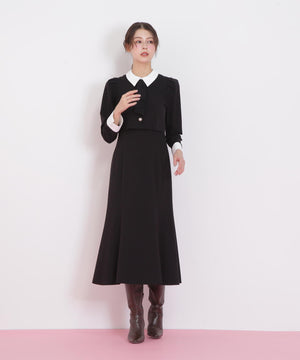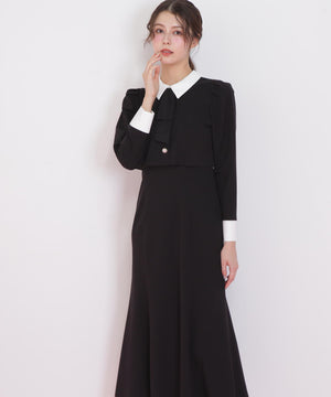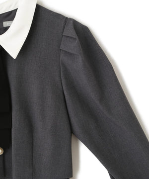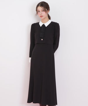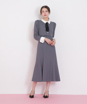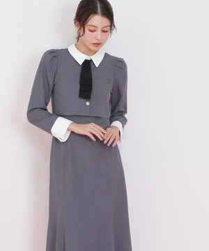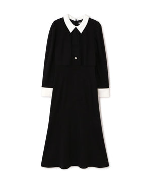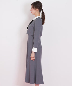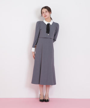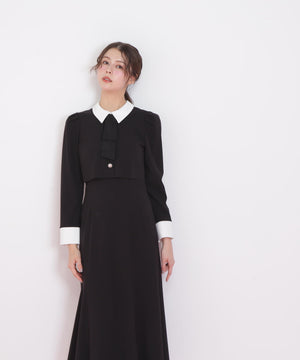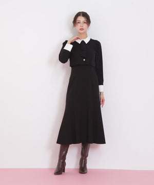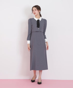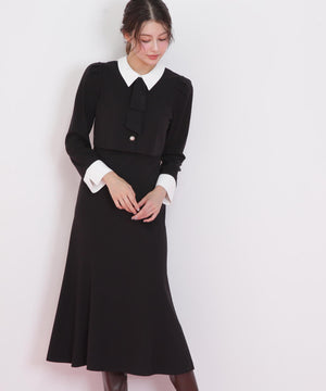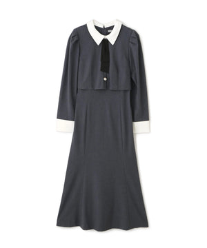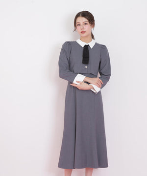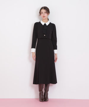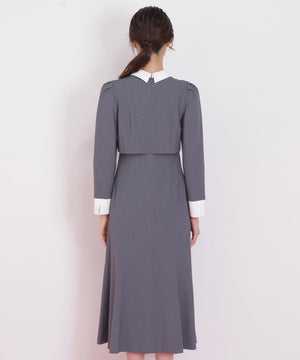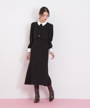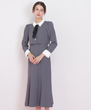 ジャケットをレイヤードしているように見えるデザインで白の襟やカフスがきちんと見えの上品な印象を与えるワンピースです。