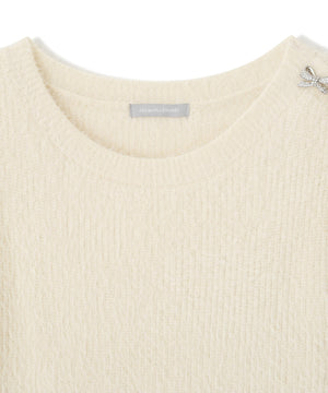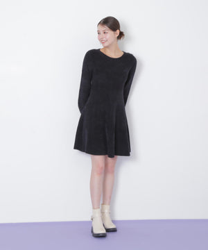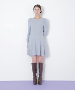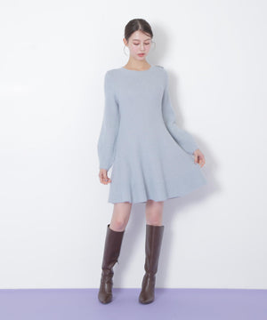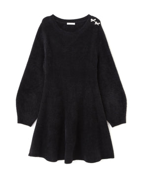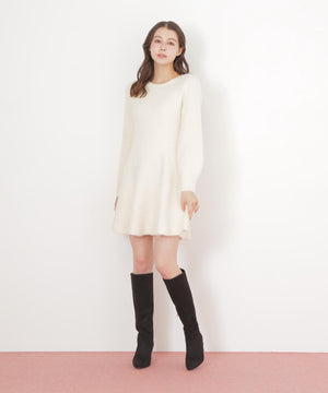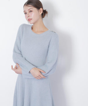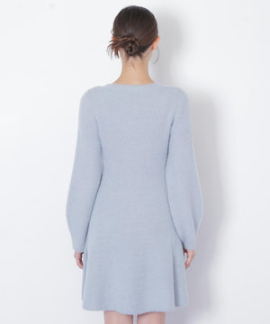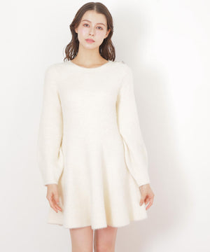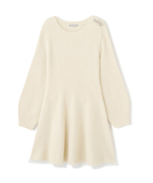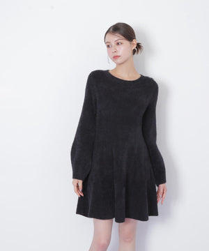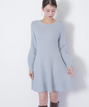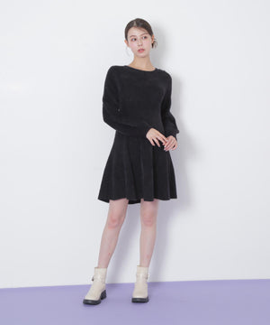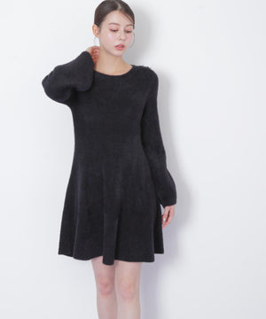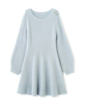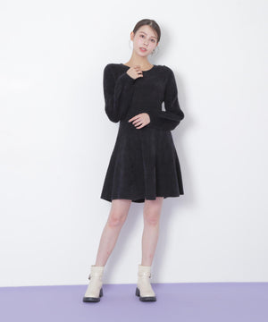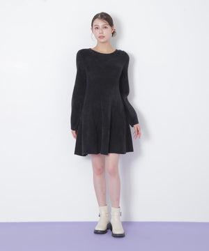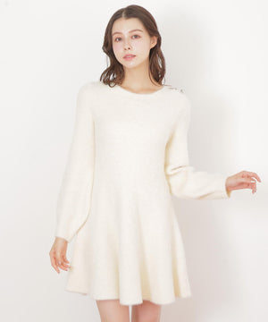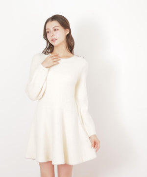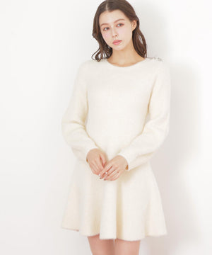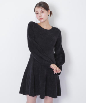 昨年人気だったミニワンピースのボタンデザインをアップデート!ショートフェザー糸と細いラメ糸を引きそろえており、上品なキラキラとふわふわ感がポイントです。ウエストまわりはすっきりと、裾はフレアが出るキレイなシルエットを演出します。足元はブーツ合わせがおすすめです。※撮影時照明の関係により、色味が違って見える場合がございます。