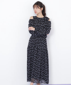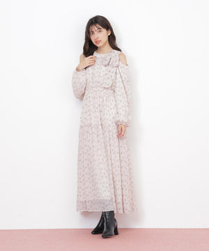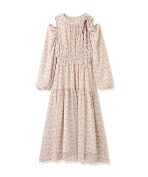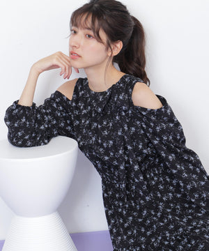 トレンドの小花柄プリントワンピース。肩のスリットで抜け感を出したデザインです。上品な開き具合が絶妙で、年末のイベントシーンにもおすすめ。首元はボウタイで華やかに演出。ふわふわのニットカーディガンと相性バツグンです。※撮影時照明の関係により、色味が違って見える場合がございます。